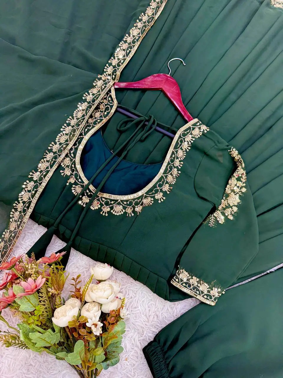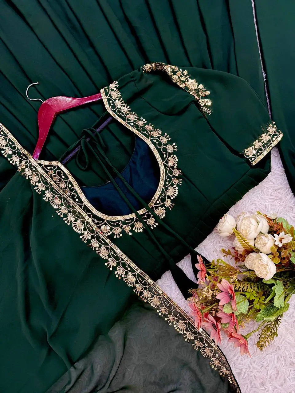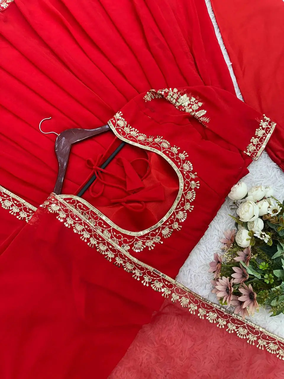 This designer Anarkali set is a perfect blend of grace and comfort, crafted from heavy faux georgette fabric. The top features exquisite embroidery on the neckline and sleeves, paired with a soft heavy micro cotton inner for a comfortable fit. Designed in a flattering length of 47–48 inches, the Anarkali flows beautifully for an elegant look. The matching palazzo pant, made from breathable micro cotton with an elastic waistband, ensures ease of movement. The set is completed with a heavy faux georgette dupatta featuring a stylish lace border, adding a refined finish. Fully stitched and ready to wear, this ensemble is ideal for weddings, festive occasions, and special celebrations.