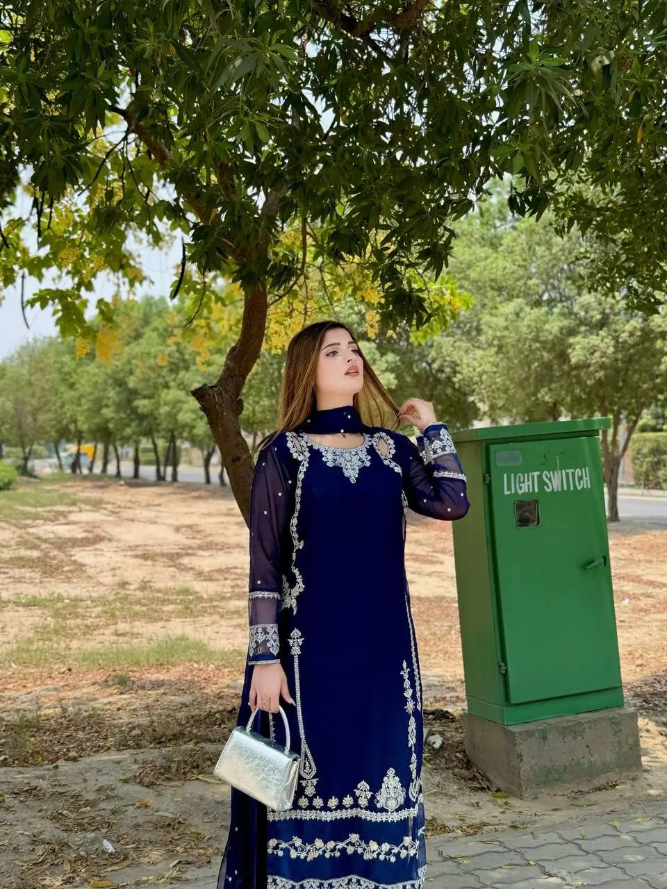 This stunning navy blue suit set is crafted from heavy faux georgette, beautifully embellished with heavy embroidery and sequin work for a rich and graceful look. The top features full sleeves, a flattering length of 45–46 inches, and a soft heavy micro cotton inner for comfort. The bottom is also made from faux georgette with a matching micro cotton lining, providing both style and ease of wear. Completing the set is a dupatta in faux georgette with embroidery and sequin detailing, adding elegance to the ensemble. Fully stitched and ready to wear, this outfit is ideal for weddings, festive occasions, and evening parties.