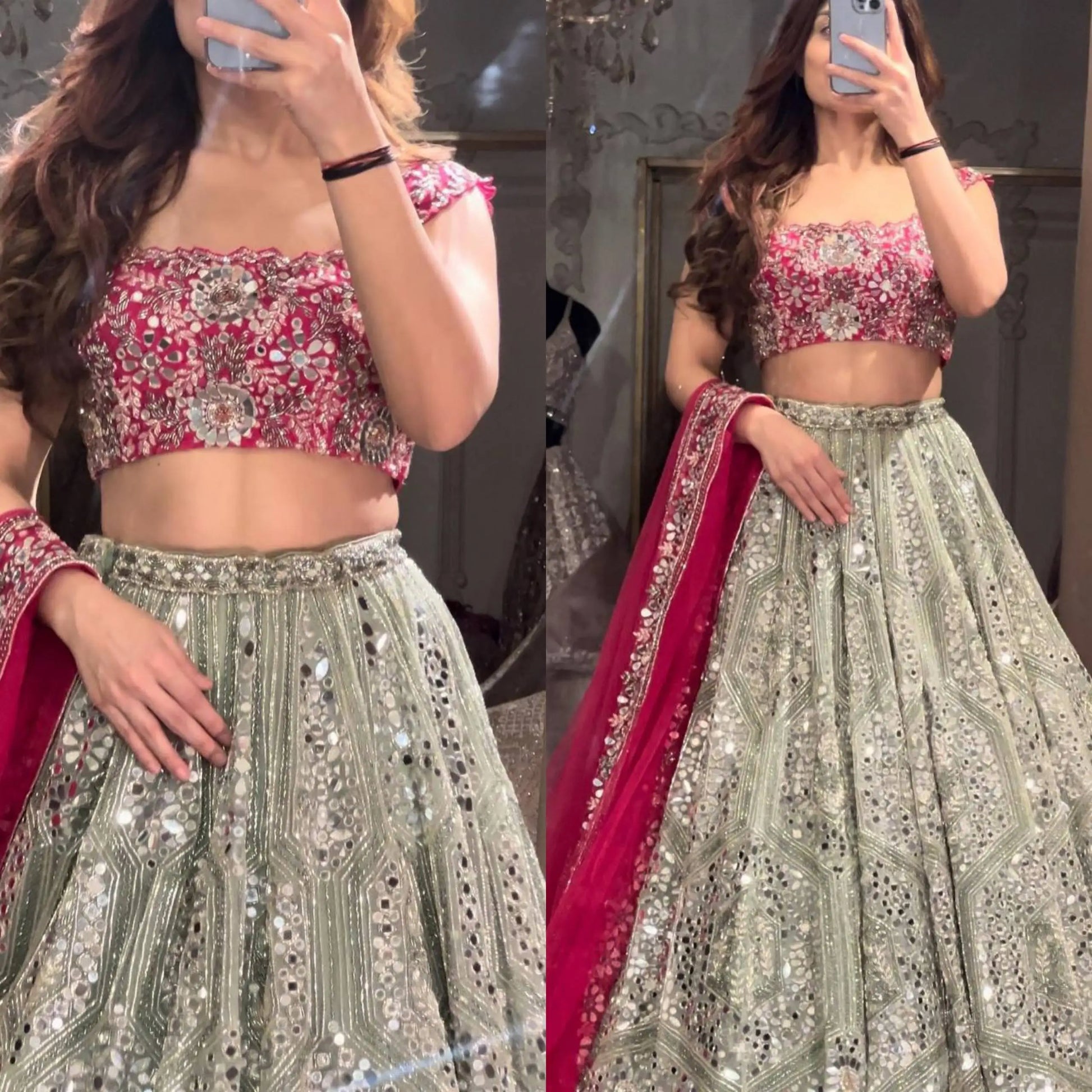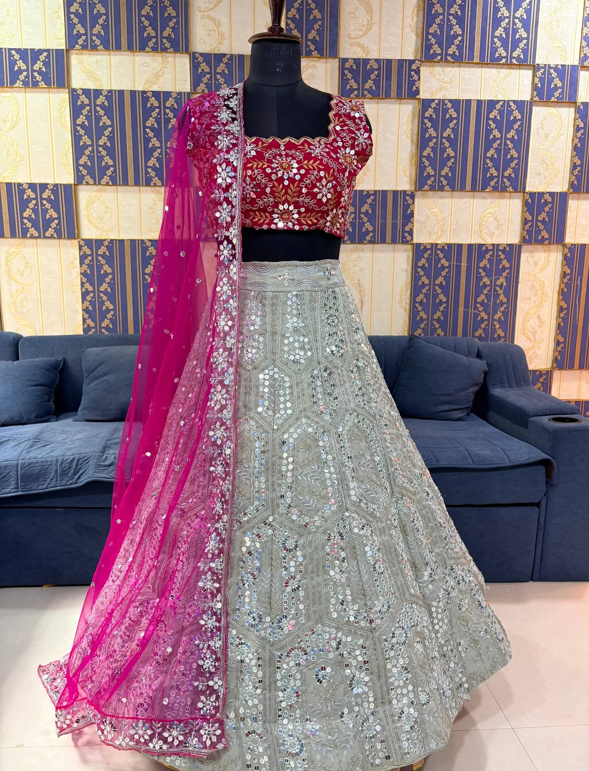 The lehenga and blouse are made from premium faux georgette with sequins embroidery work, and the dupatta is crafted from butterfly net.
