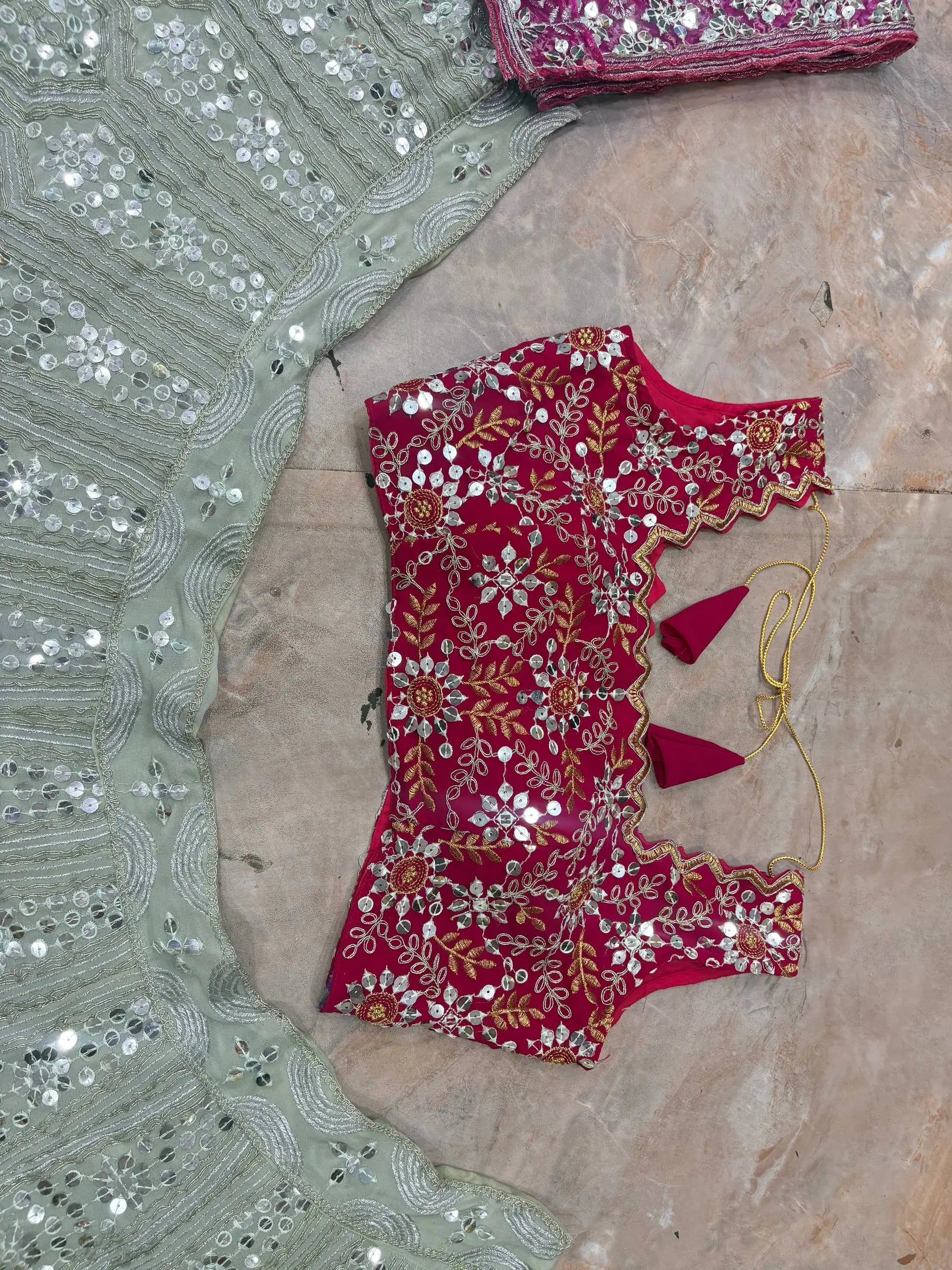 The blouse is made from matching premium faux georgette and is adorned with sequins embroidery work. Provided in 1.3 meter unstitched fabric, it allows you to customize the fit and neckline according to your preference.