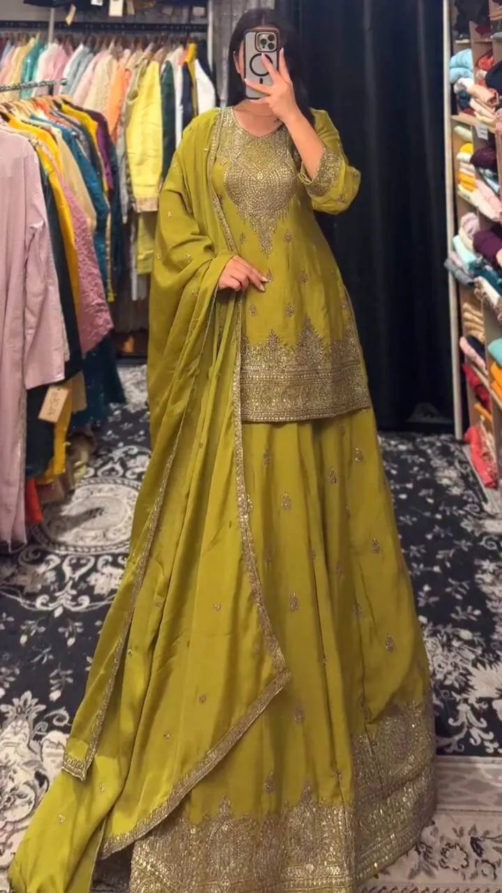 Step into timeless elegance with this Red Chinon Silk Lehenga Set, crafted to perfection with intricate embroidery and sequin detailing. The set features a beautifully embroidered top, a luxurious 3-meter flared lehenga, and a matching embroidered dupatta, making it a perfect choice for weddings, engagements, festivals, and special celebrations.