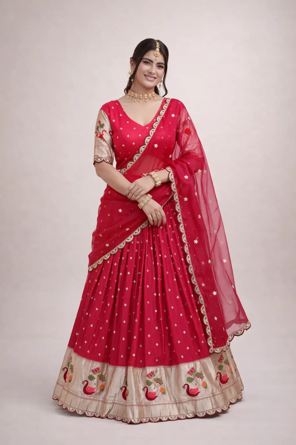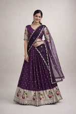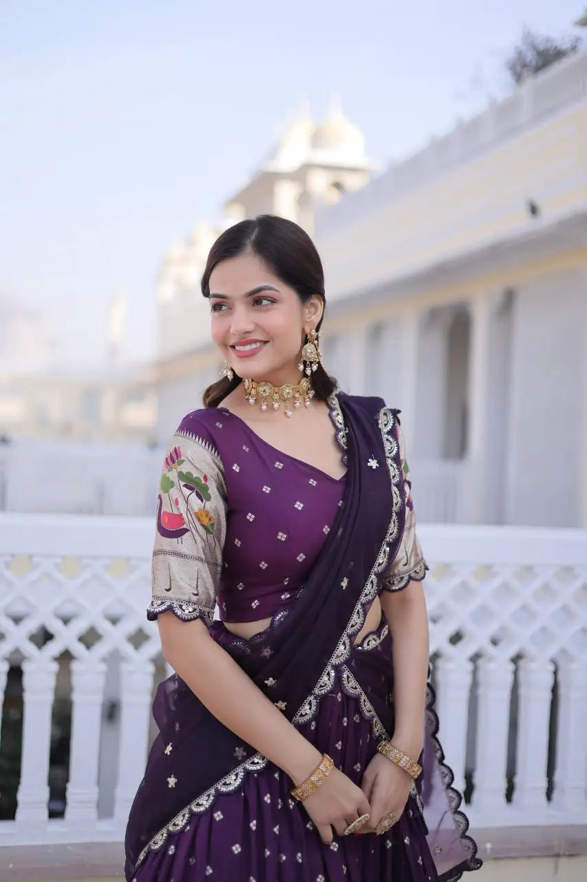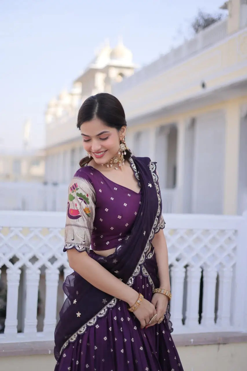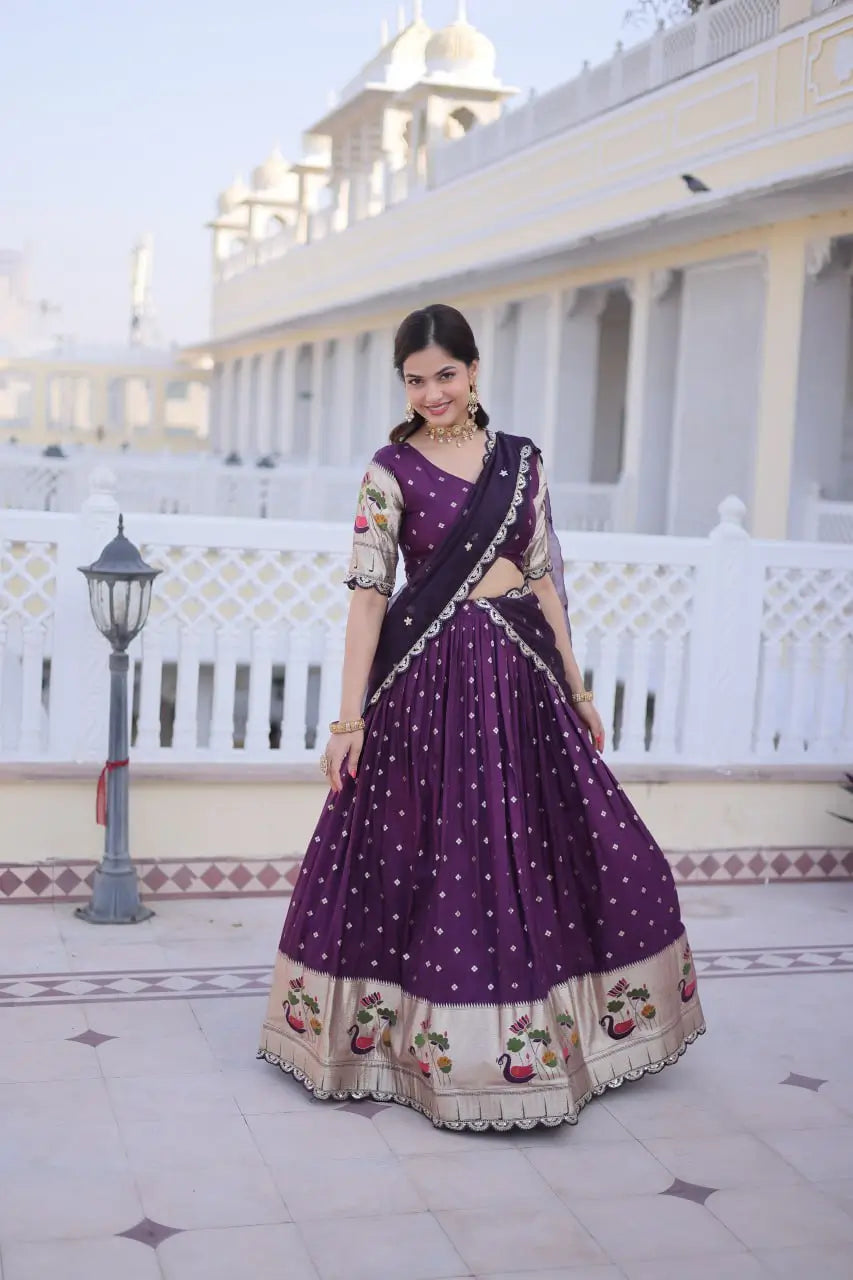 This elegant lehenga set is crafted from premium dola silk, designed to showcase traditional craftsmanship with a rich festive appeal. The fully stitched lehenga features intricate Meena weaving enhanced with sequins coding and embroidered lace work, giving it a refined and luxurious finish. Designed with a graceful 3 meter flair and supported with canvas patta stitching, it offers a beautiful structure and flow. The cotton inner lining ensures comfort during long wear. Paired with an unstitched dola silk blouse featuring matching weaving and embroidery, and completed with a tebby silk dupatta adorned with sequins coding embroidery, this ensemble is ideal for weddings, festive occasions, and traditional celebrations.