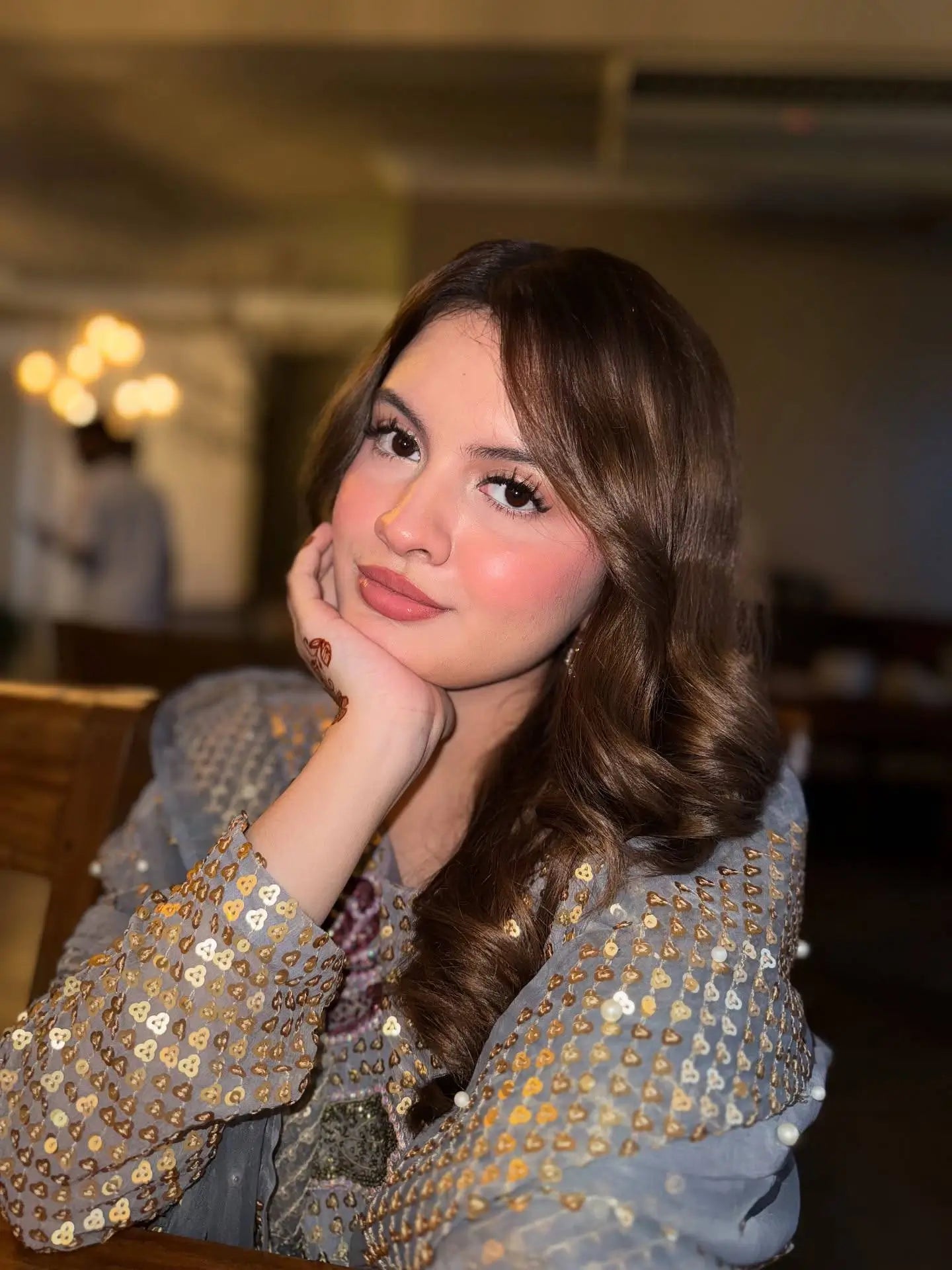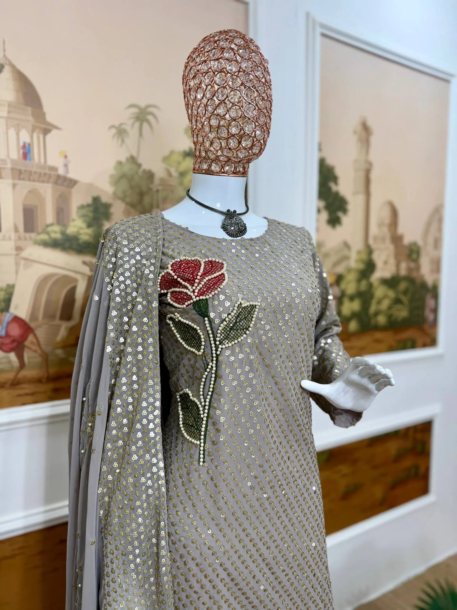 The dove grey tone is subtle, elegant, and very versatile. It looks graceful in daylight and luxurious under warm indoor lighting. This shade flatters Indian skin tones beautifully and pairs perfectly with silver, pearl, or pastel accessories. The shimmer from sequins and the pearl moti detailing creates a rich contrast against the soft base color without looking loud.