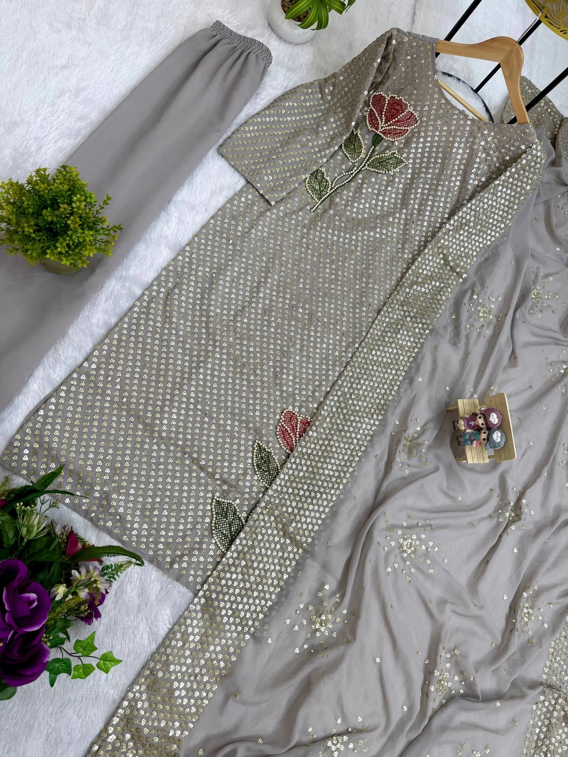 The kurti is made from faux georgette, giving it a lightweight, flowy drape with a refined finish. It features dual sequins heavy embroidery and pearl moti work, enhanced with beautiful floral detailing that adds depth and premium appeal.