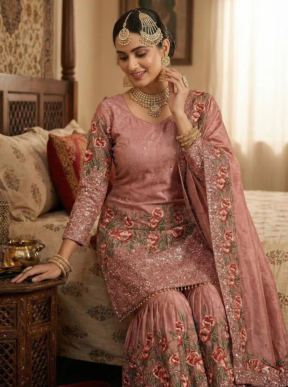Step into the festive season with this stunning sharara set crafted in pure Fendy silk, designed especially for Eid celebrations and special occasions. This fully stitched ready to wear ensemble showcases heavy embroidery sequence work enhanced with delicate hand detailing, giving it a rich and graceful appeal. The top features full sleeves and intricate embroidery that adds depth and elegance, making it perfect for both day and evening gatherings.