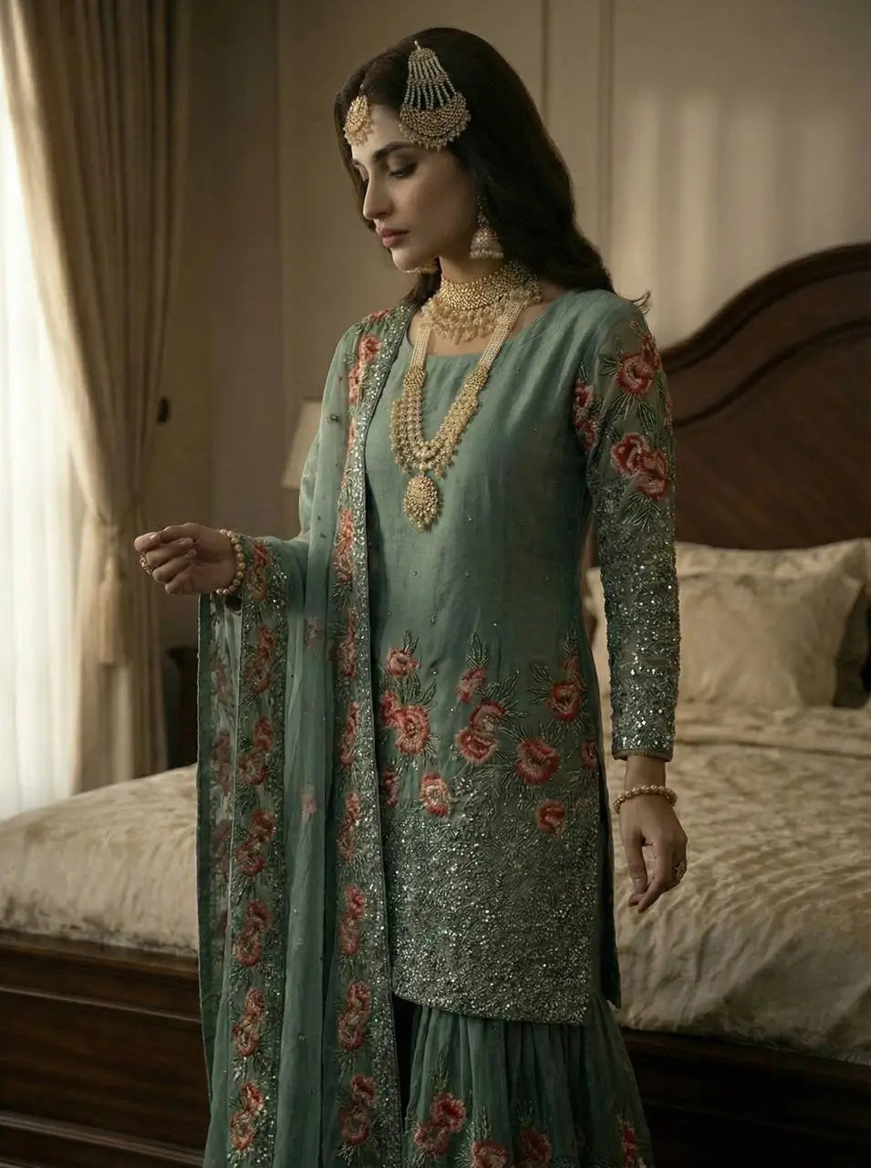 The sharara pant is tailored in matching pure Fendy silk with heavy embroidery sequence work and a comfortable elastic waistband for ease of wear. Lined with heavy micro cotton, the outfit ensures comfort while maintaining a structured and luxurious fall. The look is completed with a beautifully embroidered heavy Fendy silk dupatta finished with a fancy lace border, adding a festive charm to the entire ensemble. Ideal for Eid, wedding functions, festive parties and family celebrations, this set combines traditional craftsmanship with contemporary style.
