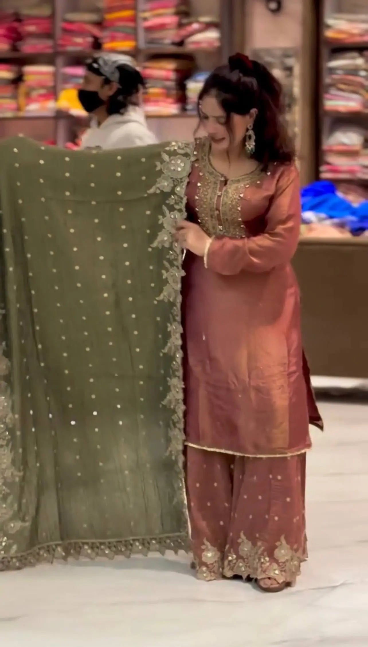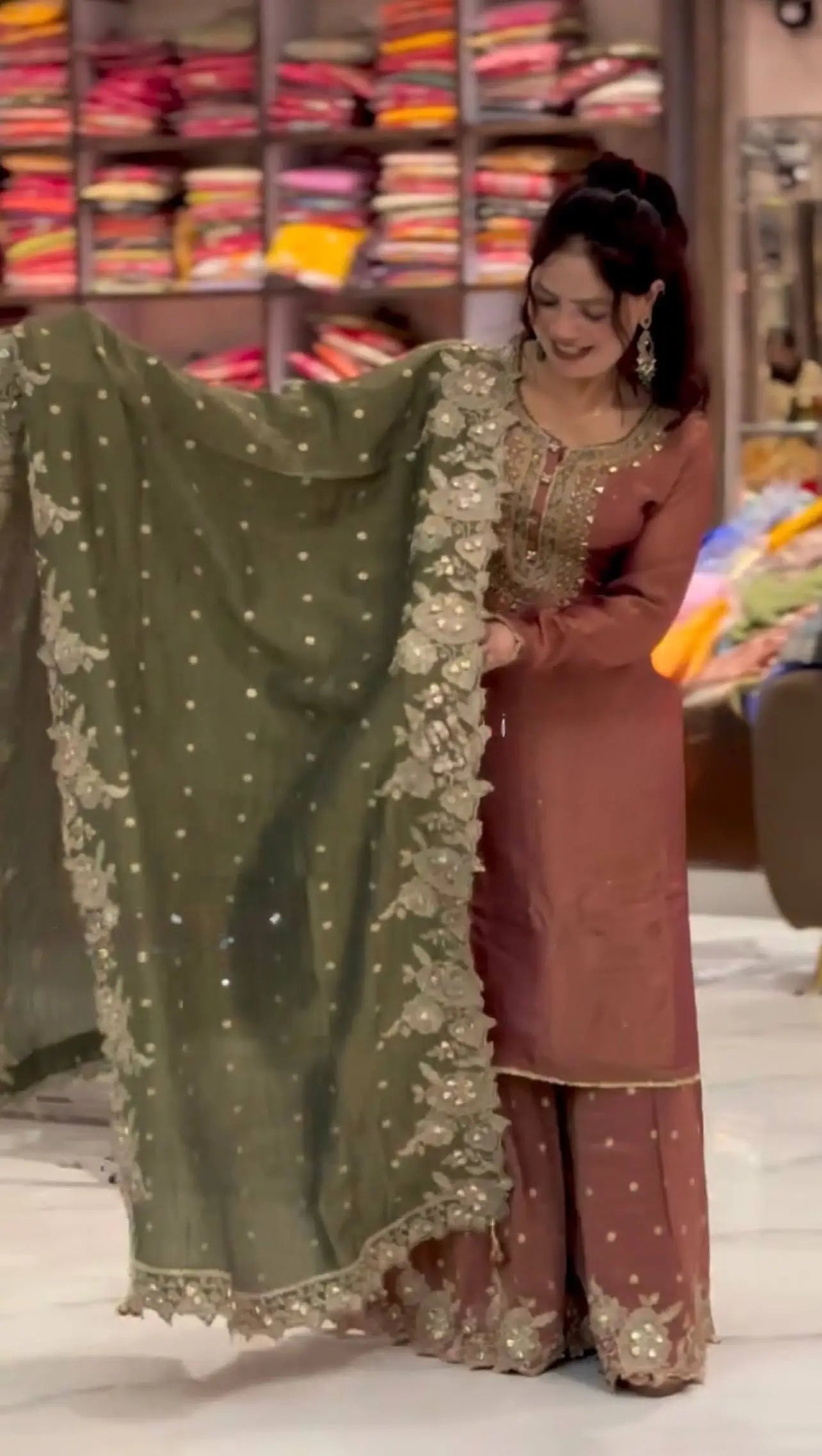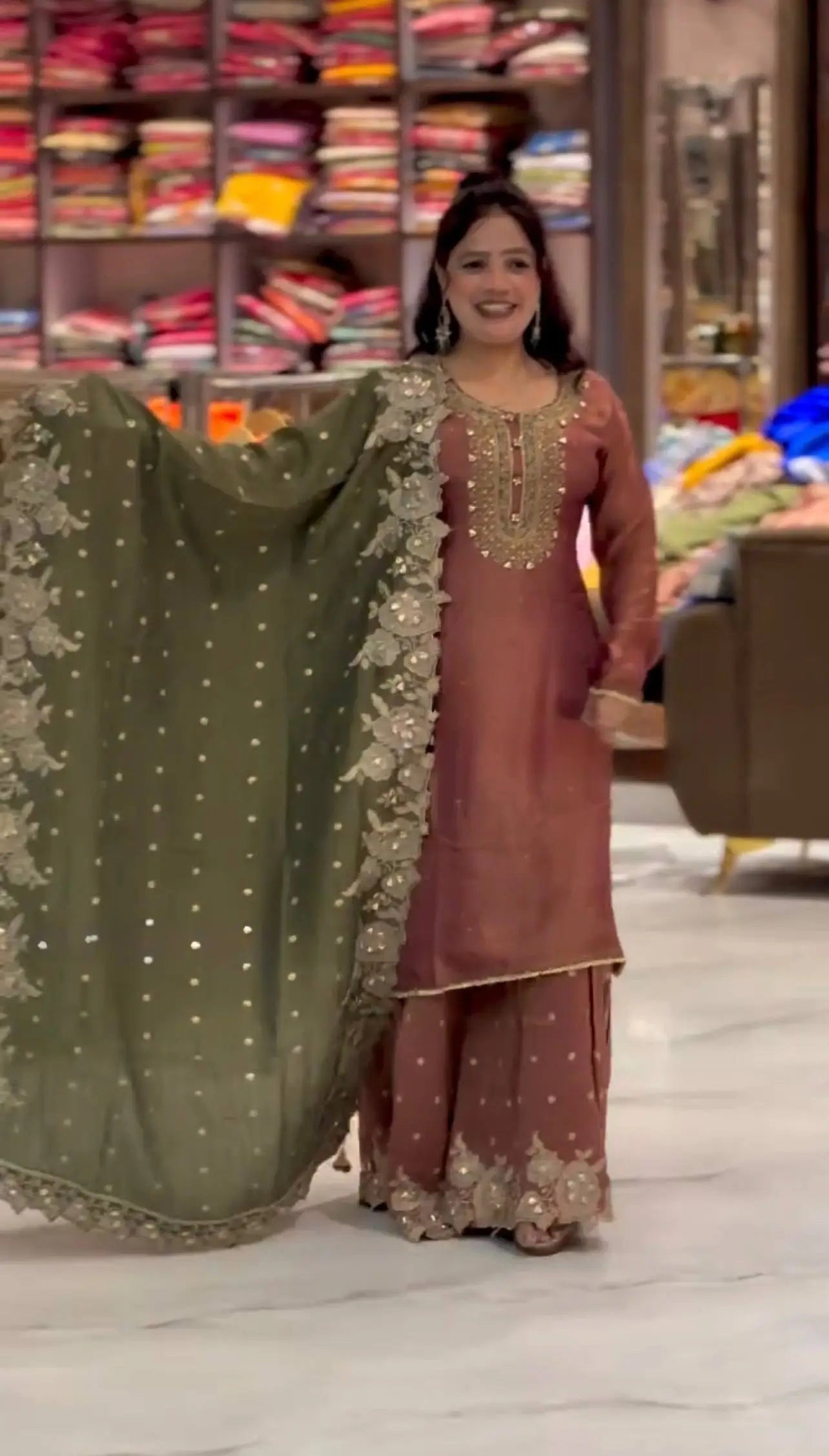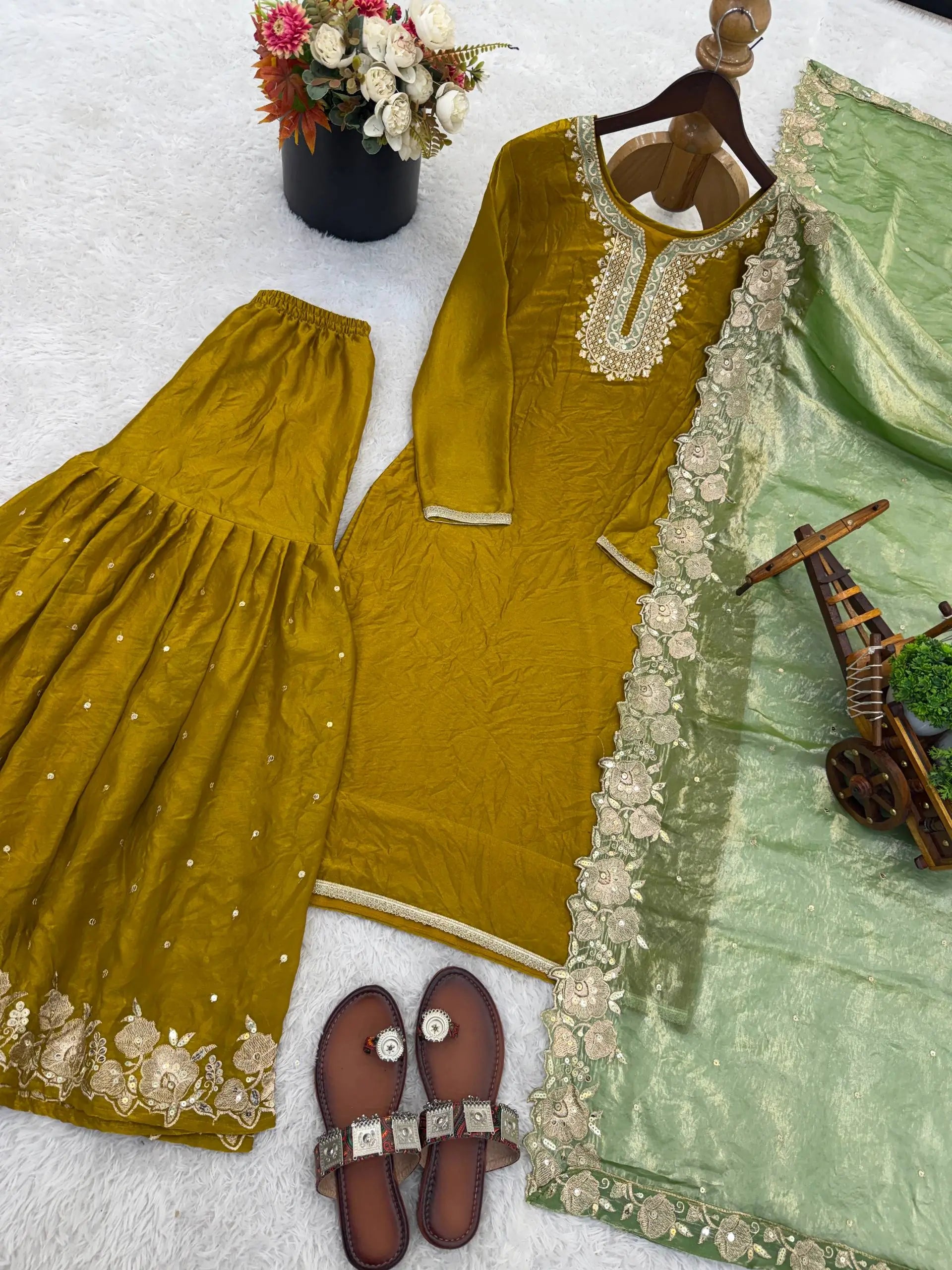 The top is lined with heavy micro cotton to ensure comfort while maintaining a structured and premium finish. Paired with a stunning Fendy silk sharara palazzo designed with full flair and detailed embroidery sequence work, this ensemble creates a graceful and flowy look. The matching Fendy silk dupatta, adorned with embroidery sequence work and an elegant lace border, completes the outfit with a sophisticated touch. Fully stitched and ready to wear, this premium quality set is ideal for weddings, festive celebrations, engagement functions and traditional gatherings.