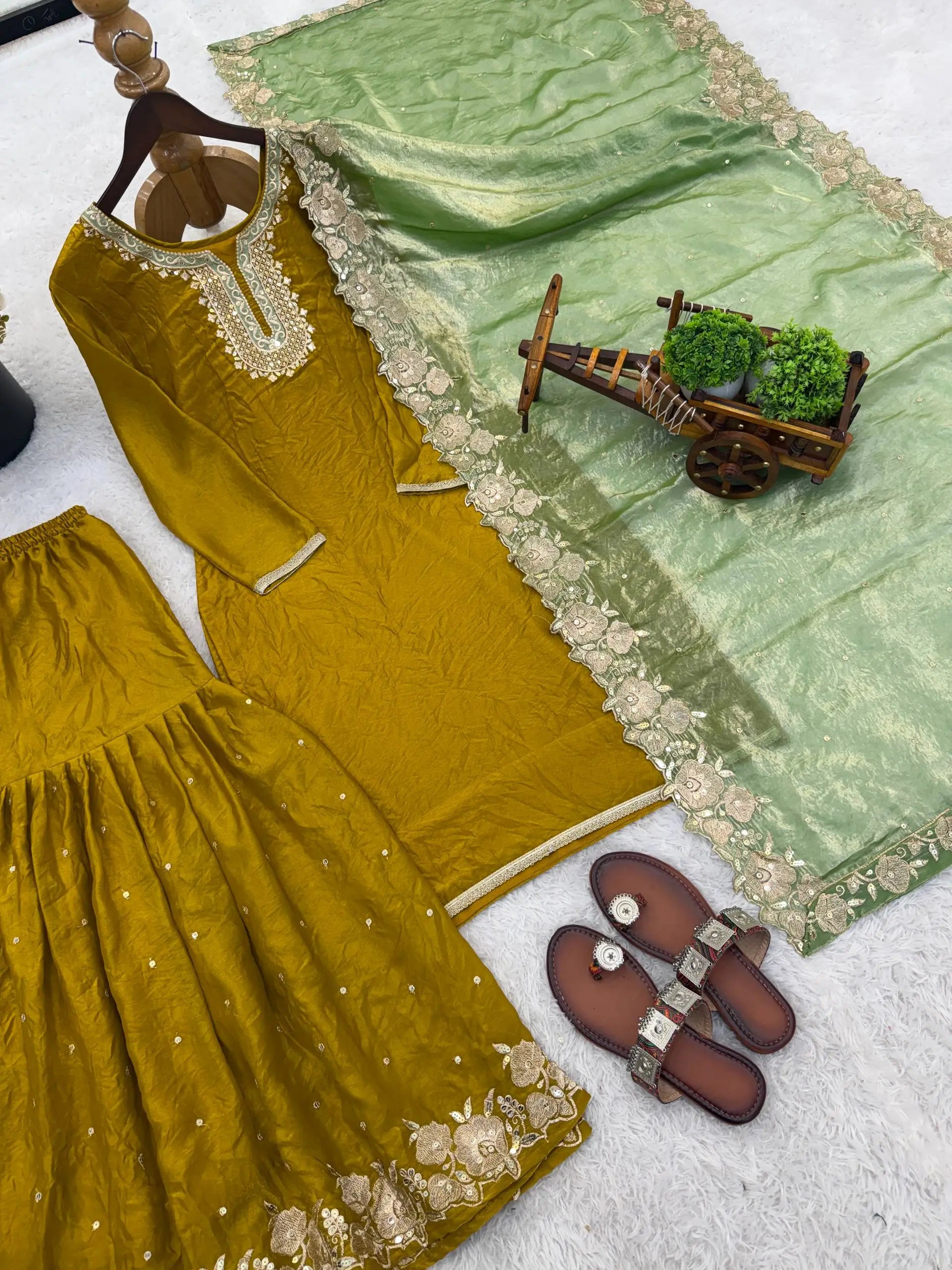 Step into timeless elegance with this beautifully crafted Fendy silk sharara set, designed to bring grace and sophistication to your festive wardrobe. The top features intricate embroidery sequence work that enhances its rich texture and adds a luxurious festive appeal. With full sleeves and a flattering length of 39 to 40 inches, this outfit offers a refined and traditional silhouette perfect for grand occasions.