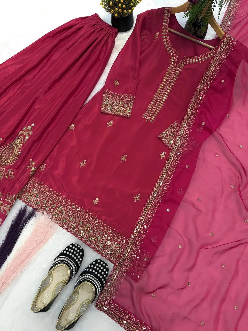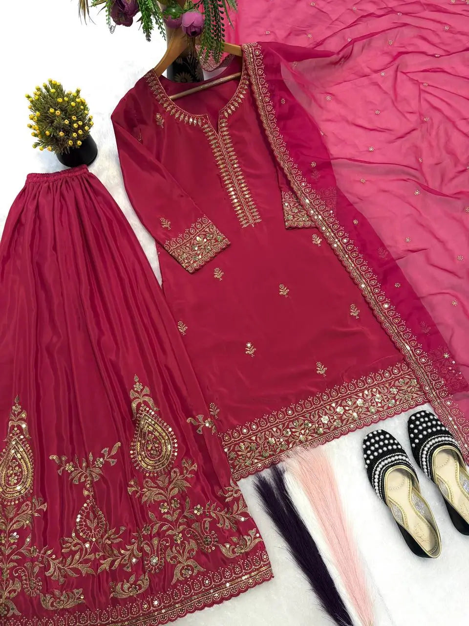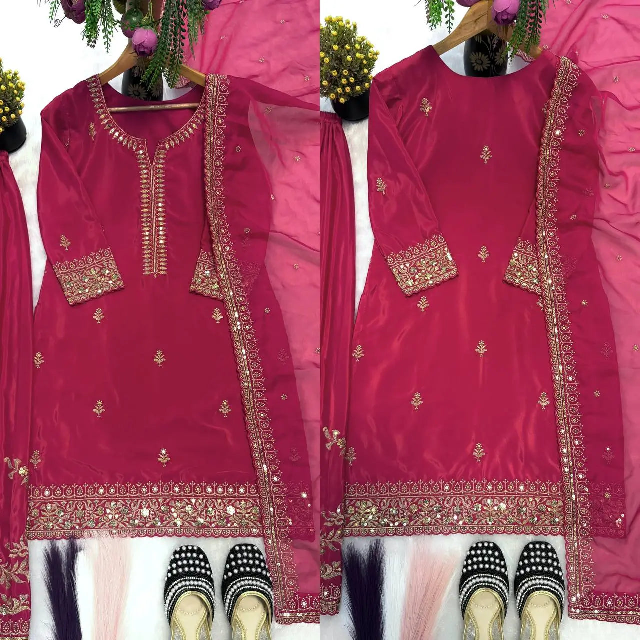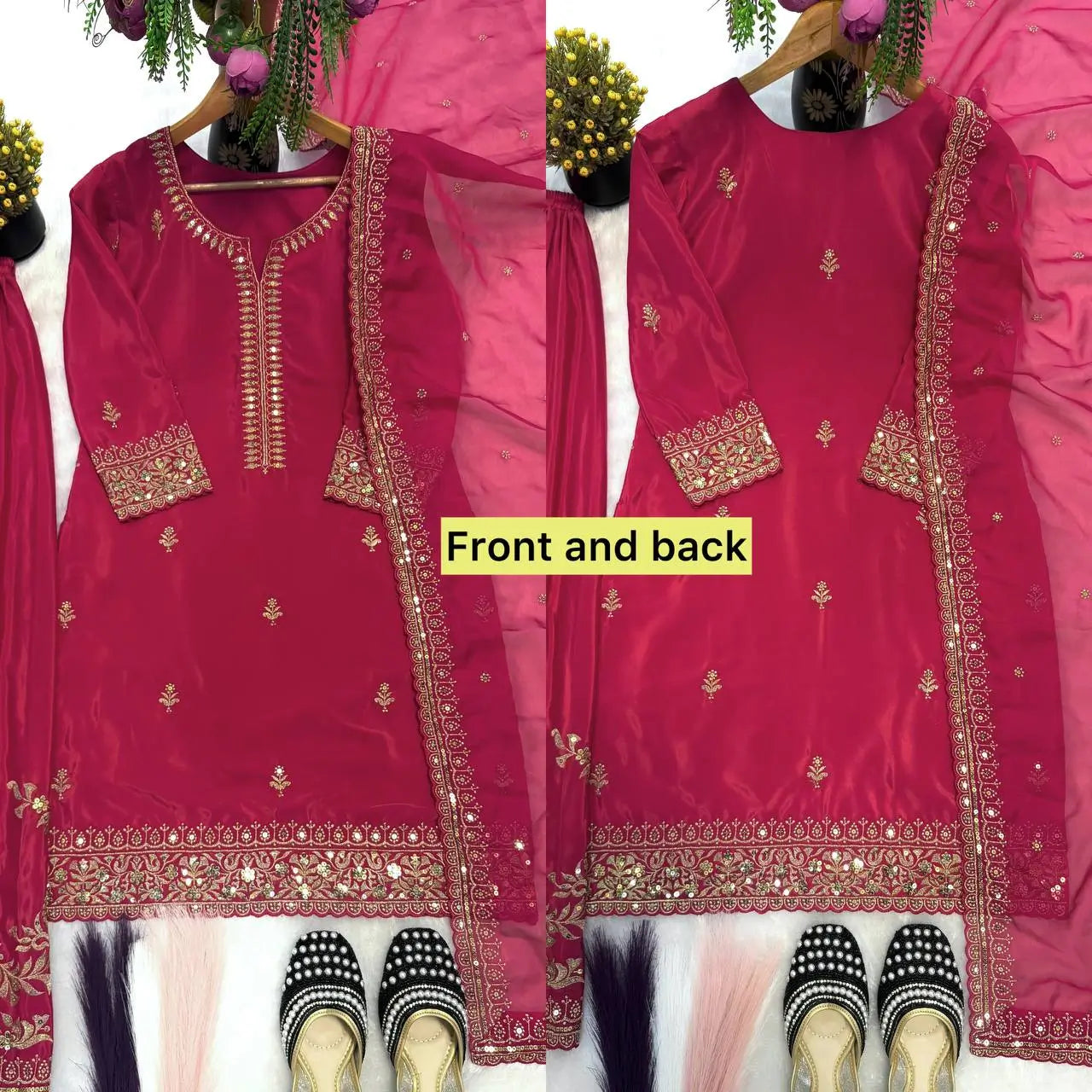 The look is completed with a heavy organza silk dupatta featuring embroidery sequence work and an elegant fancy cut border, giving the outfit a refined and celebration-ready finish. Perfect for weddings, festive gatherings, family functions, haldi ceremonies, mehendi events, and upcoming festive occasions, this ensemble blends comfort, richness, and timeless style beautifully.