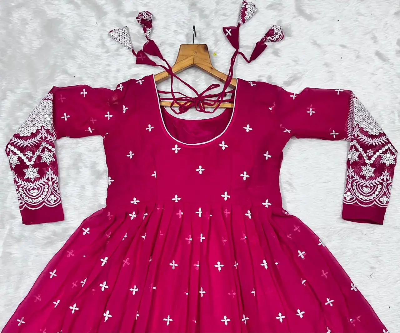 Embrace sophistication with this beautifully crafted Anarkali gown set, available in pink and navy blue. Designed in premium faux blooming fabric, it features heavy 3/5mm sequin embellishments with delicate thread embroidery for a graceful festive appeal. The kali-cut silhouette with a length of 50–52 inches offers a flattering fall, while the full micro cotton lining ensures all-day comfort.
