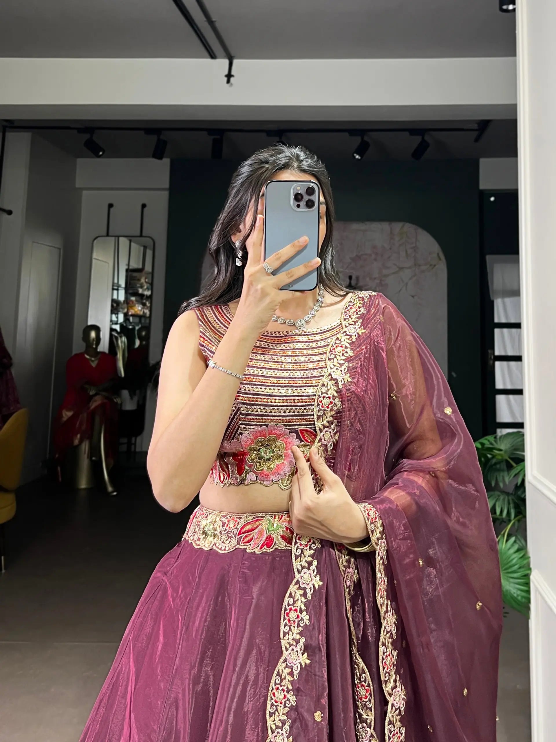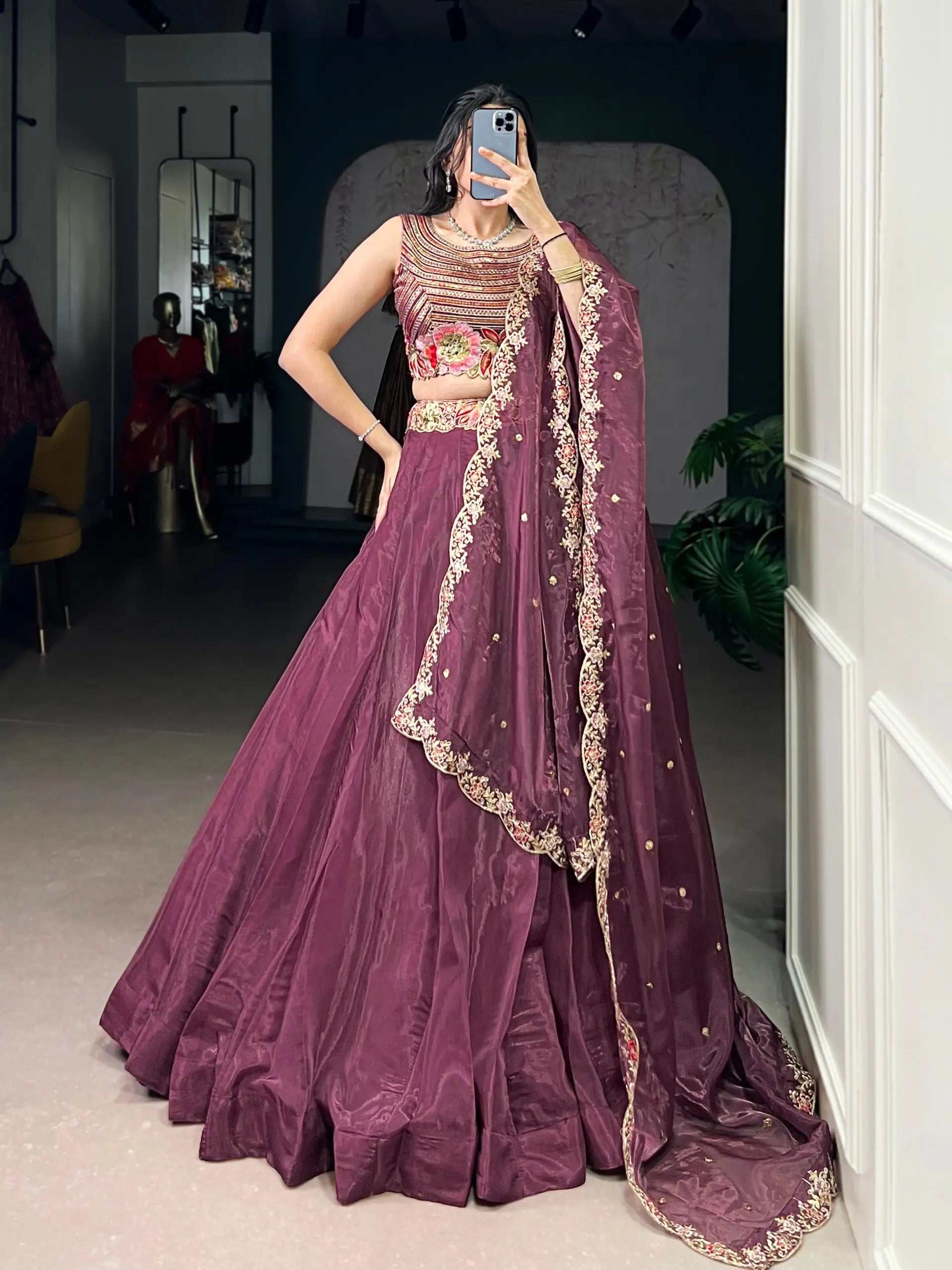 Elevate your festive wardrobe with this elegant lehenga choli set crafted in rich Chanda silk. The stitched lehenga features a graceful plain base highlighted with a beautifully embroidered belt adorned with sequins and thread work, creating a refined and modern ethnic look. Designed with a generous five meter flair, it is stitched with cancan and canvas to give structured volume and an elegant fall. A double micro crepe inner ensures comfort and durability throughout long celebrations. The unstitched blouse with sleeves is crafted from matching Chanda silk and detailed with coordinated sequins and thread embroidery, allowing for a customized fit. Completing the ensemble is a matching Chanda silk dupatta embellished with delicate embroidery, adding softness and charm. This lehenga set is ideal for weddings, festive occasions, and special celebrations.
