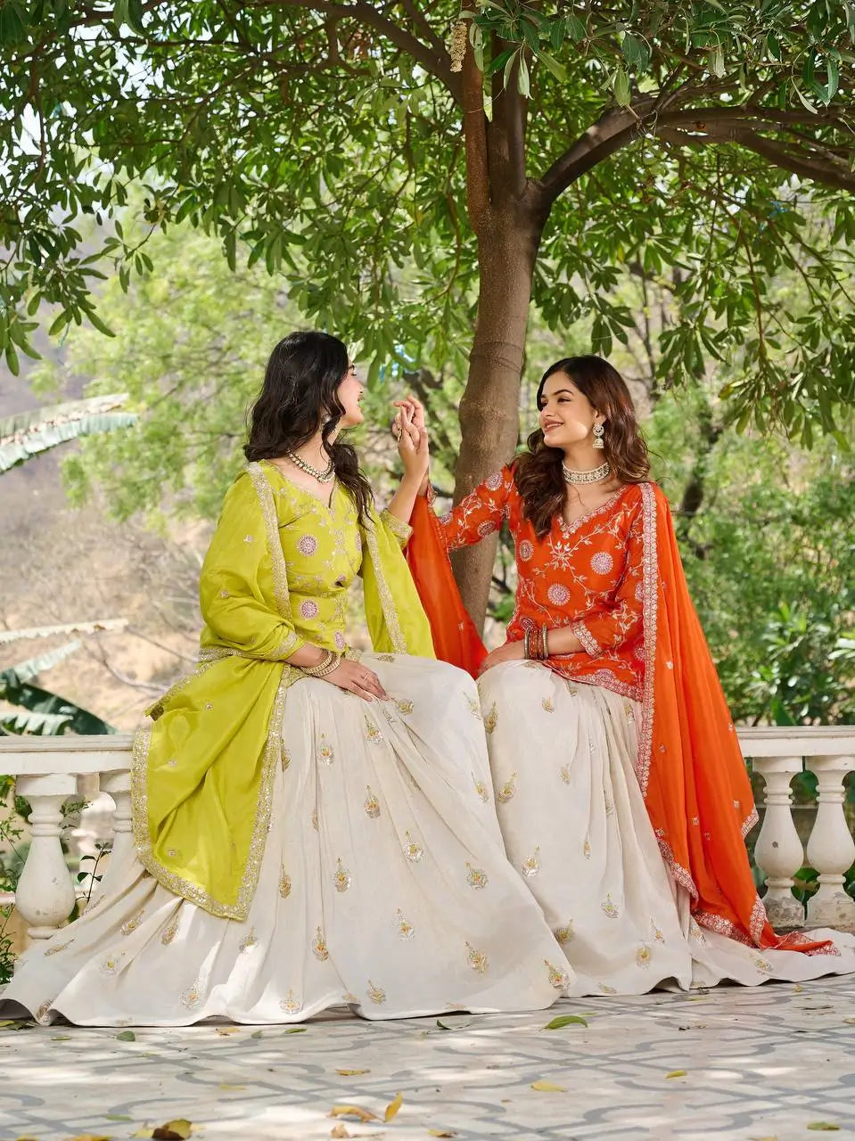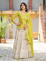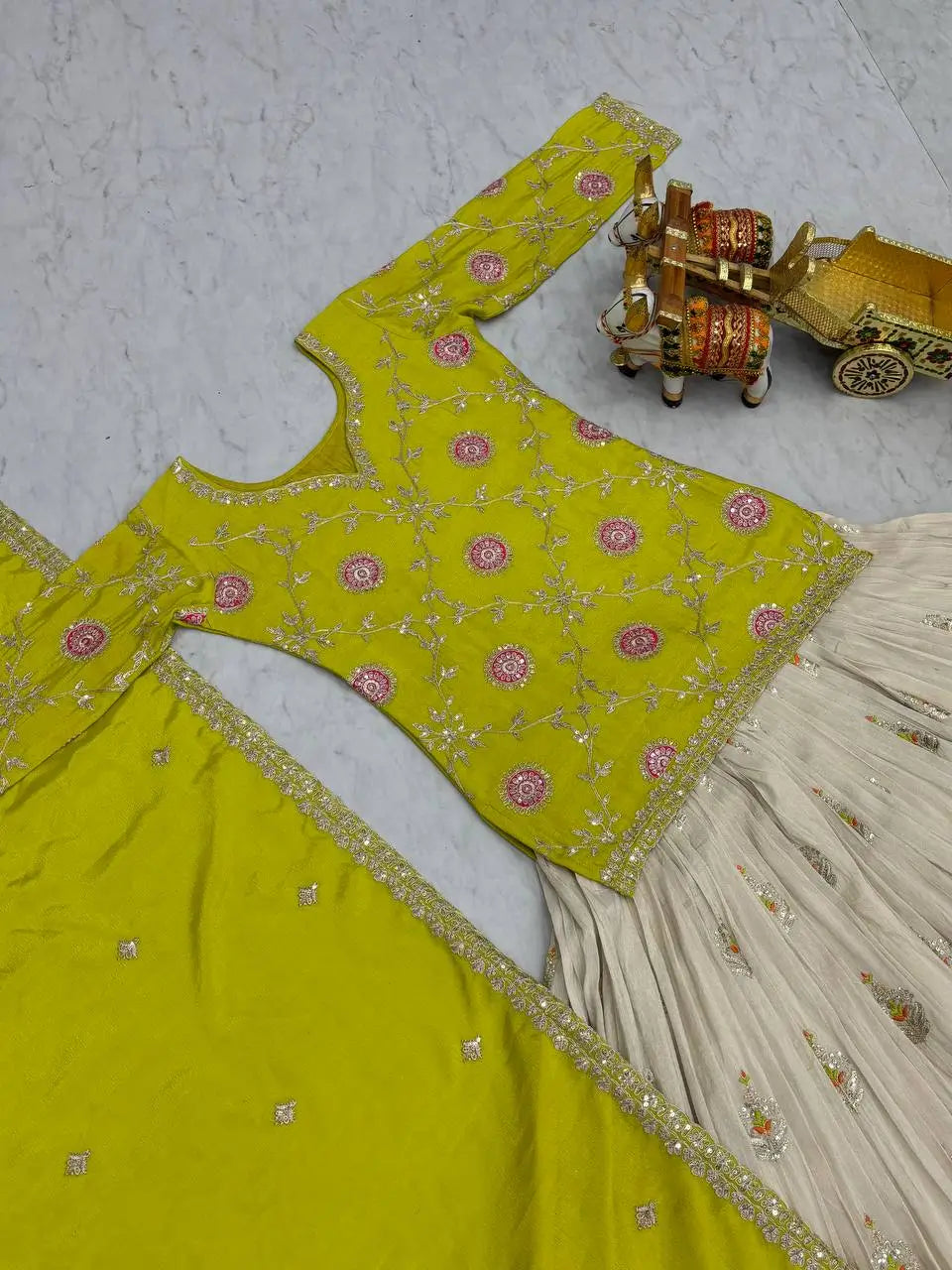 This festive lehenga set pairs a beautifully crafted chinon kurti with a flowing tissue silk lehenga for an elegant and refreshing traditional look. The kurti features heavy cording embroidery with sequins and thread work, finished with a soft micro cotton inner for all-day comfort. The tissue silk lehenga carries matching embroidery details, a graceful three and a half meter flair, and comes enhanced with canvas, cancan, and an adjustable dori for a structured and secure fit. The chinon dupatta completes the outfit with coordinated embroidery work. Available in two vibrant colours, this set is perfect for festive celebrations, daytime events, and cultural gatherings.