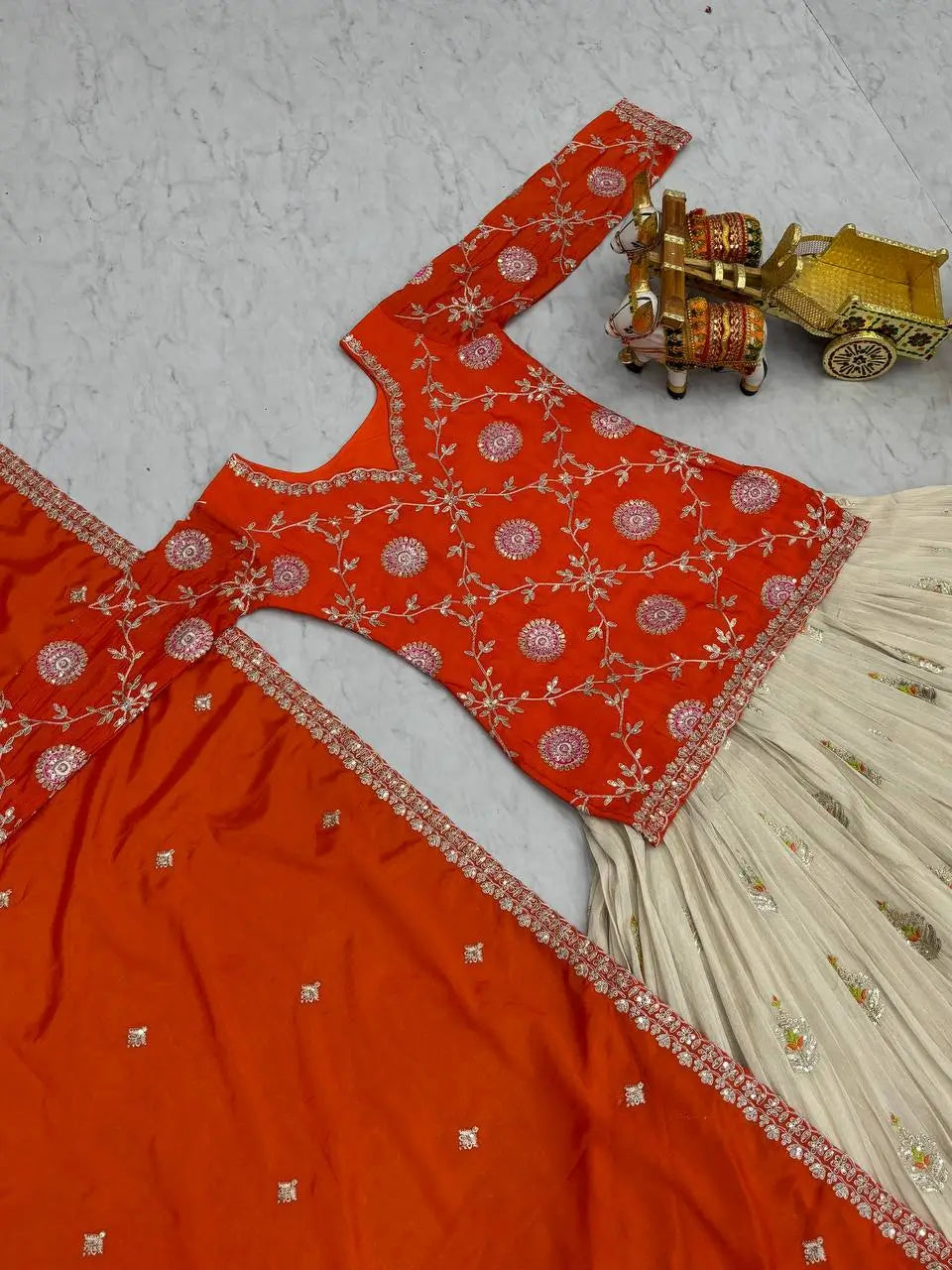 • Pure tissue silk lehenga with embroidered detailing