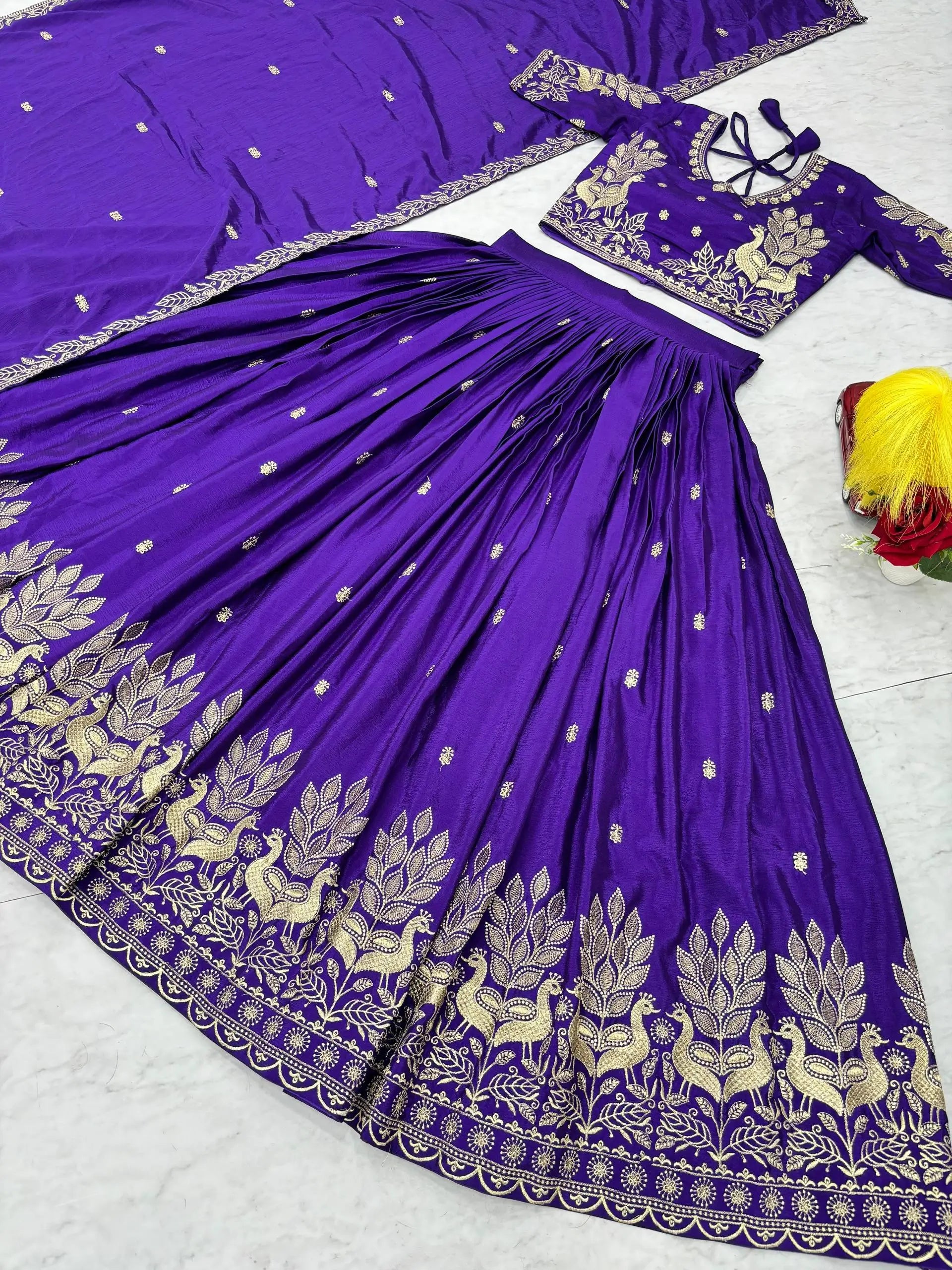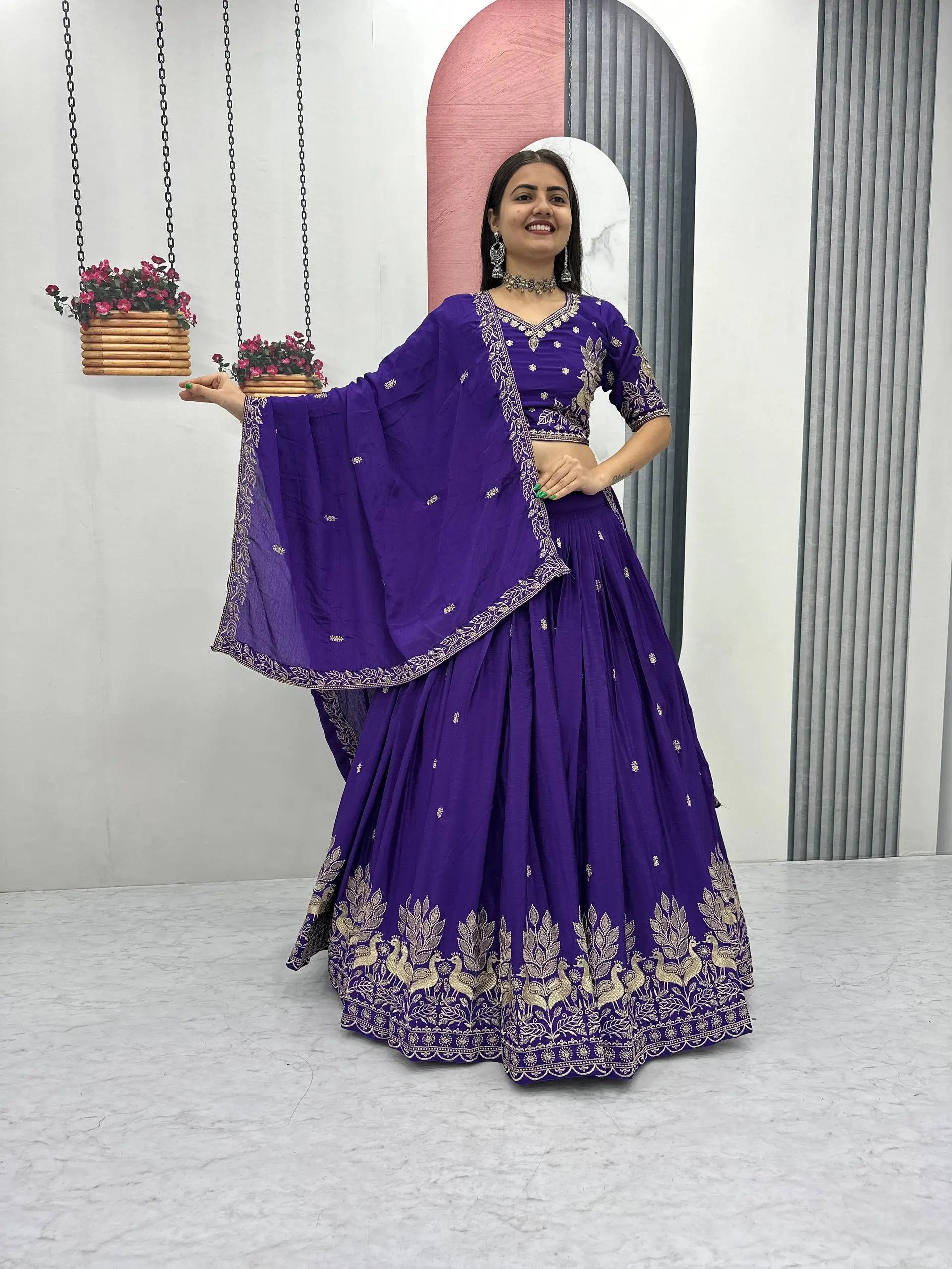 This elegant lehenga choli set is crafted from premium chinon fabric, known for its lightweight feel and graceful flow. The choli is fully stitched and adorned with refined embroidery thread work, paired with a soft micro cotton inner for comfortable wear. It comes with size margins that allow easy adjustment for a personalized fit. The lehenga features matching embroidery and a generous 3.5 meter flair that creates a beautifully voluminous silhouette. The dupatta completes the look with coordinated chinon fabric and embroidered detailing. This set is perfect for festivals, weddings, and special celebrations where style and comfort come together effortlessly.