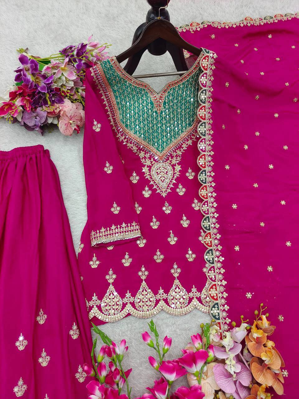 This embroidered chinon sharara suit set is crafted to bring together elegance, comfort, and refined festive styling. The kurti is made from pure chinon silk and enhanced with intricate coding embroidery and sequence work that adds richness without compromising comfort. A soft micro cotton inner ensures a smooth and breathable fit. The pure chinon silk sharara mirrors the same heavy embroidery work, creating a cohesive and luxurious ensemble. The pure chinon dupatta elevates the look further with its beautiful bandhej digital print and embroidered lace border. Fully stitched and designed to flatter, this outfit is ideal for festive occasions, weddings, cultural events, and special gatherings.
