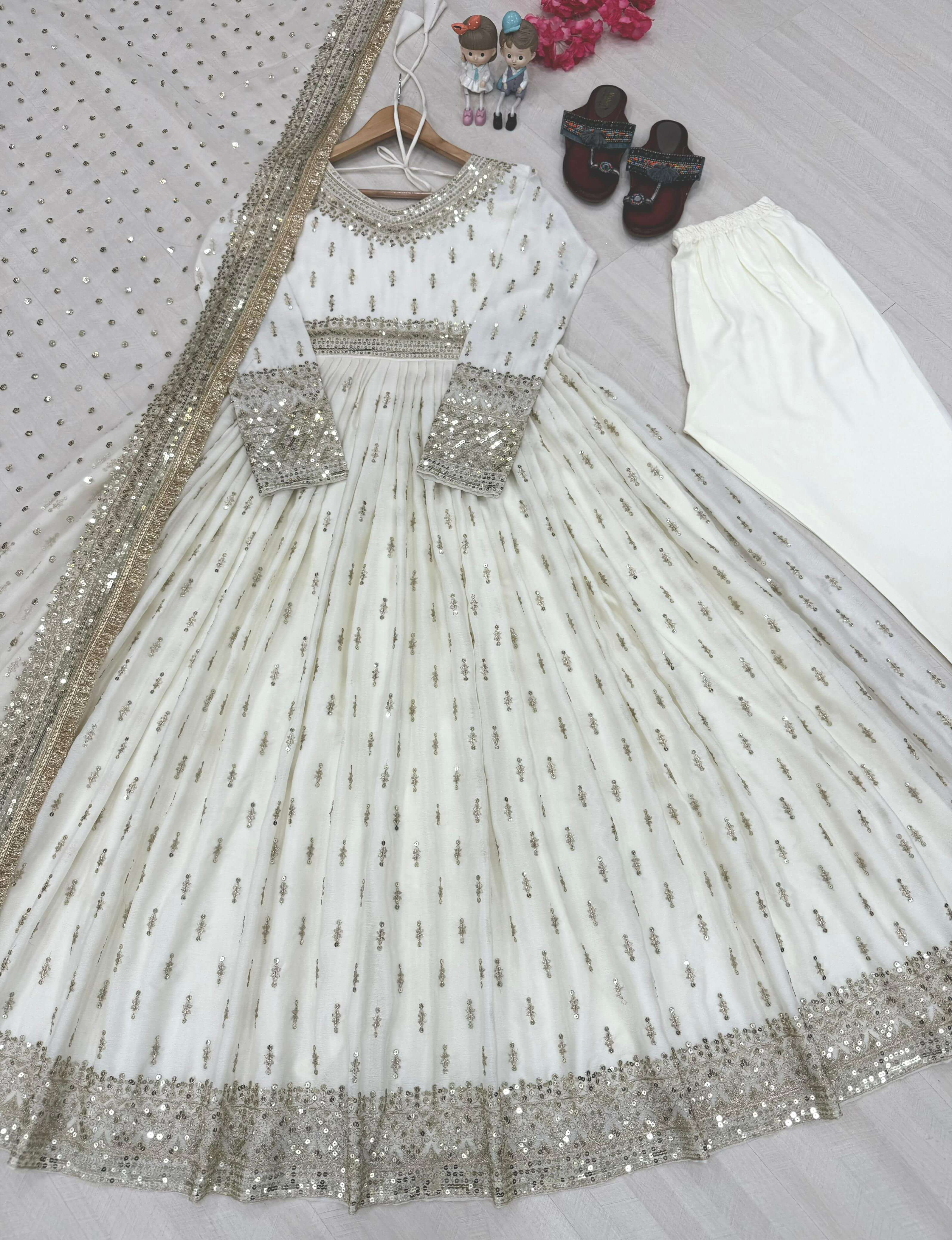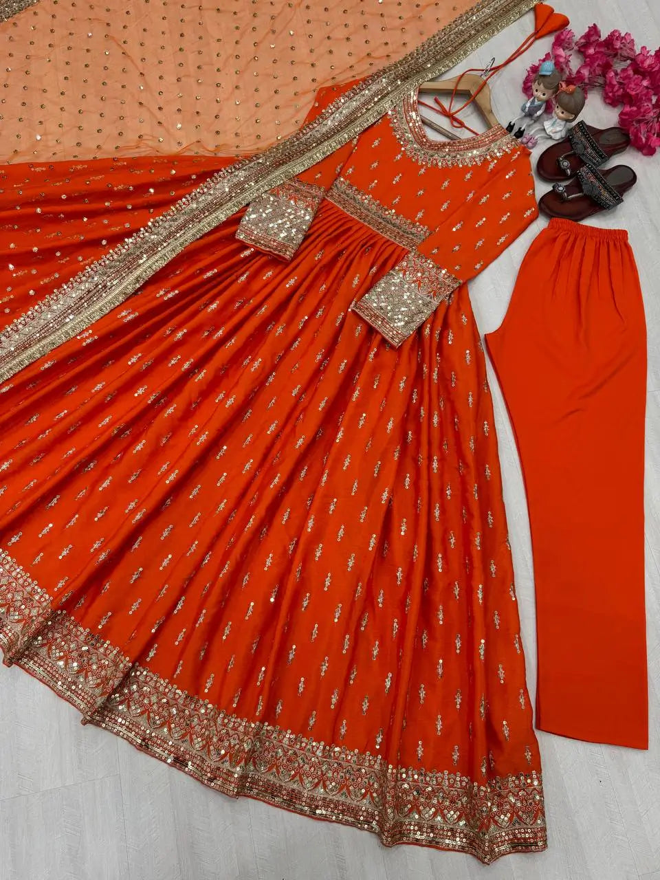 Make a graceful impression at weddings and festive occasions with this embroidered gown set, crafted from heavy pure chinon silk. The gown features intricate embroidery with 5 mm sequin detailing, full sleeves, and elegant tassel accents. Designed with a 3-meter flair and 54–55 inches in length, it creates a flowing and regal silhouette. The inner lining in micro cotton ensures comfort for long hours of wear. The set includes a fully stitched bottom in heavy pure micro cotton with an elastic waist, offering ease and flexibility. Completing the look is a soft butterfly net dupatta adorned with embroidery, sequin work, and a four-side lace border, adding the perfect touch of sophistication.