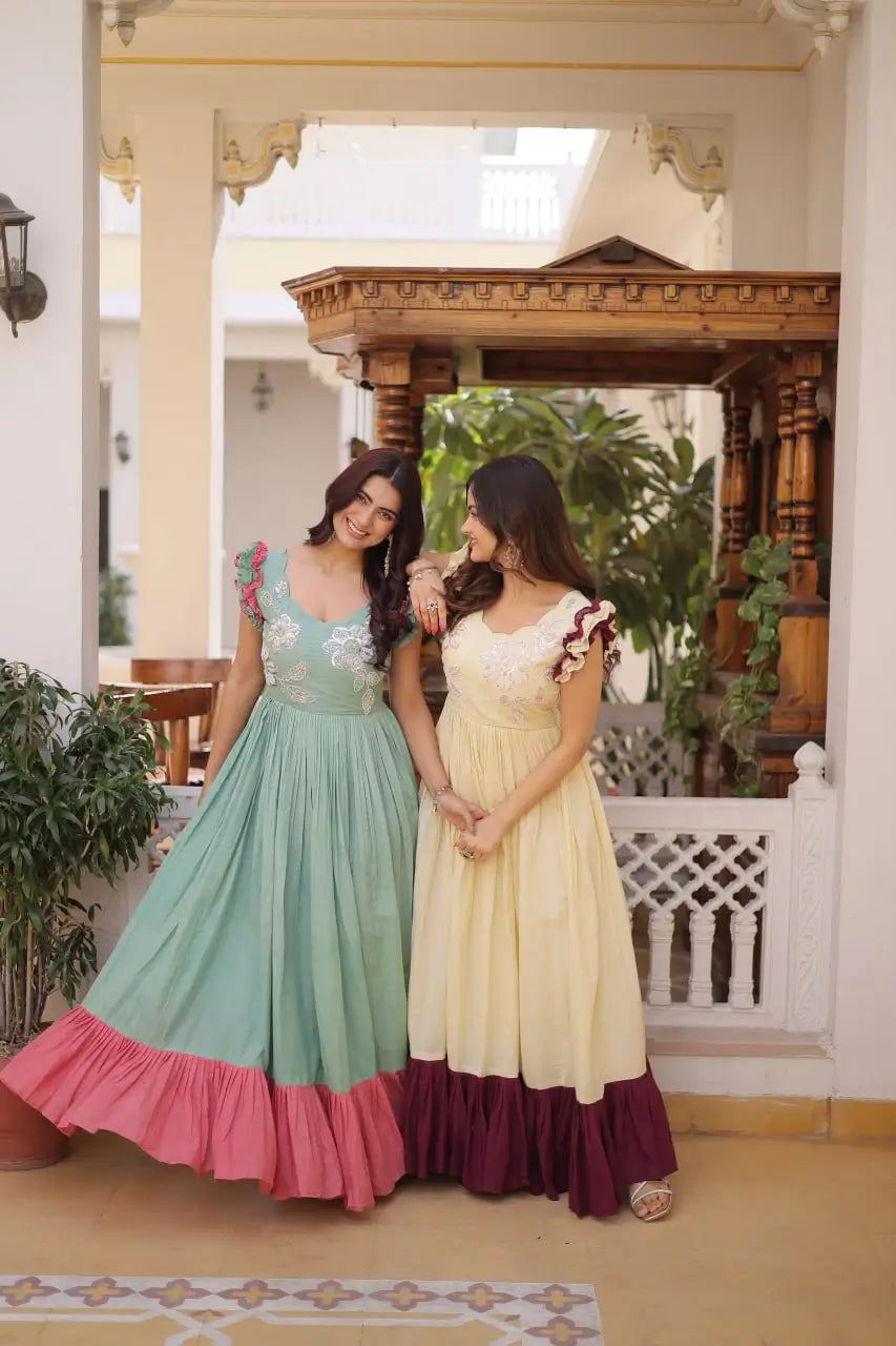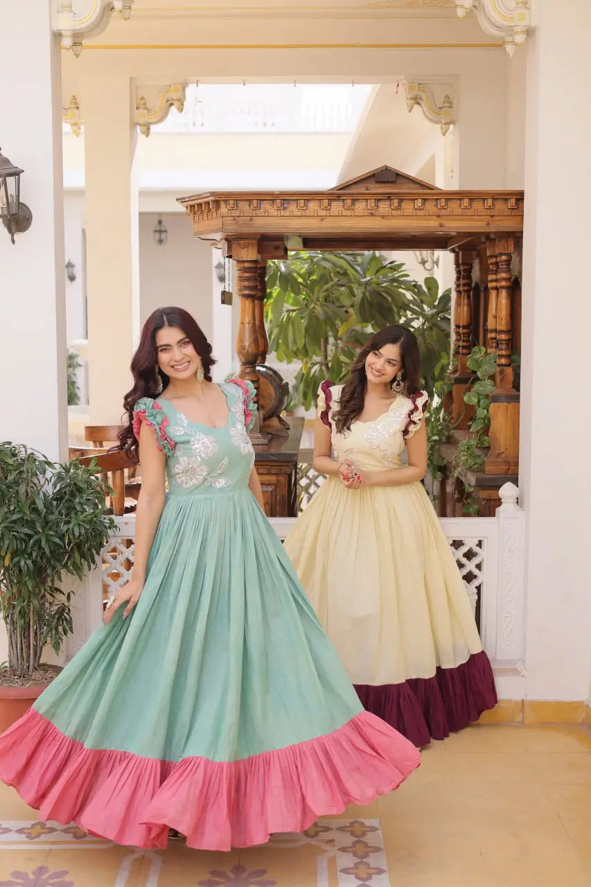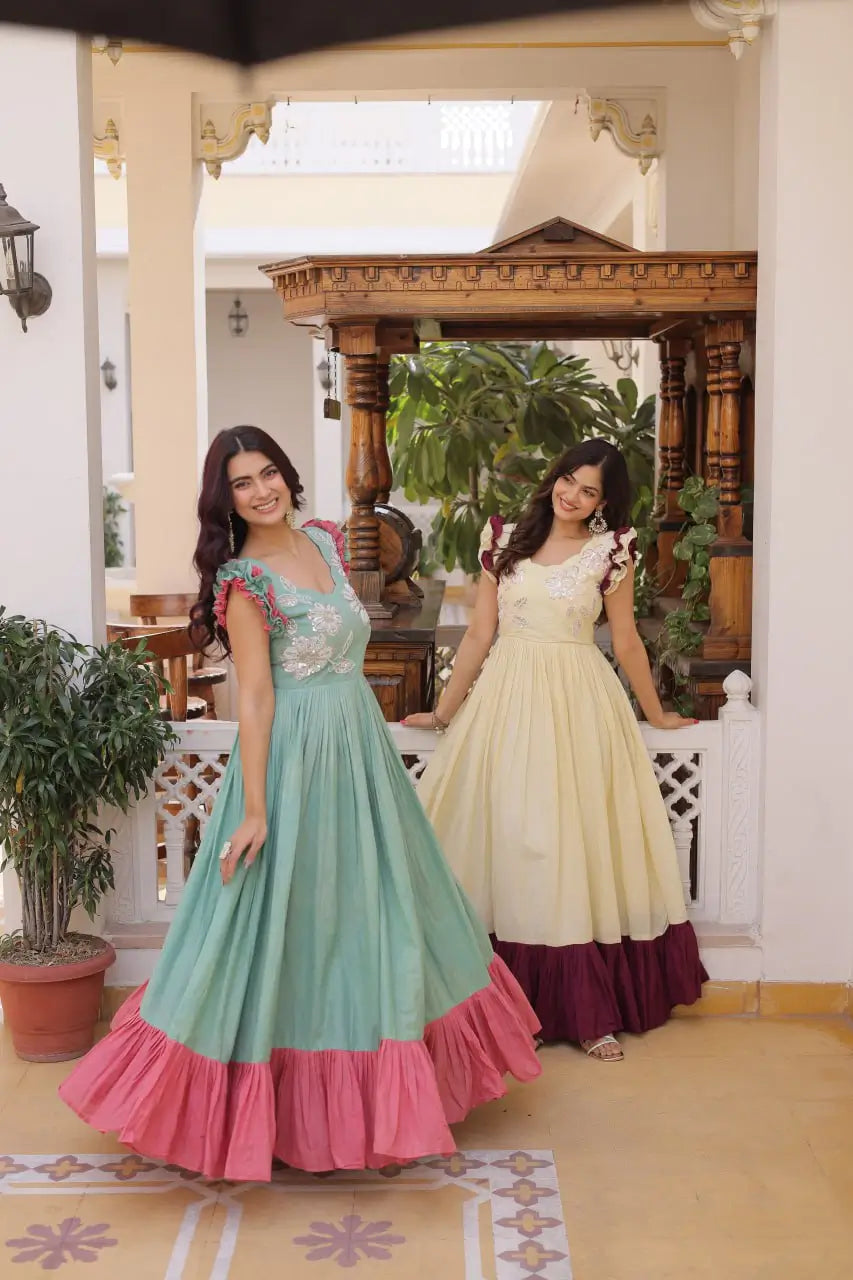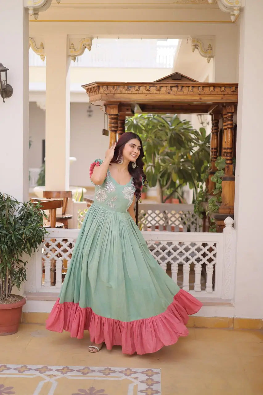 This elegant flair gown is crafted from premium cotton fabric, offering a breathable and comfortable feel with a graceful fall. The gown is beautifully enhanced with sequins, multithread embroidery, and delicate beadwork that adds a refined festive charm. Designed with a generous 7 meter flair, it creates a flowing and flattering silhouette. The sleeveless pattern with shoulder double frill stitching and a fancy round neckline adds a stylish contemporary touch. Fully lined with soft cotton from top to bottom, this gown is perfect for festive gatherings, parties, and casual celebrations where elegance and comfort go hand in hand.