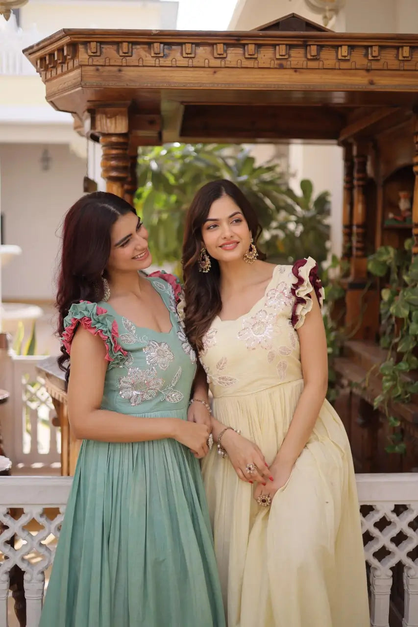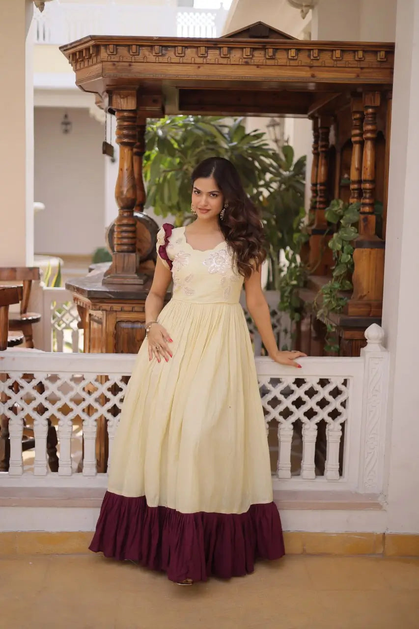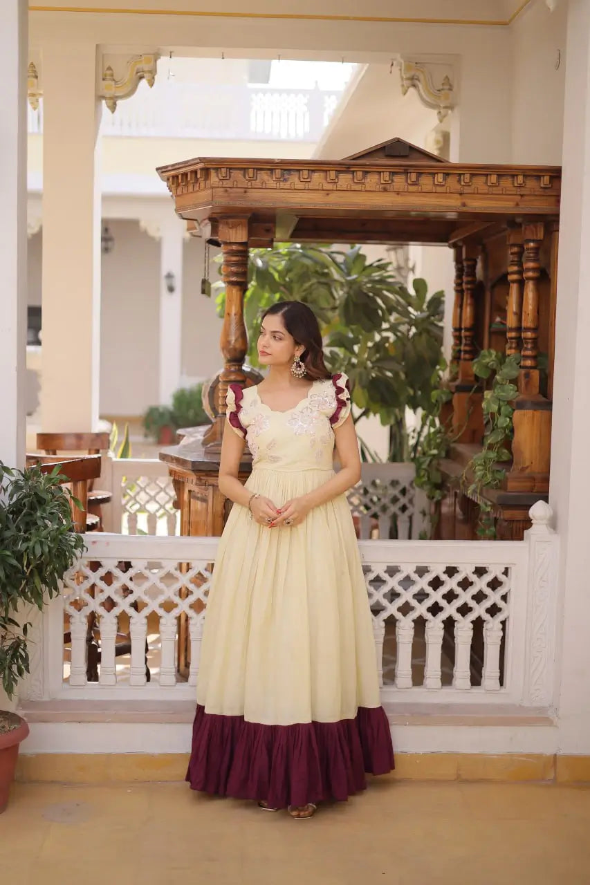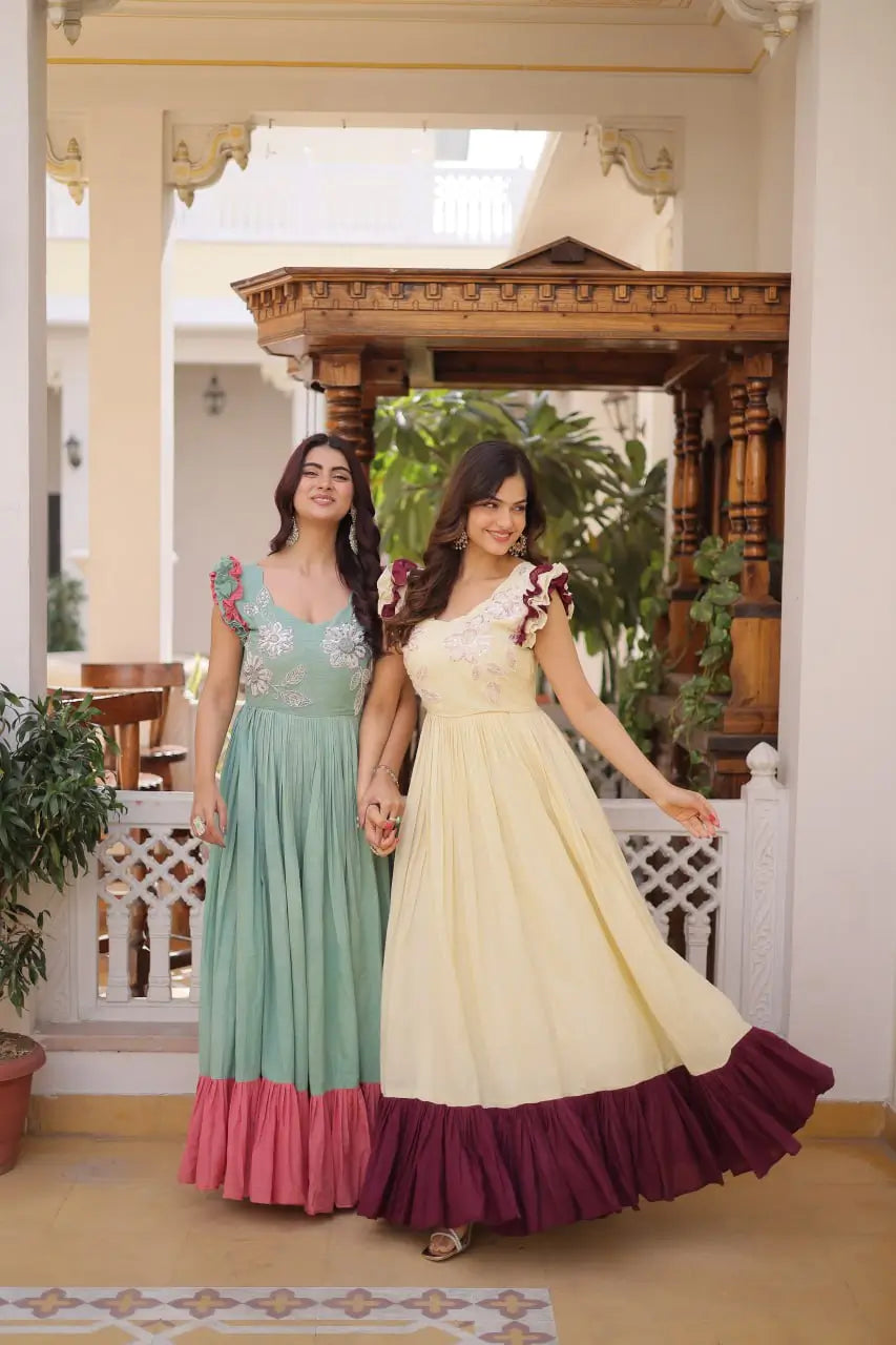 This elegant flair gown is crafted from premium cotton fabric, offering a breathable and comfortable feel with a graceful fall. The gown is beautifully enhanced with sequins, multithread embroidery, and delicate beadwork that adds a refined festive charm. Designed with a generous 7 meter flair, it creates a flowing and flattering silhouette. The sleeveless pattern with shoulder double frill stitching and a fancy round neckline adds a stylish contemporary touch. Fully lined with soft cotton from top to bottom, this gown is perfect for festive gatherings, parties, and casual celebrations where elegance and comfort go hand in hand.