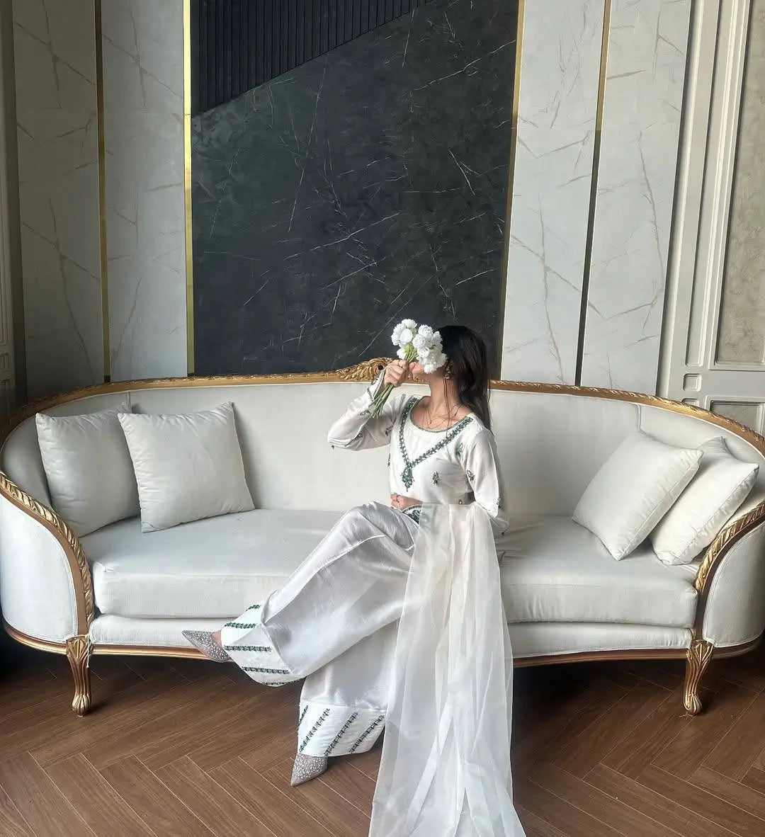 This sophisticated palazzo suit set is designed in premium heavy natural crepe, offering a sleek and graceful drape. The top features exquisite embroidery with sequin highlights, real mirror handwork, and fancy sleeves, making it a stylish choice for festive and formal occasions. With a length of 38 inches, it is fully stitched and available in M, L, XL, and XXL, paired with a soft micro cotton inner for comfort.