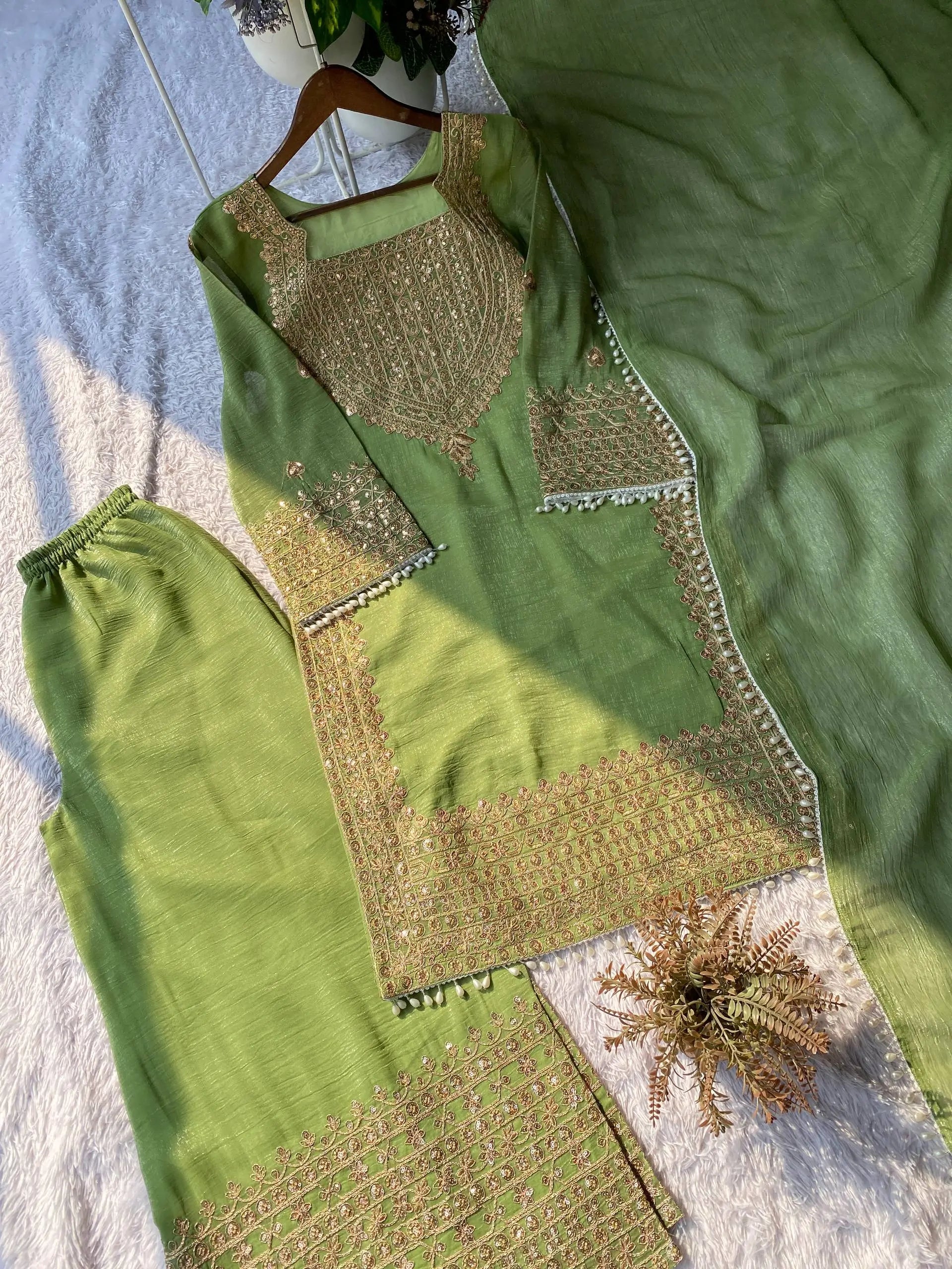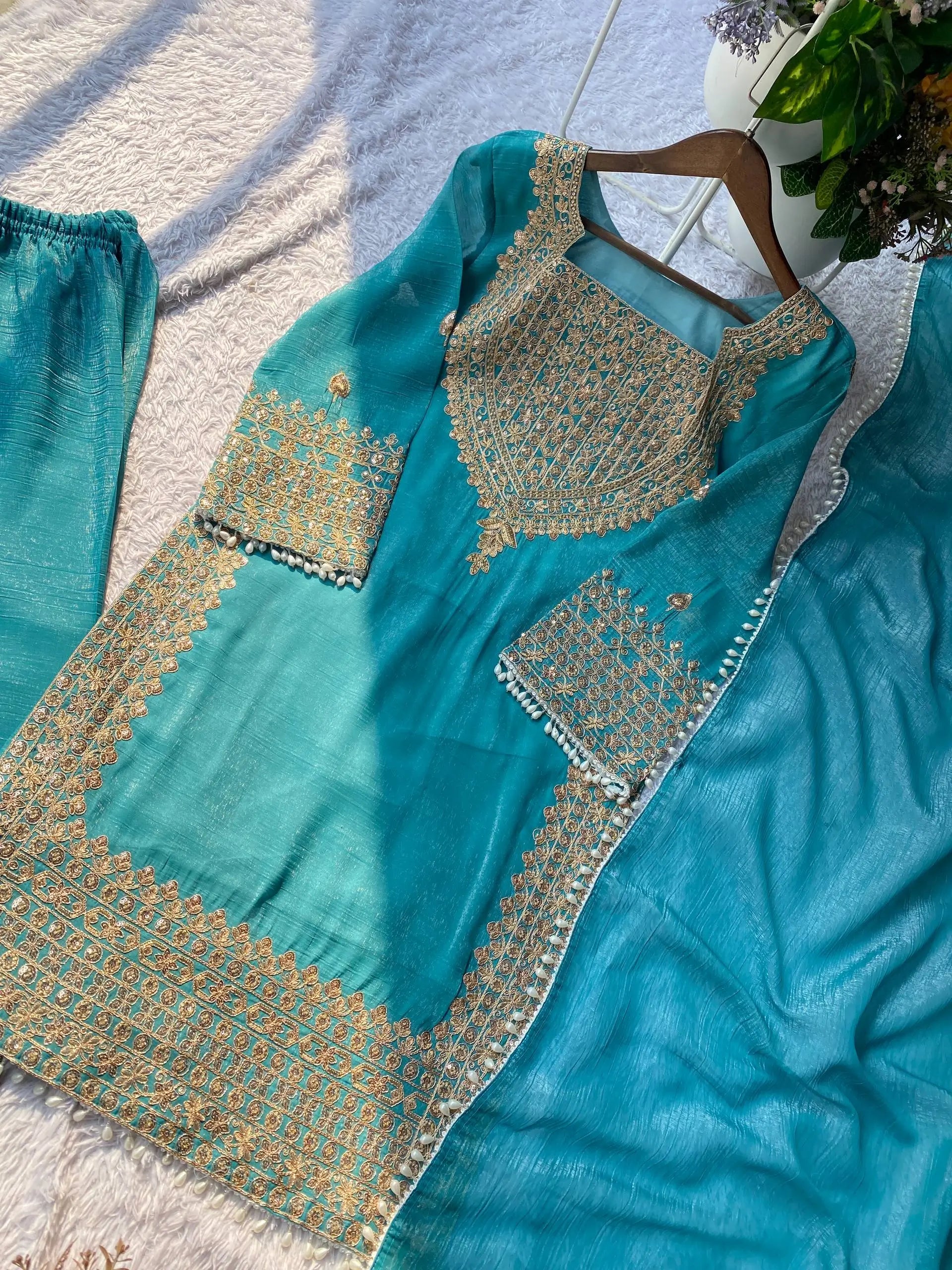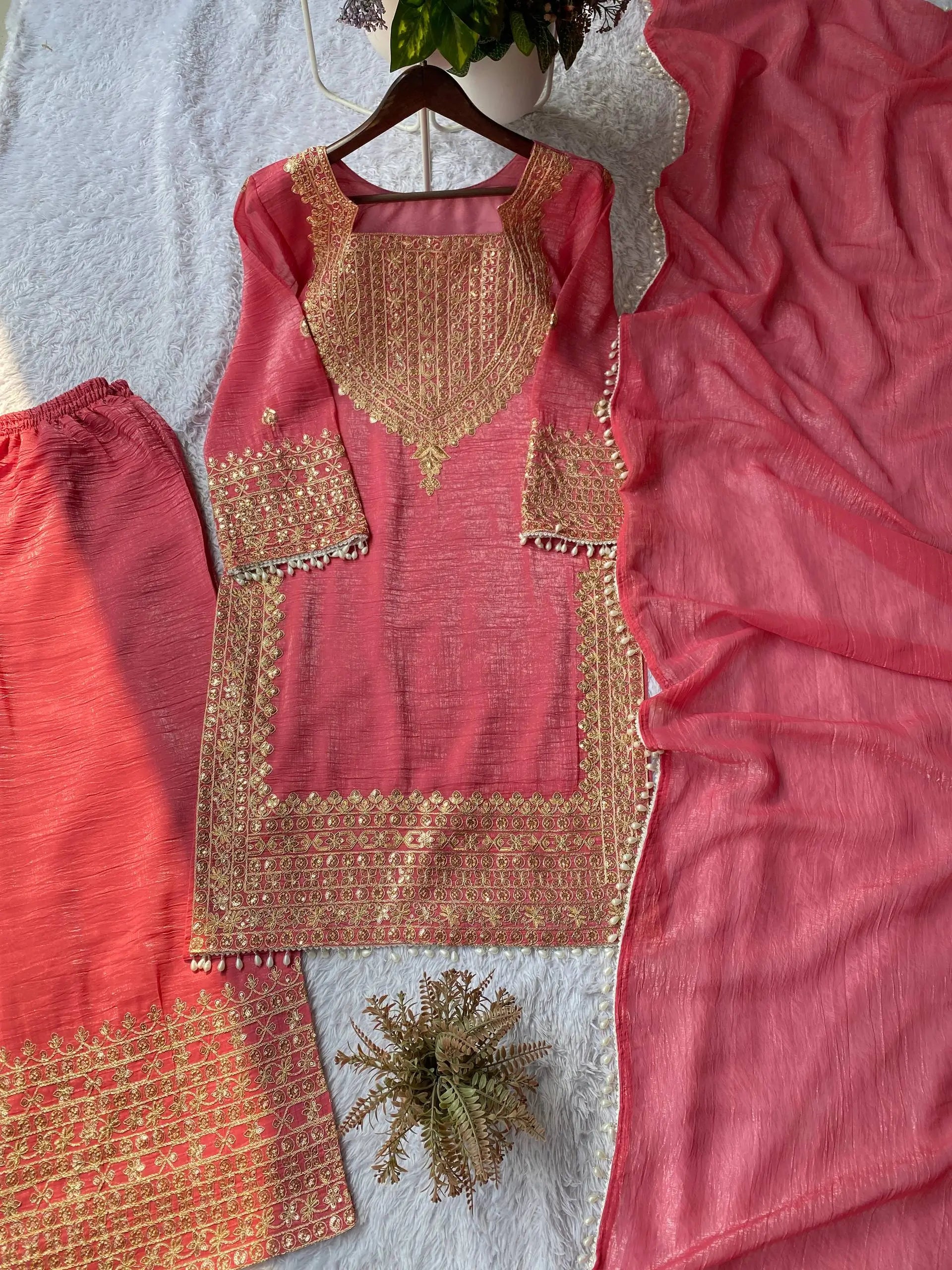 • Premium crunchy fabric for kurta, palazzo, and dupatta
