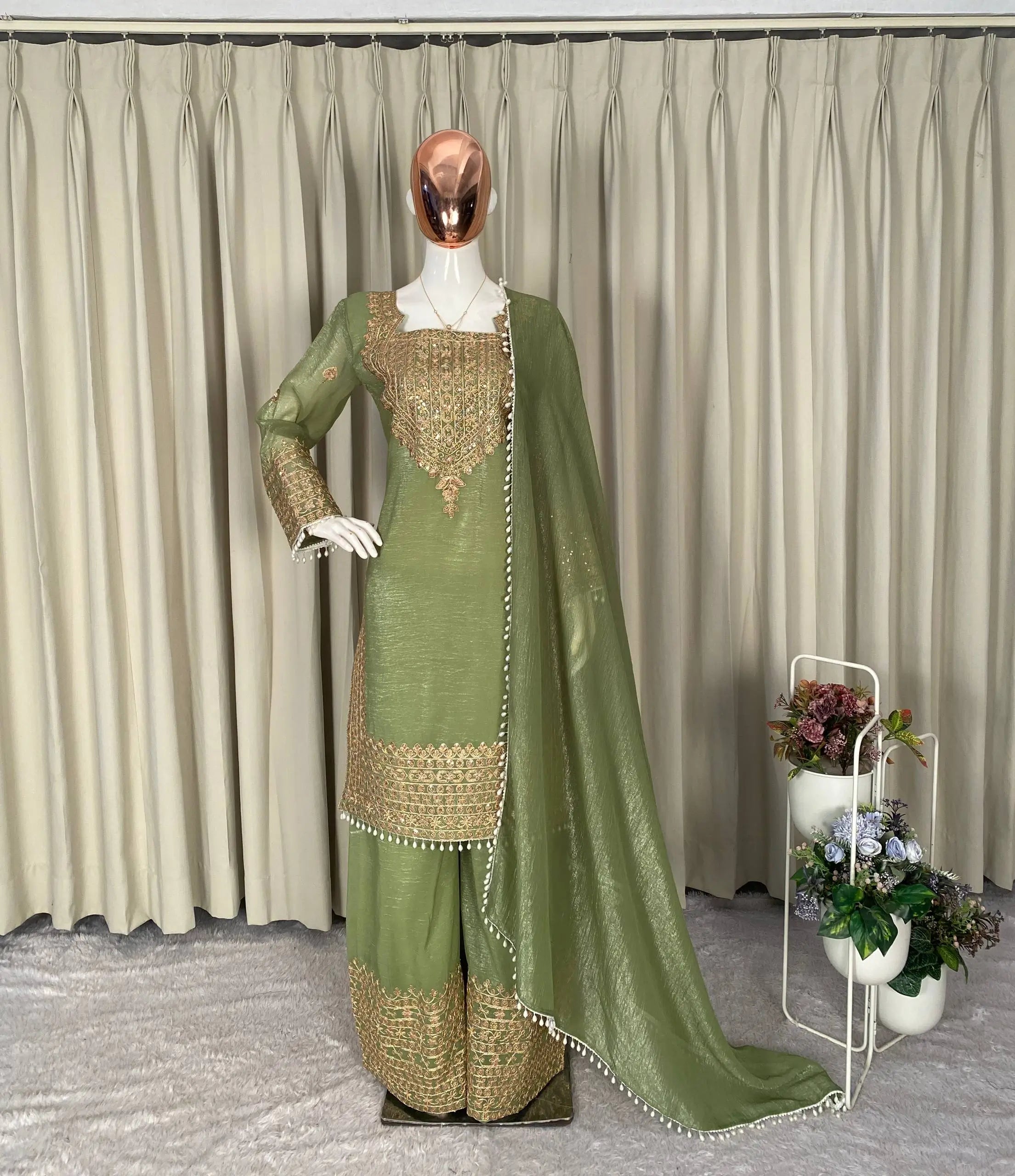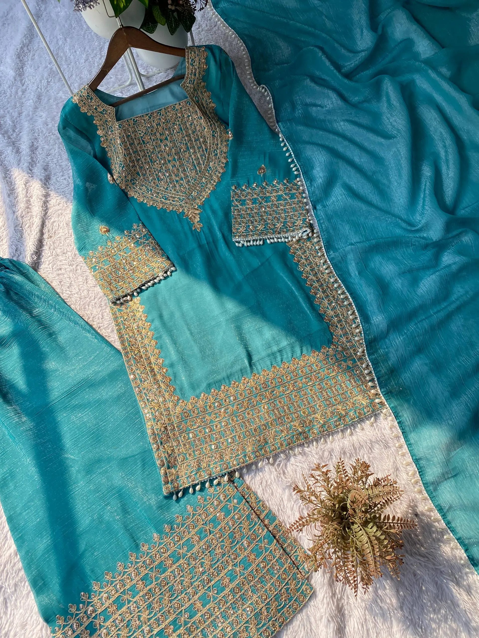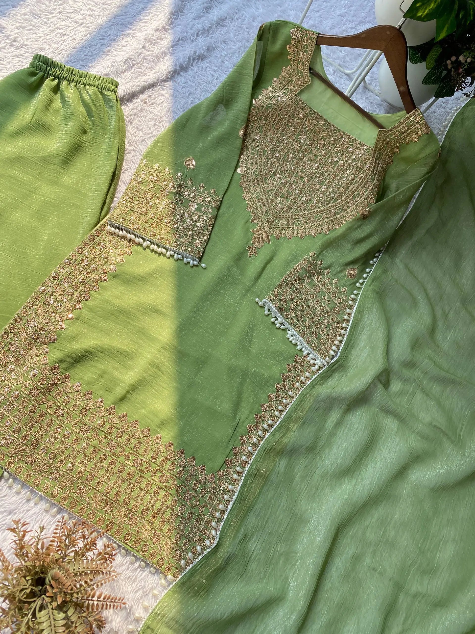 • Premium crunchy fabric for kurta, palazzo, and dupatta