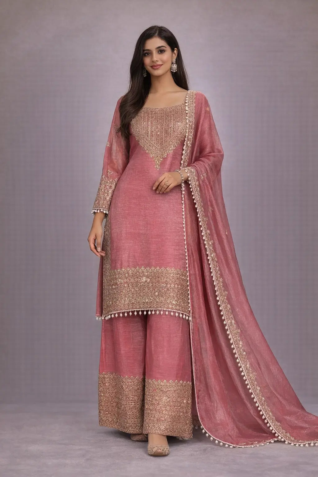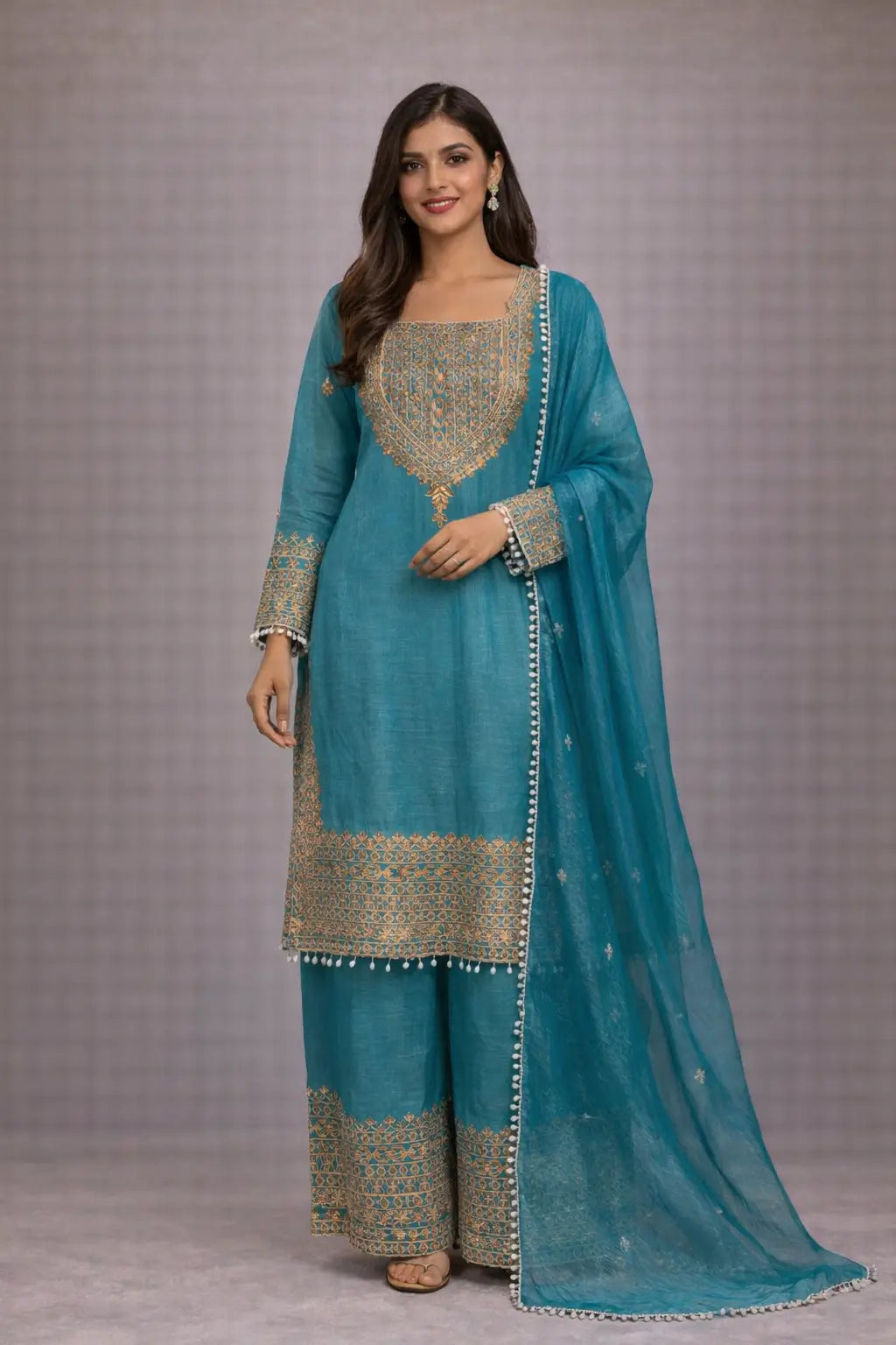 This elegant kurta palazzo set is crafted in premium crunchy fabric, designed to deliver a graceful drape with a rich festive finish. The kurta features detailed cording with sequence embroidery work, creating a refined and luxurious ethnic appeal. Soft micro lining inside the kurta ensures comfortable wear for long hours. The matching palazzo is made from the same crunchy fabric and enhanced with coordinated cording and sequence embroidery, offering a cohesive and stylish look. Completing the set is a crunchy fabric dupatta adorned with delicate kodi lace work, adding sophistication and charm. This ensemble is perfect for festive occasions, family functions, and elegant celebrations where comfort and style go hand in hand.