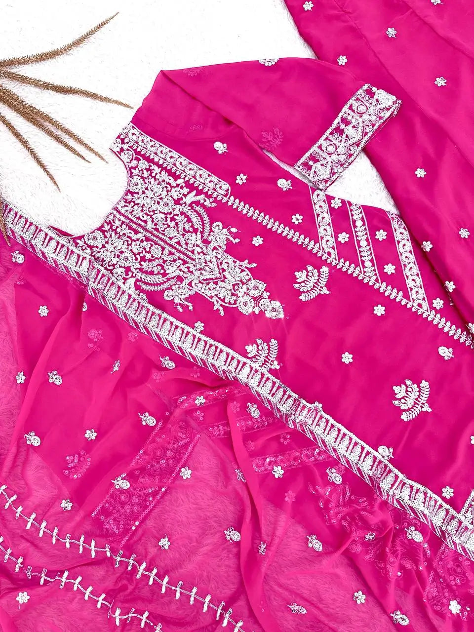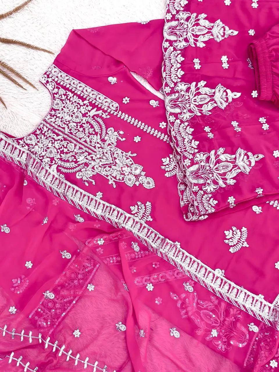 The matching plazzo is crafted from the same faux georgette fabric with coordinated embroidery along the hem for a balanced and stylish finish. The dupatta completes the outfit with embroidered sequin work that ties the entire look together. Lightweight yet rich in detailing, this set is ideal for festive gatherings, family events, and special occasions.