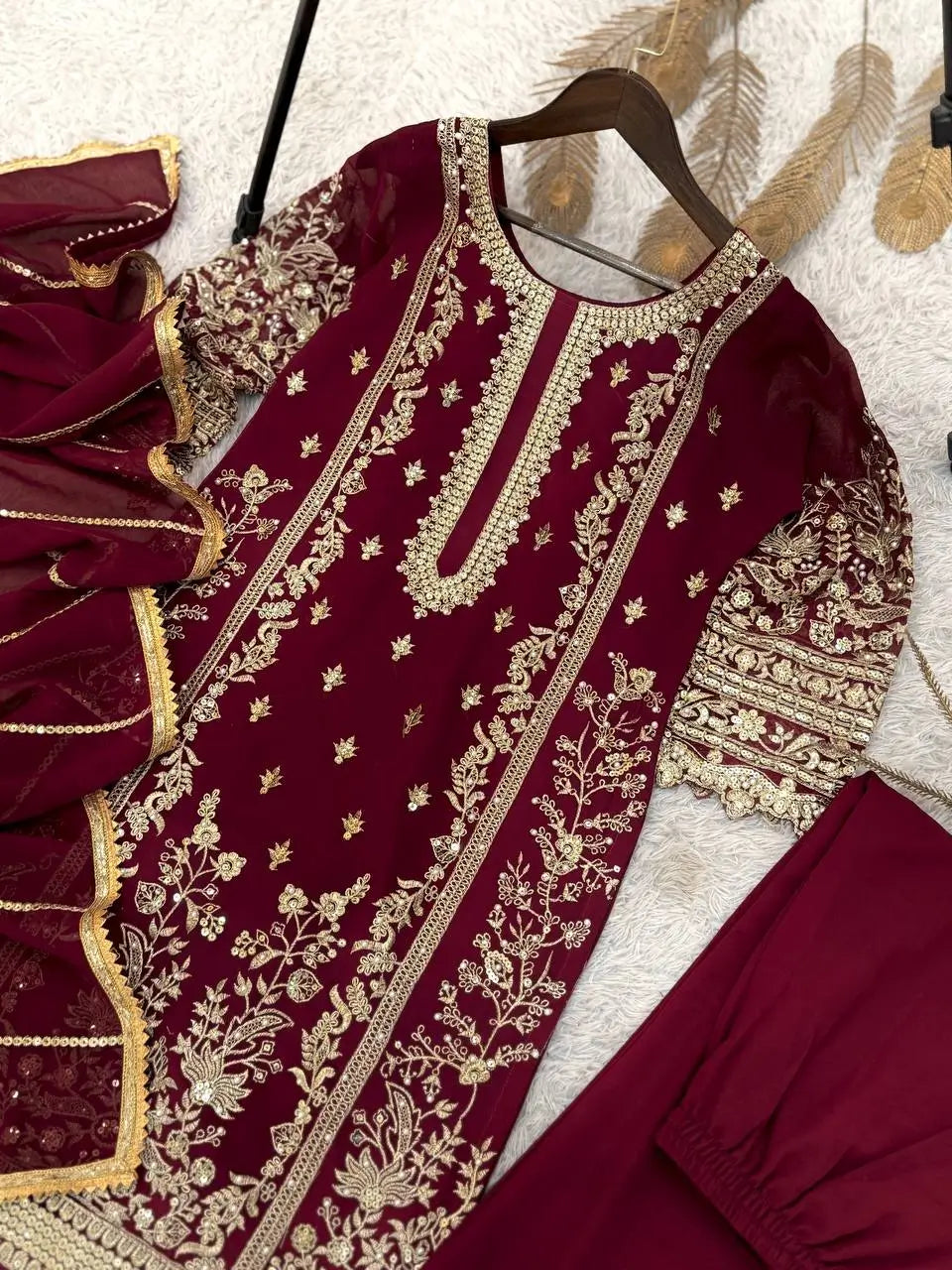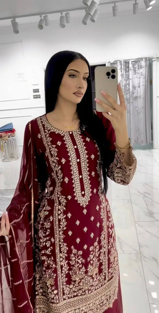 This embroidered faux georgette pant suit set is a luxurious choice for festive gatherings, weddings, and parties. The long top is crafted from premium heavy faux georgette, intricately adorned with 5mm embroidery sequence work for a refined finish. With a length of 45 inches, full sleeves, and a heavy micro cotton inner lining, it offers both style and comfort. The matching pant is also designed in heavy faux georgette with embroidery sequence work, fully stitched with a micro cotton lining for all-day ease. Completing the look is a beautifully embroidered faux georgette dupatta, measuring 2.10 meters, finished with detailed sequence work. Lightweight at 950 g, this ready-to-wear ensemble blends elegance and sophistication.