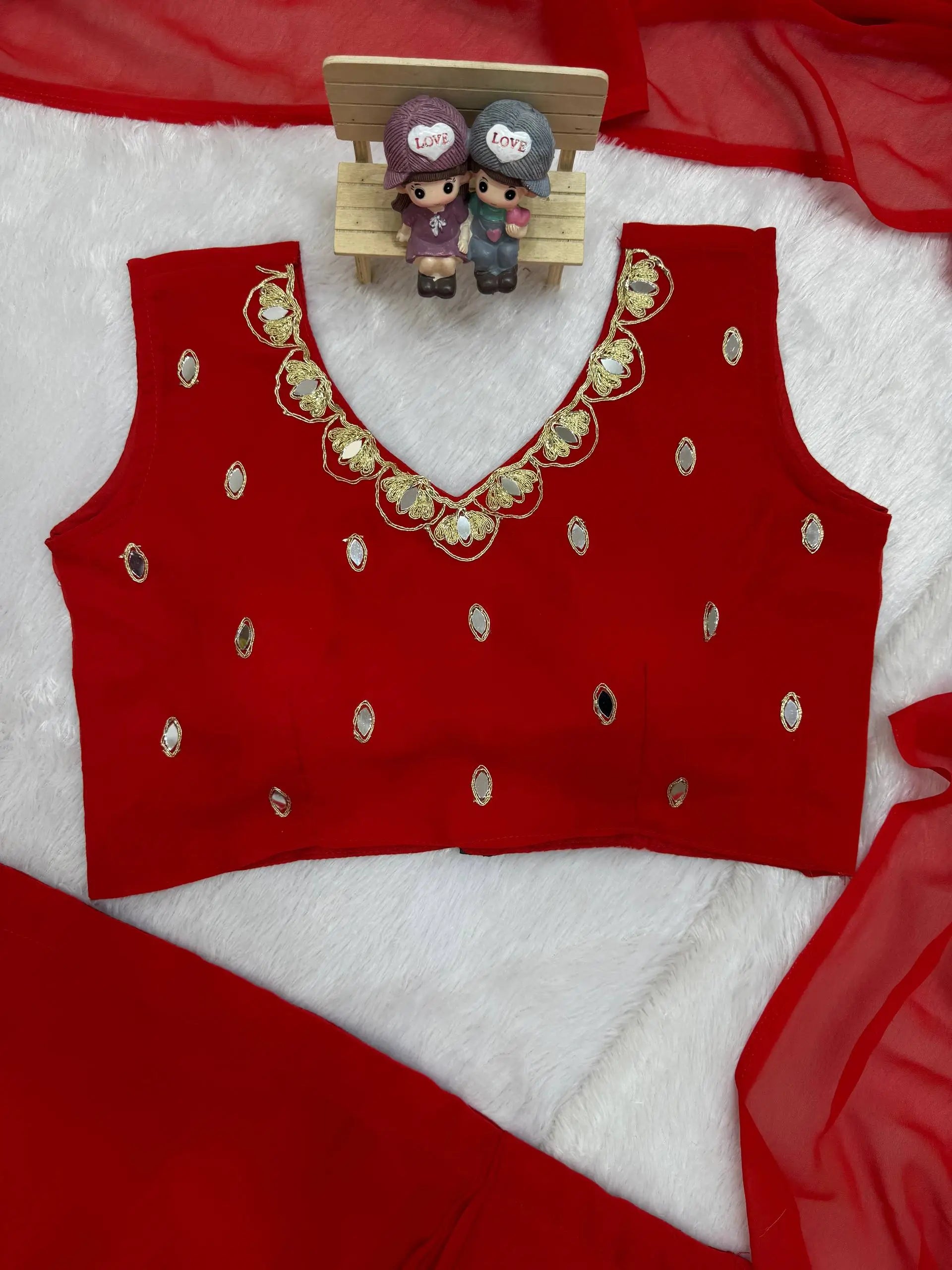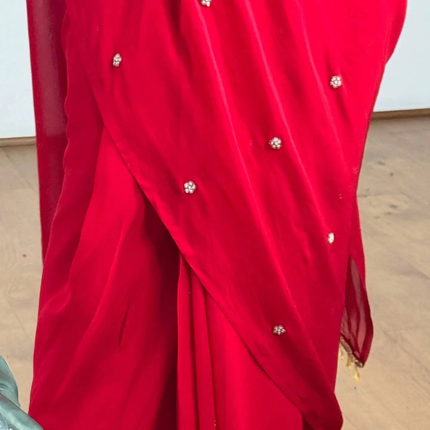 Elevate your festive and party wardrobe with this premium faux georgette saree, designed to offer elegance, comfort, and refined craftsmanship. The saree features delicate hand embroidery enhanced with real mirror and pearl work, creating a graceful shimmer that stands out without being overpowering. Crafted in a smooth drape-friendly fabric, it flows beautifully and feels lightweight for extended wear. Paired with a matching faux georgette blouse featuring embroidered mirror work on the front, this saree is ideal for festive gatherings, weddings, parties, and special occasions.