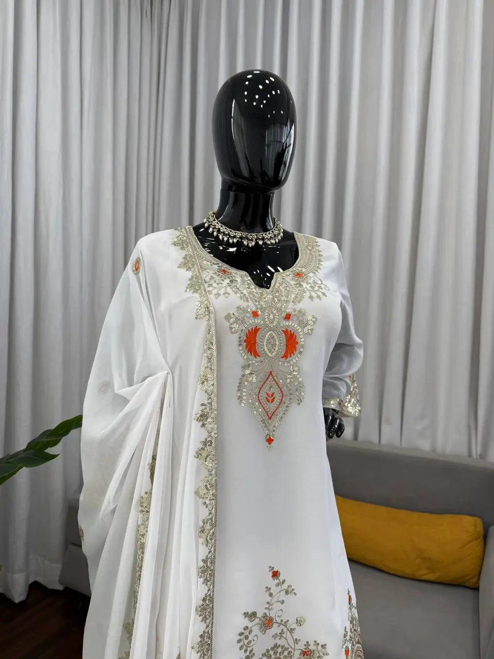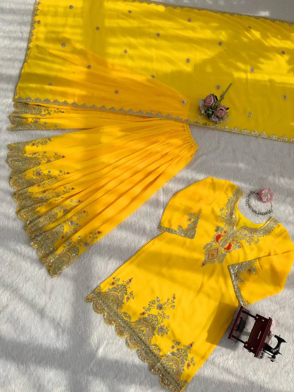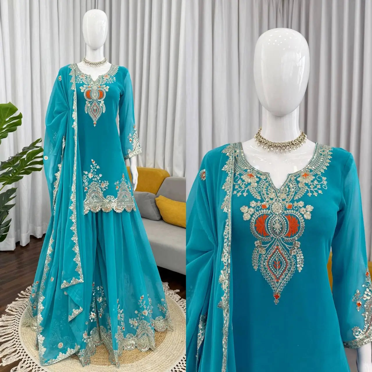 This elegant sharara suit set is crafted from premium faux georgette, offering a soft, graceful drape and a refined festive appearance. The top features intricate thread and sequin embroidery that enhances its traditional charm while maintaining a modern and polished look. A soft micro cotton inner ensures comfort throughout wear. The sharara is fully stitched in matching faux georgette with coordinated embroidery and an elastic waistband for an easy and flexible fit. The dupatta completes the ensemble with its lightweight faux georgette fabric and detailed embroidery, adding a touch of sophistication. Perfect for festive celebrations, weddings and elegant gatherings, this boutique-quality set delivers style, comfort and effortless elegance.