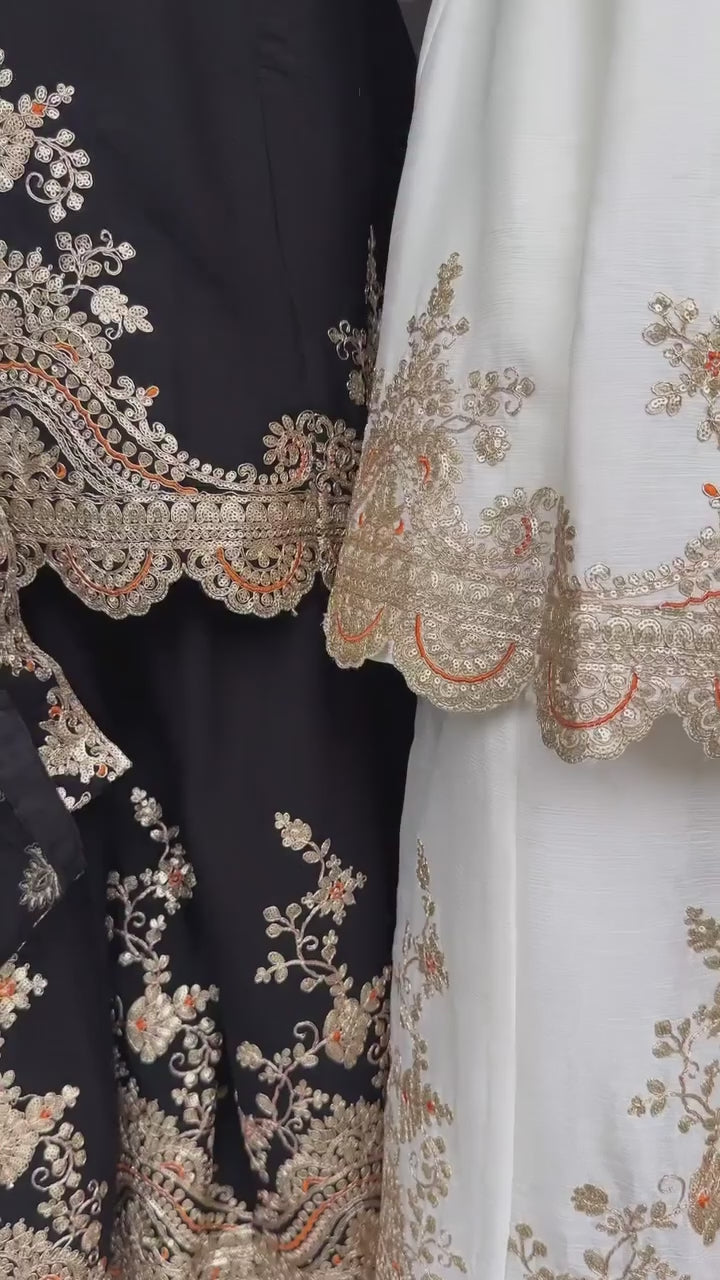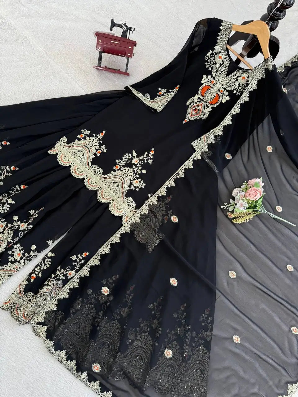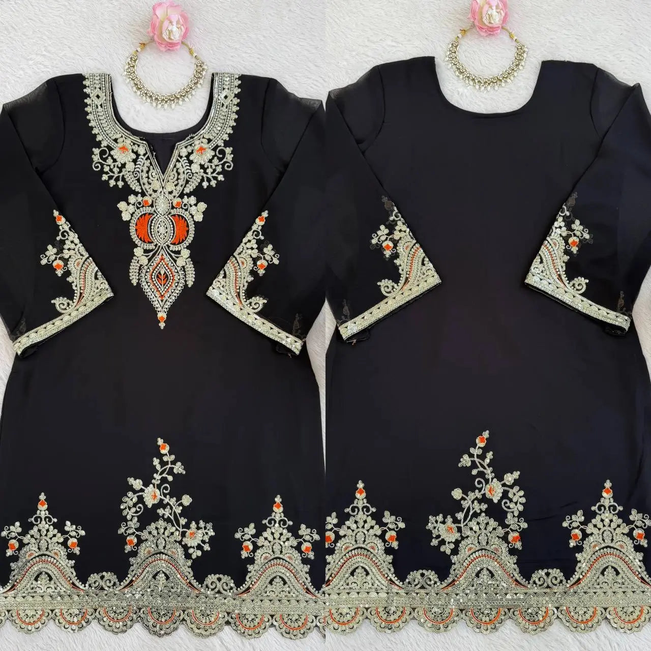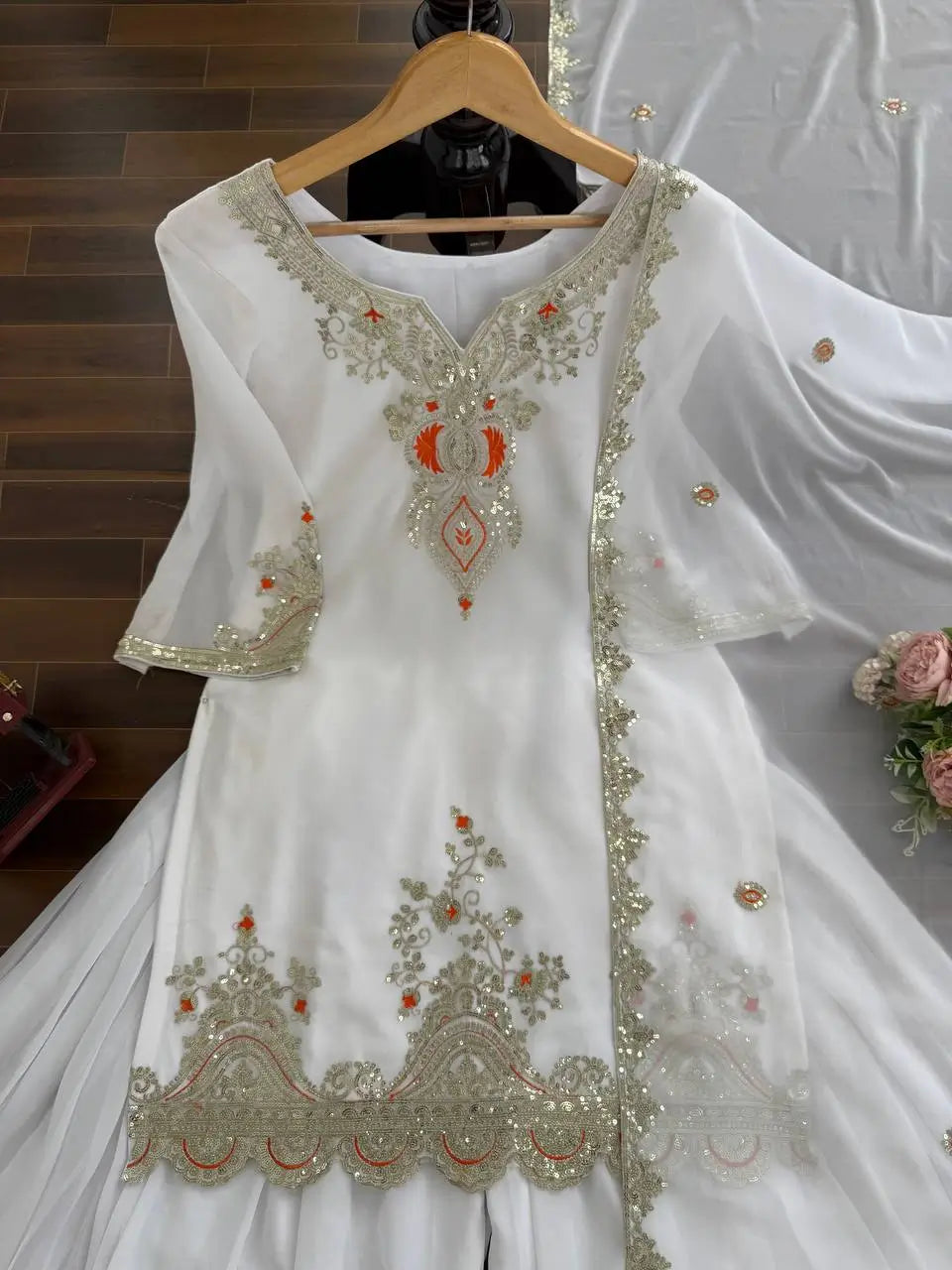 This elegant sharara suit set is crafted from premium faux georgette, offering a soft, graceful drape and a refined festive appearance. The top features intricate thread and sequin embroidery that enhances its traditional charm while maintaining a modern and polished look. A soft micro cotton inner ensures comfort throughout wear. The sharara is fully stitched in matching faux georgette with coordinated embroidery and an elastic waistband for an easy and flexible fit. The dupatta completes the ensemble with its lightweight faux georgette fabric and detailed embroidery, adding a touch of sophistication. Perfect for festive celebrations, weddings and elegant gatherings, this boutique-quality set delivers style, comfort and effortless elegance.