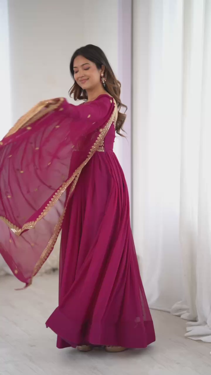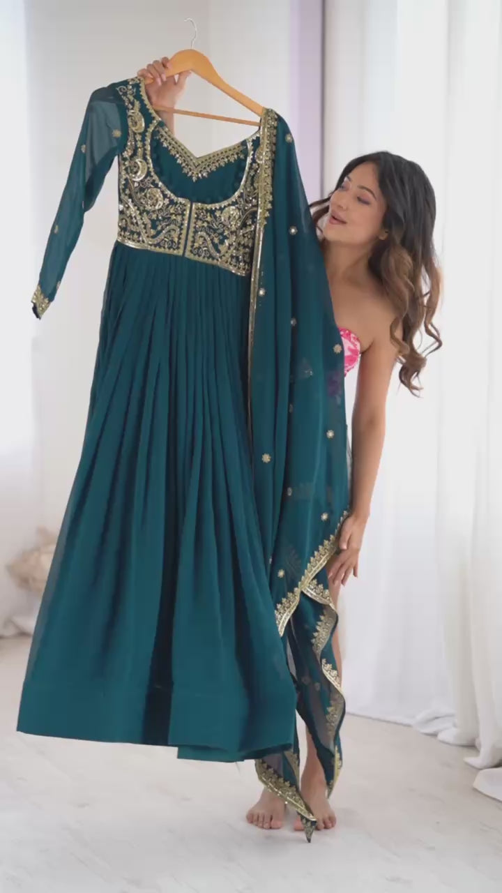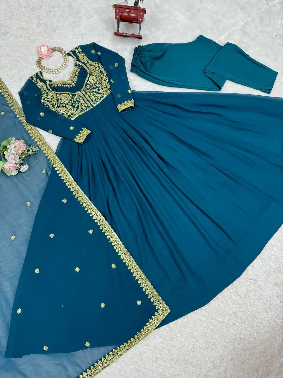 This elegant suit set is crafted from premium faux georgette fabric, offering a soft, flowing drape and a polished festive appearance. The top features intricate designer embroidery with sequin and thread detailing that enhances its refined and luxurious look. A soft micro inner ensures comfort and smooth wear throughout the day. The matching pant is fully stitched in micro fabric with an elastic waistband for easy movement and a flexible fit. The dupatta completes the ensemble with its faux georgette fabric and beautifully detailed embroidery, adding grace and sophistication. Perfect for festive events, parties and elegant day occasions, this outfit combines style, comfort and craftsmanship in a ready-to-wear package.