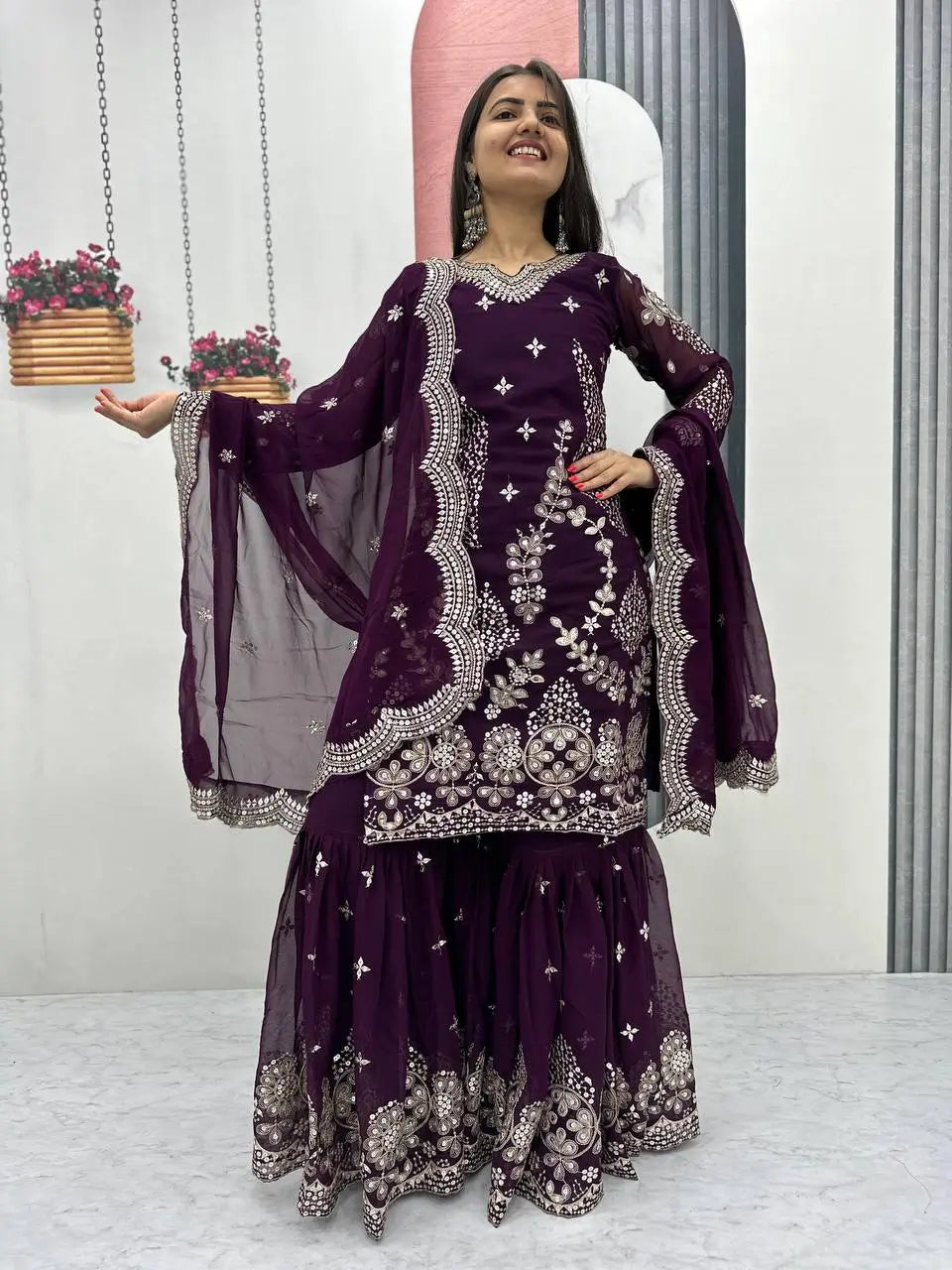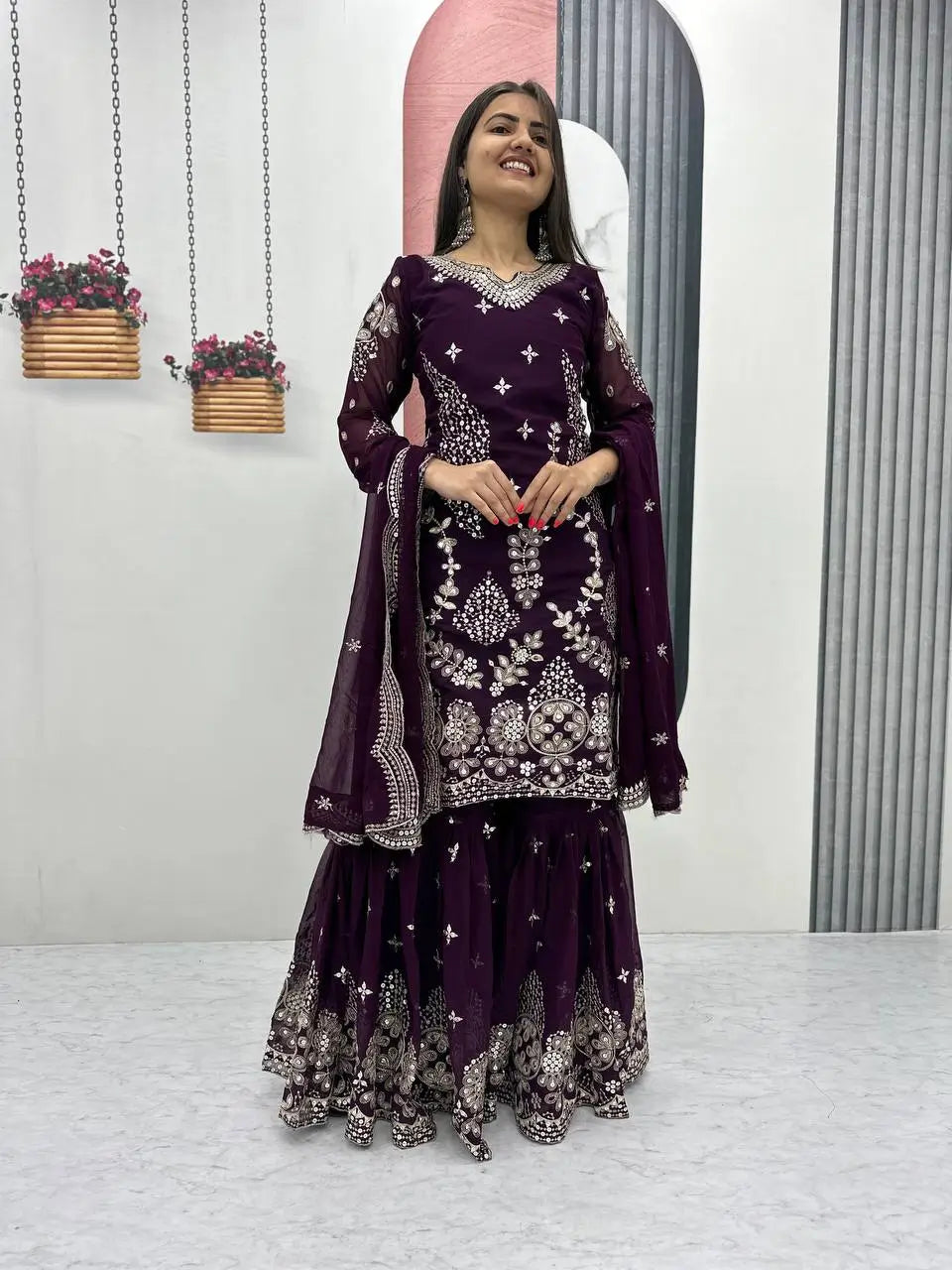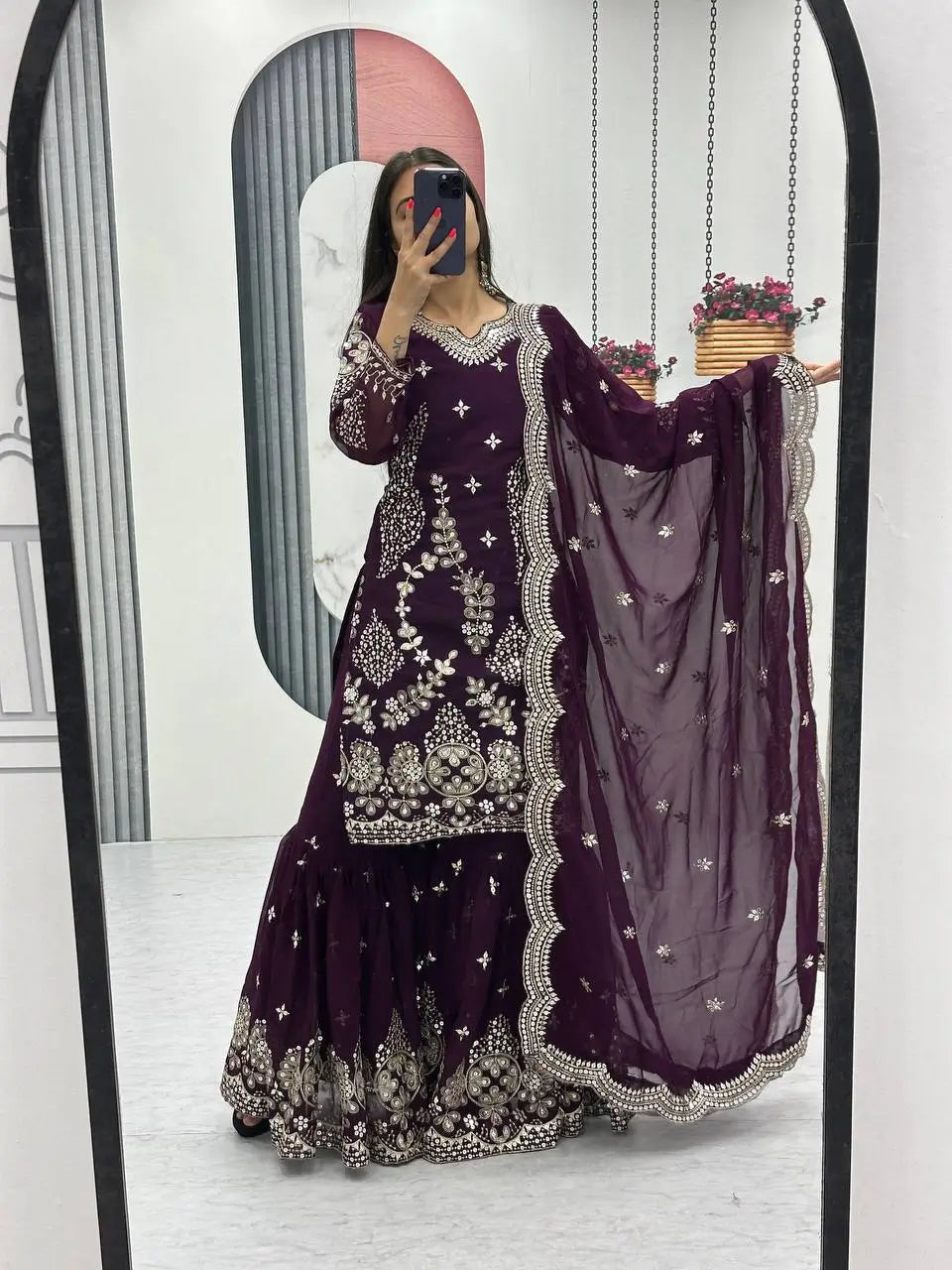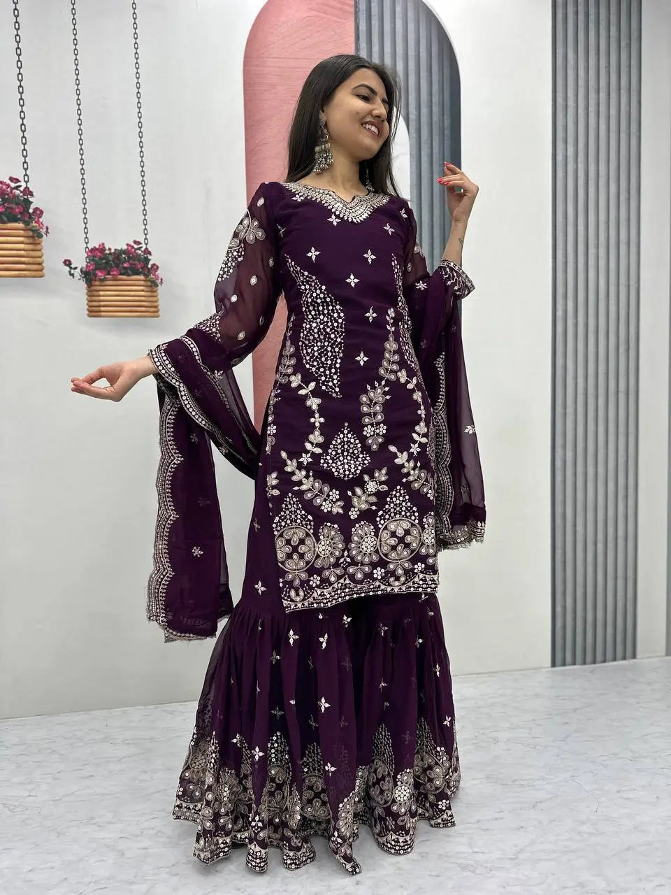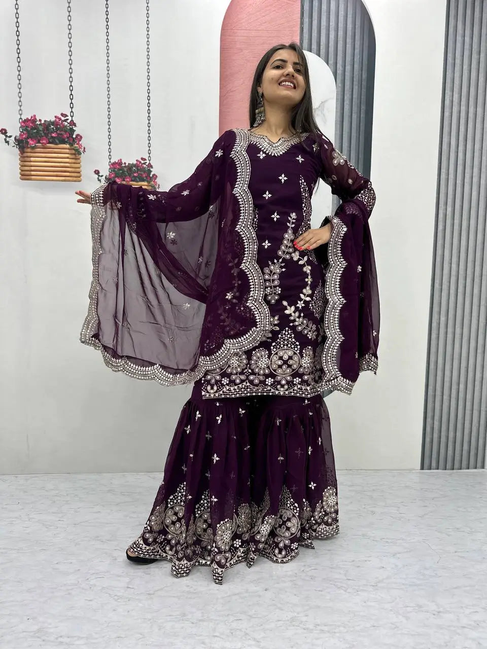 This elegant sharara set is crafted from soft fox georgette and finished with rich thread and sequence embroidery that gives it a festive and luxurious look. The top features detailed embroidery along the neckline, sleeves, and hem, paired with a micro cotton inner for comfort. Its 32 inch length creates a balanced silhouette that pairs beautifully with the fully embroidered sharara. The sharara is designed in matching fox georgette with a micro cotton lining, offering a graceful fall and comfortable movement. The set is completed with an embroidered dupatta measuring 2.25 meters, adding the perfect finishing touch for celebrations and special occasions.