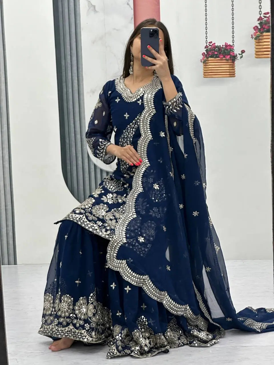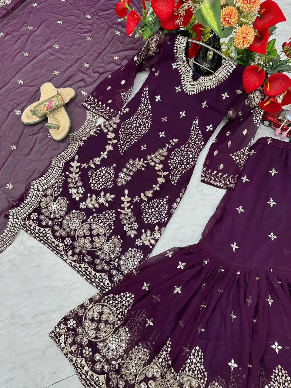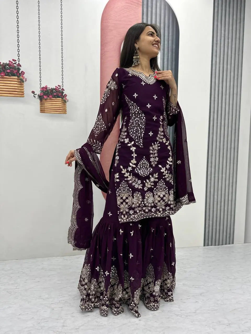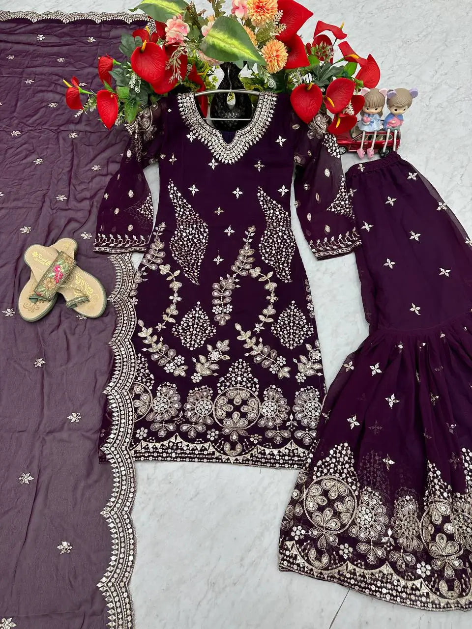 This elegant sharara set is crafted from soft fox georgette and finished with rich thread and sequence embroidery that gives it a festive and luxurious look. The top features detailed embroidery along the neckline, sleeves, and hem, paired with a micro cotton inner for comfort. Its 32 inch length creates a balanced silhouette that pairs beautifully with the fully embroidered sharara. The sharara is designed in matching fox georgette with a micro cotton lining, offering a graceful fall and comfortable movement. The set is completed with an embroidered dupatta measuring 2.25 meters, adding the perfect finishing touch for celebrations and special occasions.