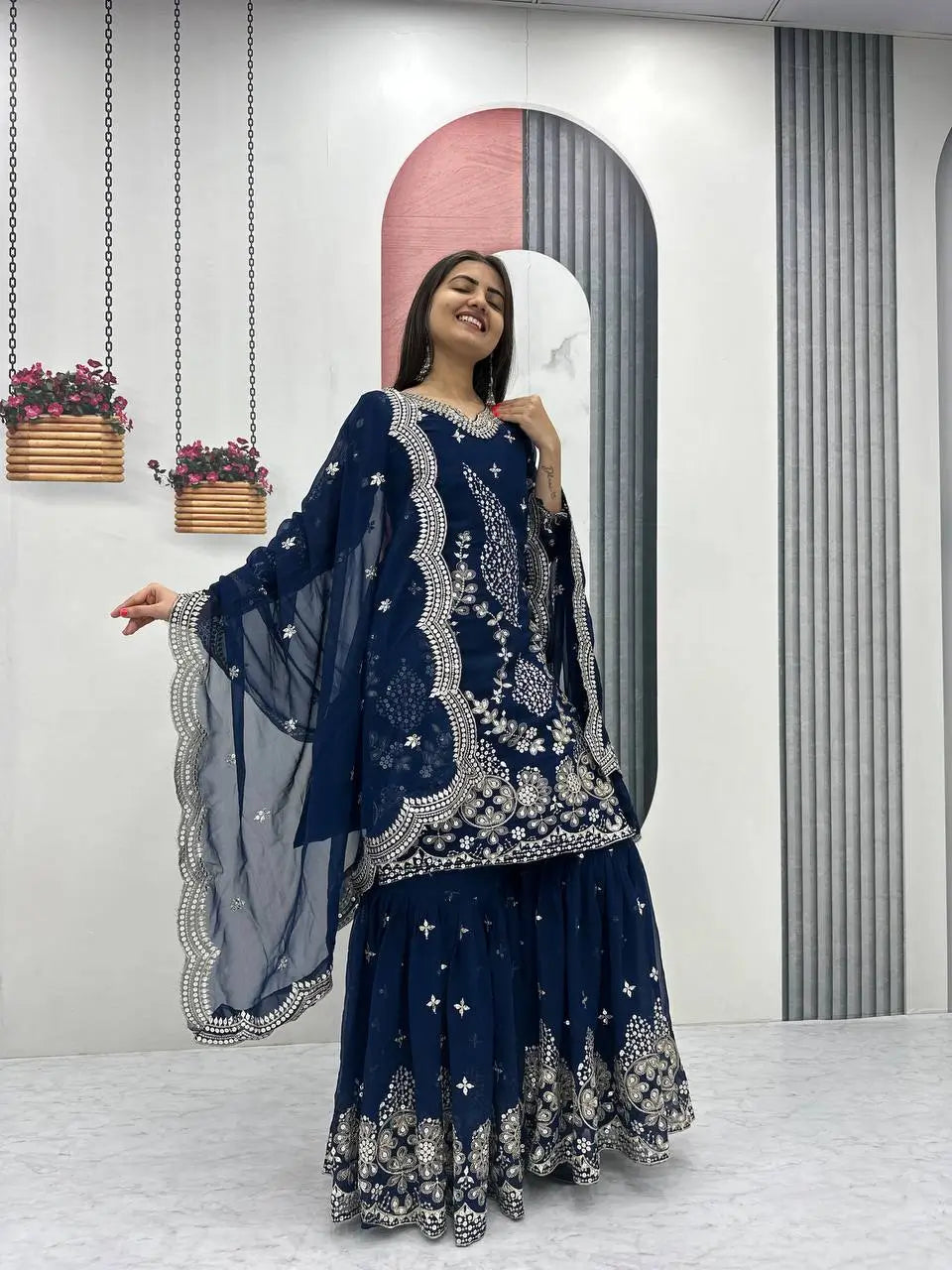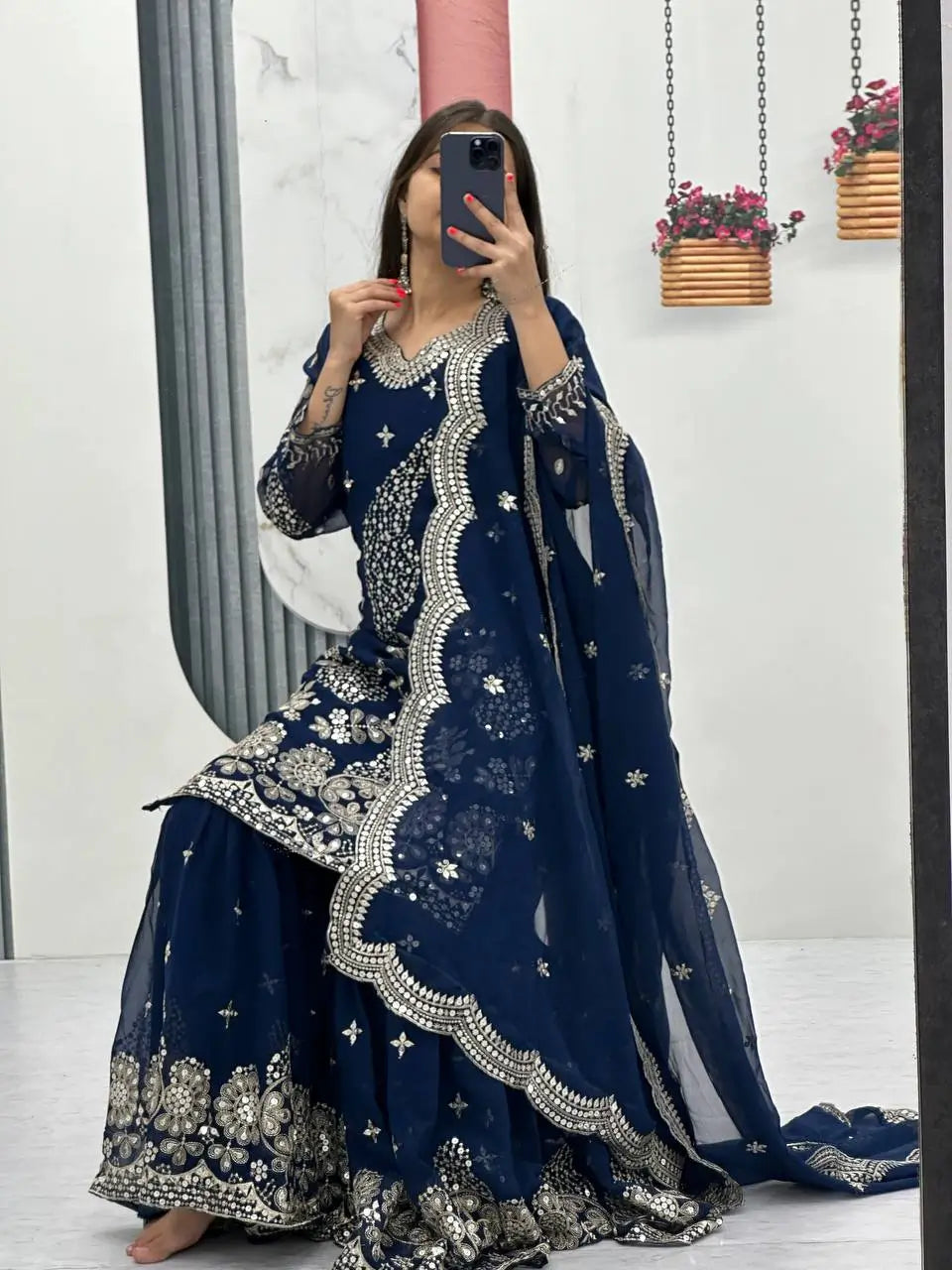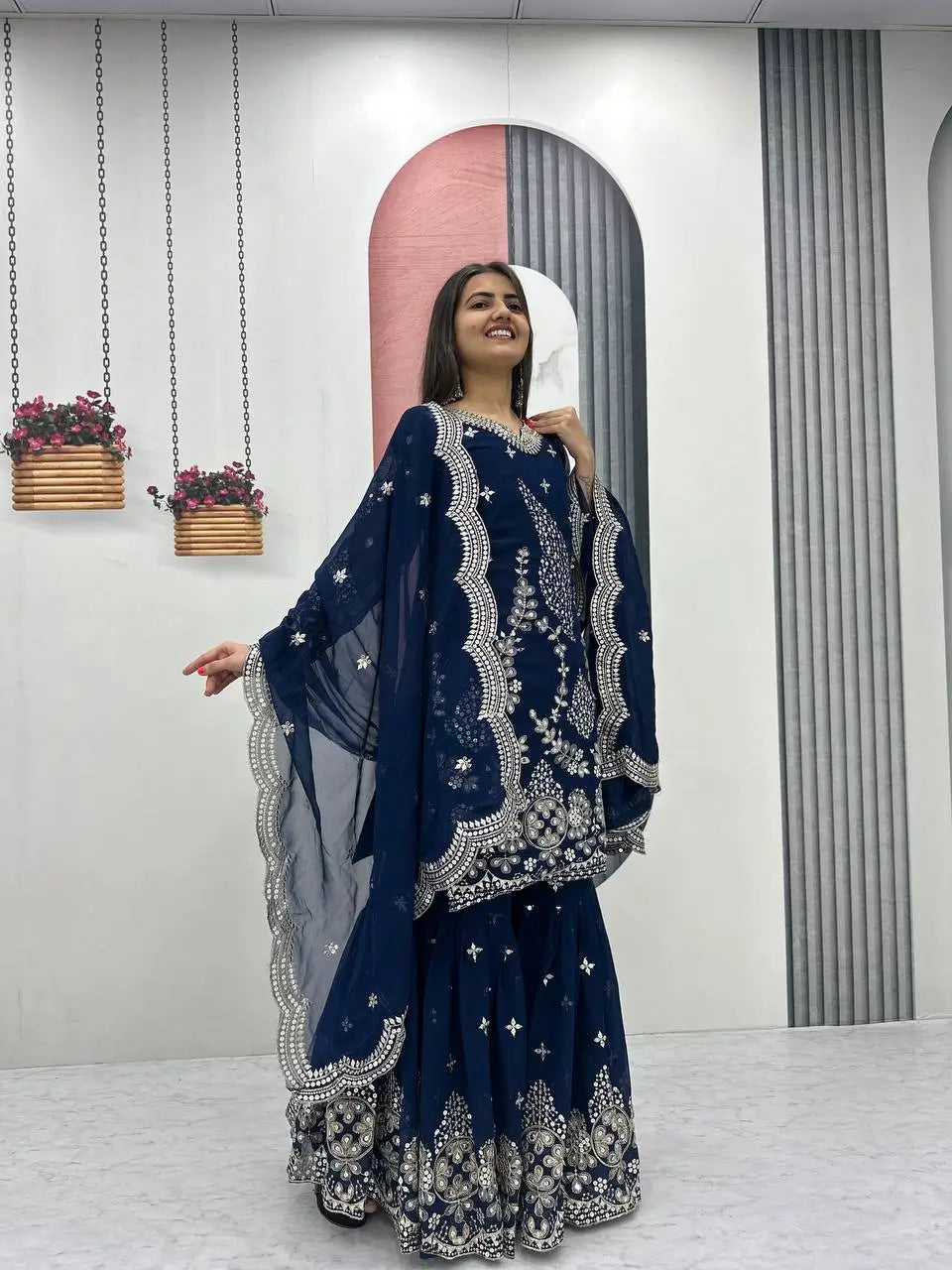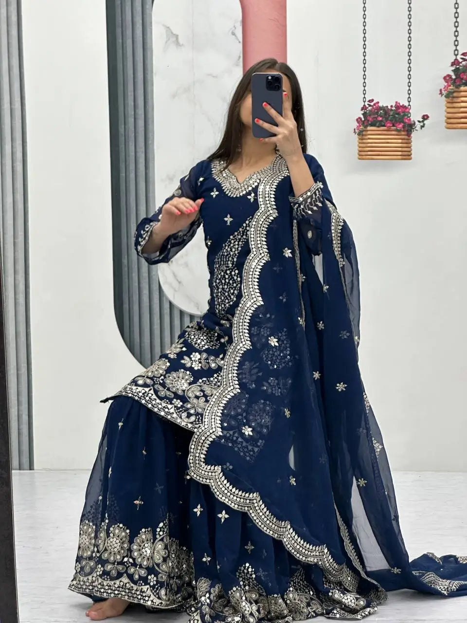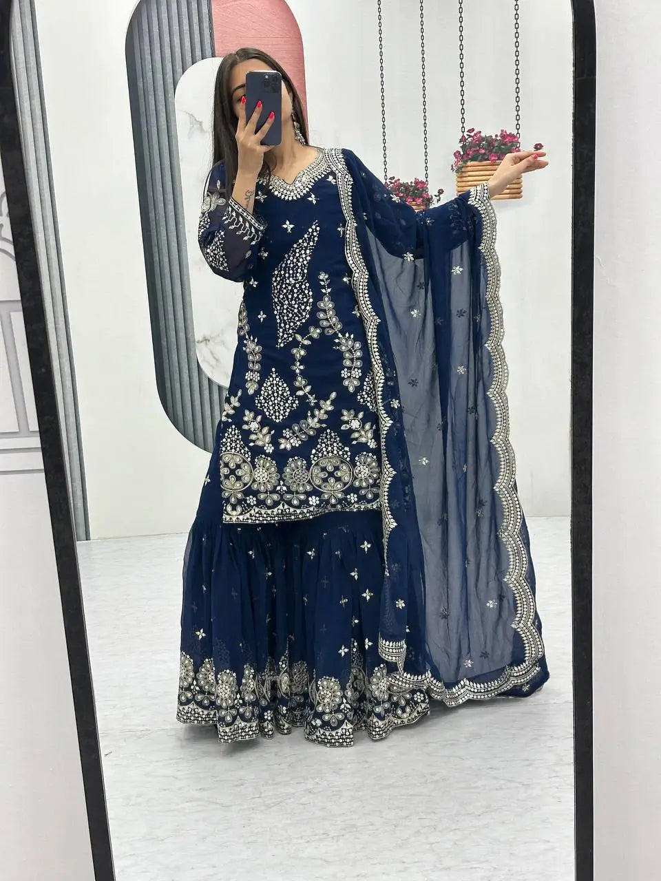 This elegant sharara set is crafted from soft fox georgette and finished with rich thread and sequence embroidery that gives it a festive and luxurious look. The top features detailed embroidery along the neckline, sleeves, and hem, paired with a micro cotton inner for comfort. Its 32 inch length creates a balanced silhouette that pairs beautifully with the fully embroidered sharara. The sharara is designed in matching fox georgette with a micro cotton lining, offering a graceful fall and comfortable movement. The set is completed with an embroidered dupatta measuring 2.25 meters, adding the perfect finishing touch for celebrations and special occasions.