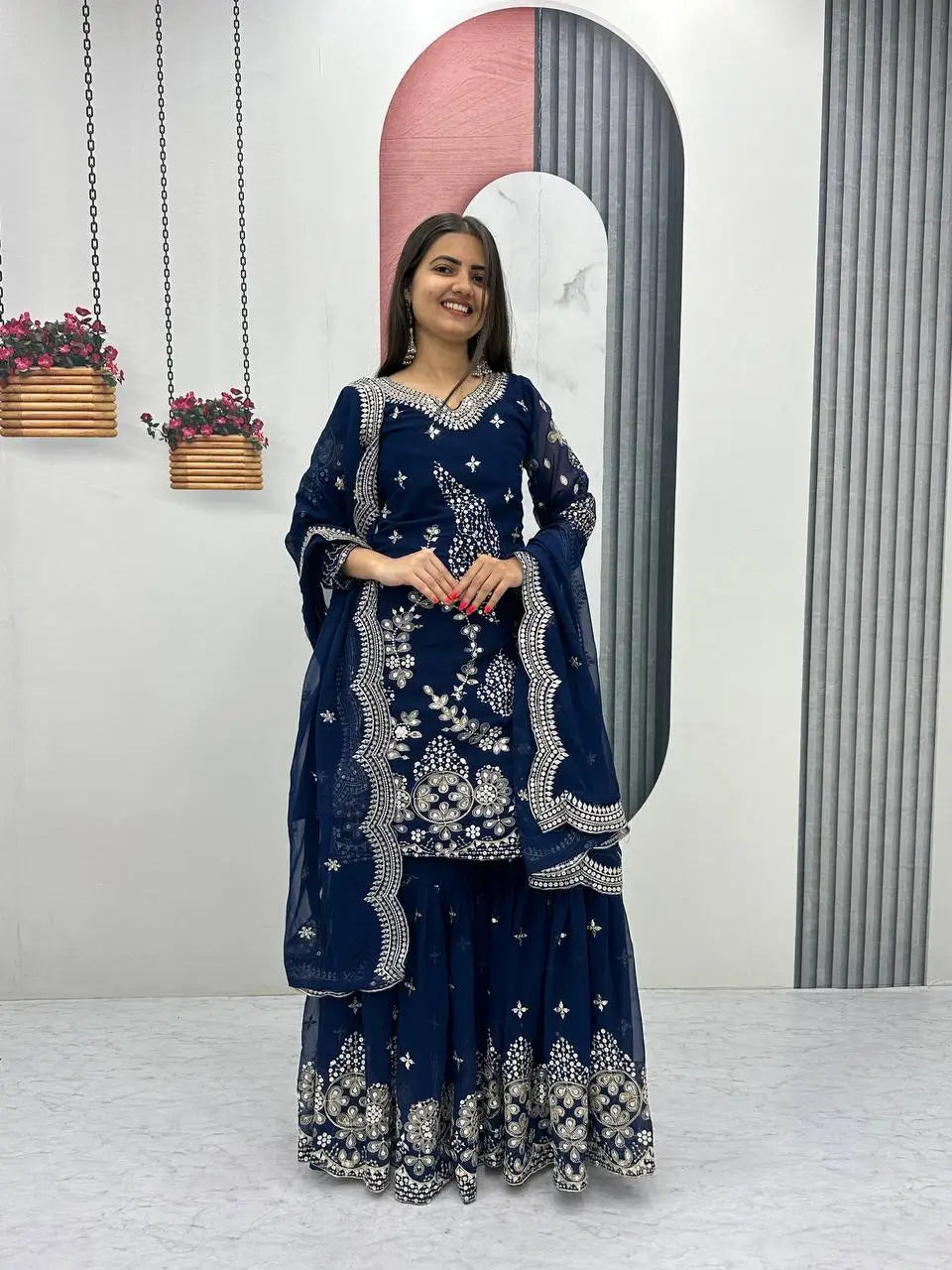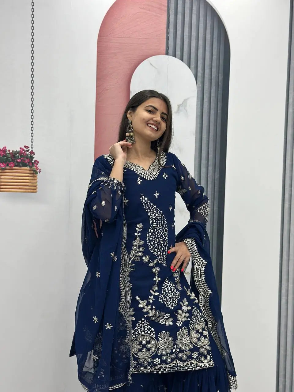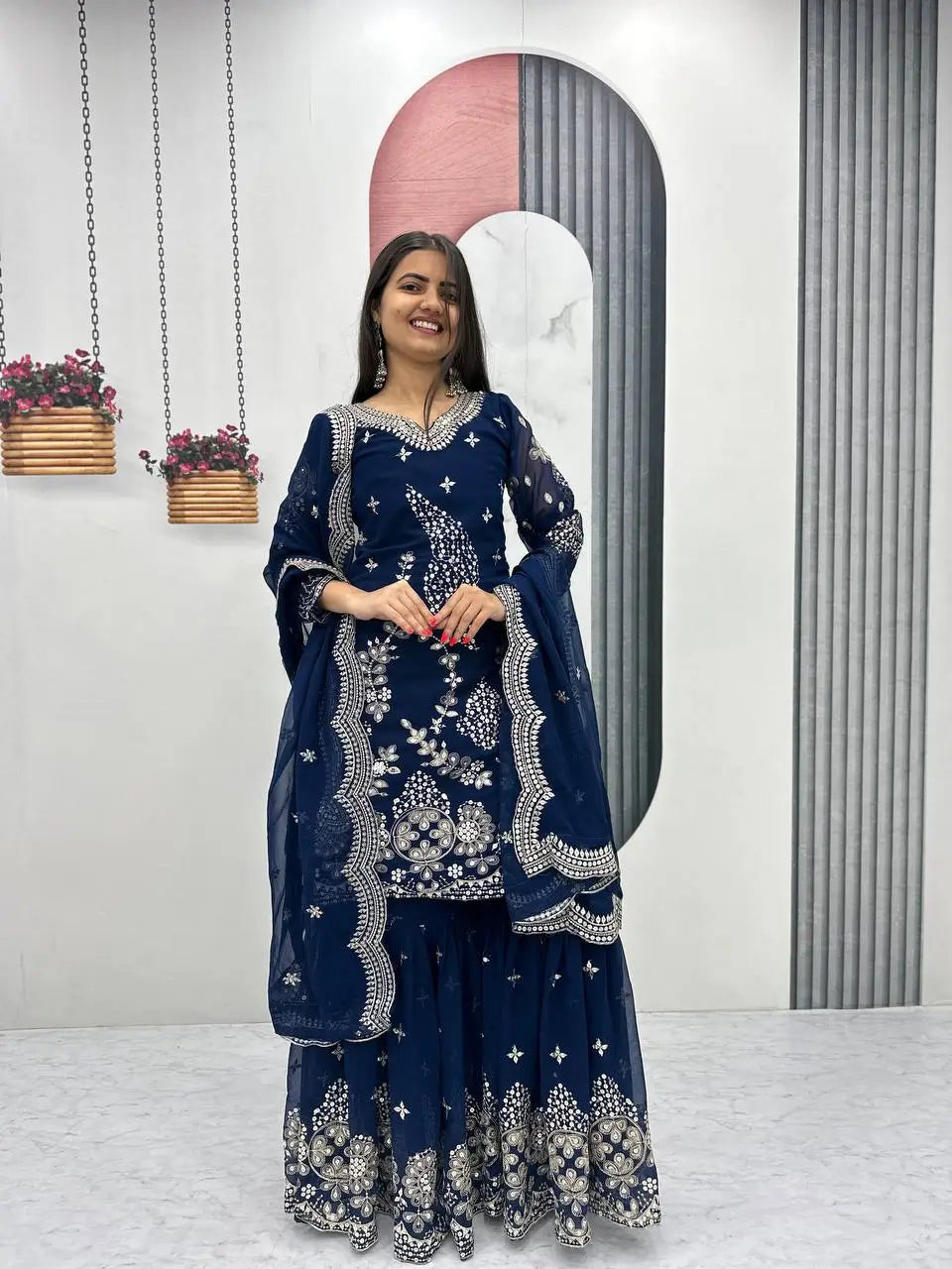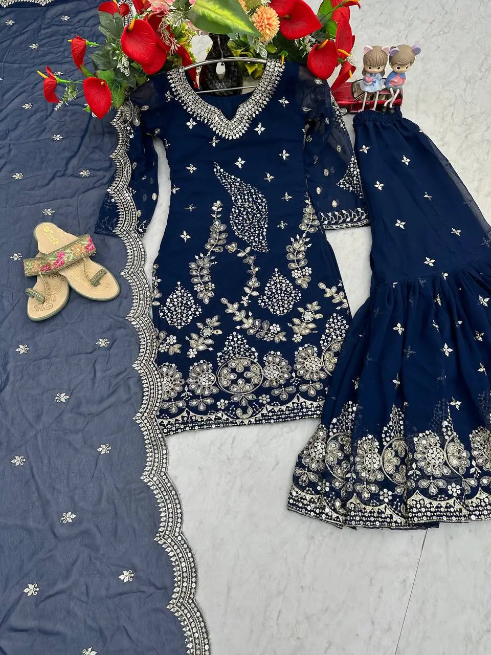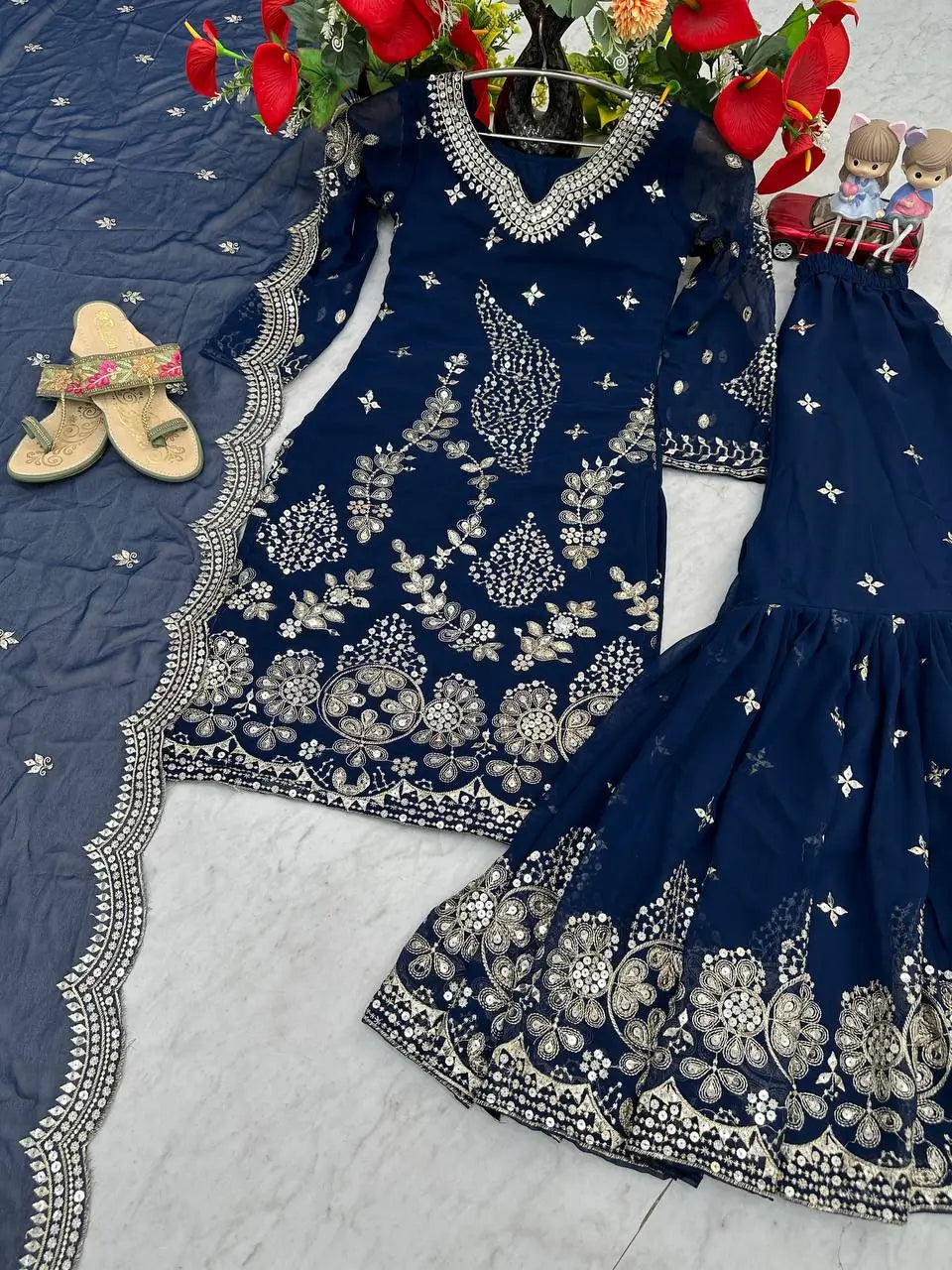 This elegant sharara set is crafted from soft fox georgette and finished with rich thread and sequence embroidery that gives it a festive and luxurious look. The top features detailed embroidery along the neckline, sleeves, and hem, paired with a micro cotton inner for comfort. Its 32 inch length creates a balanced silhouette that pairs beautifully with the fully embroidered sharara. The sharara is designed in matching fox georgette with a micro cotton lining, offering a graceful fall and comfortable movement. The set is completed with an embroidered dupatta measuring 2.25 meters, adding the perfect finishing touch for celebrations and special occasions.