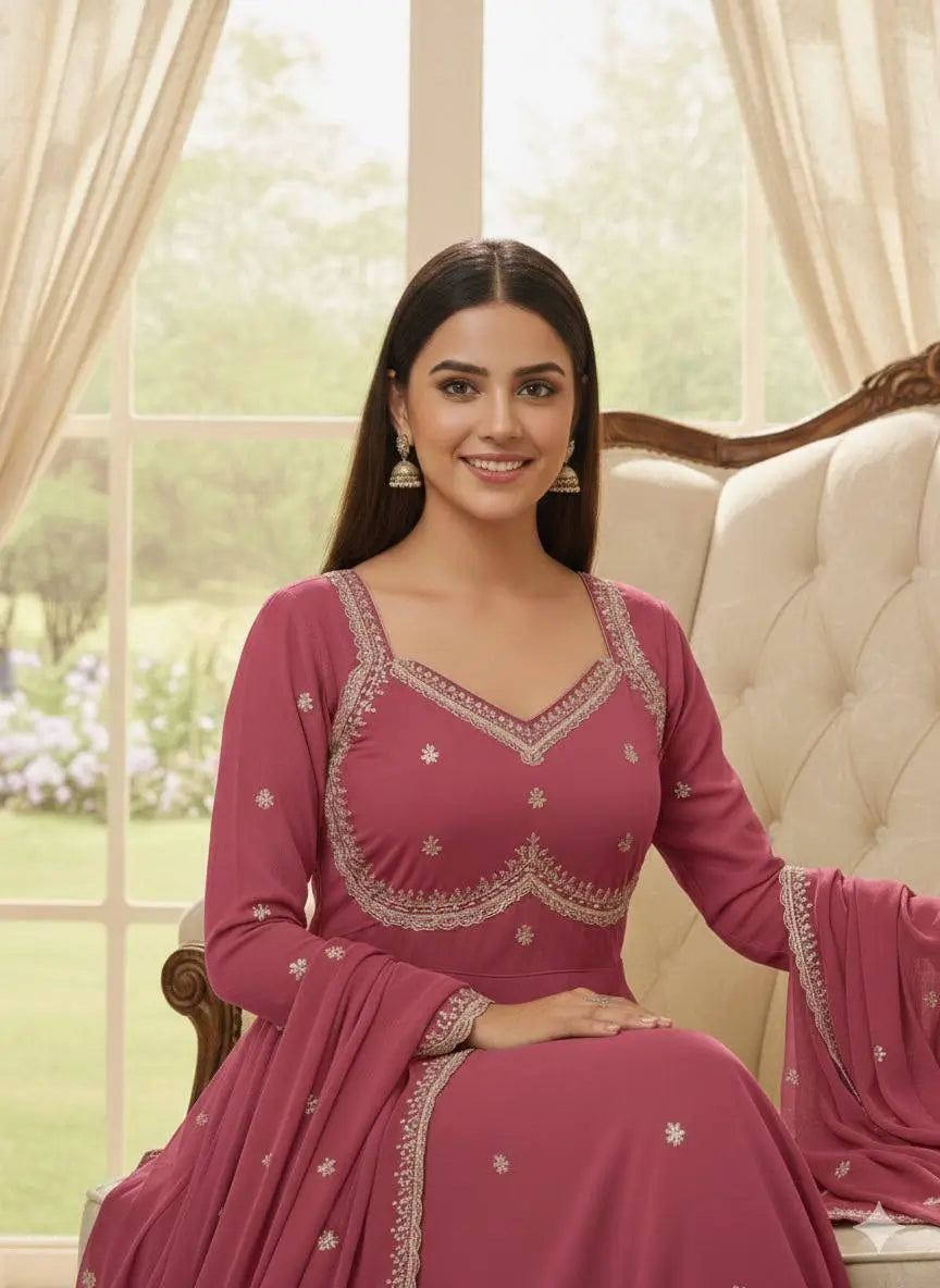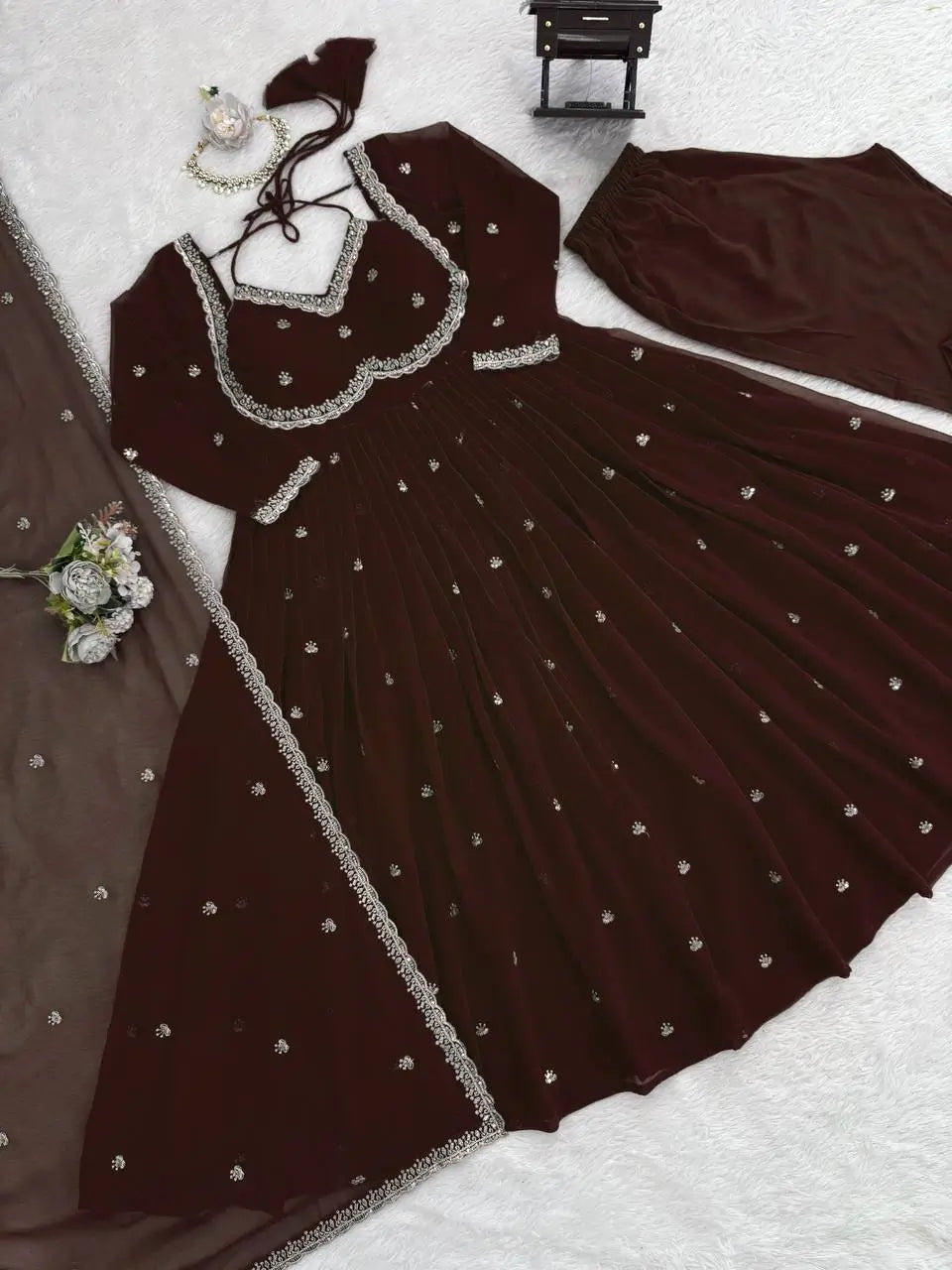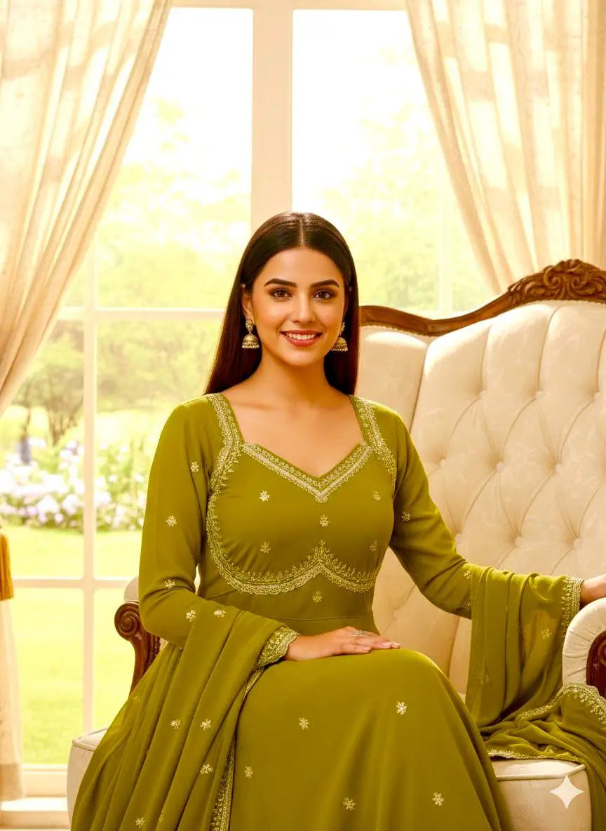 This premium gown set is crafted from heavy fox georgette fabric, offering a rich fall and a luxurious festive sheen. The gown features an elegant Sabiya Chachi style neckline, detailed with rembo sequence embroidery across the neck and sleeves. With a graceful umbrella flare of 4 meters and a comfortable American heavy butter cotton inner, the outfit ensures both style and comfort for long wear.