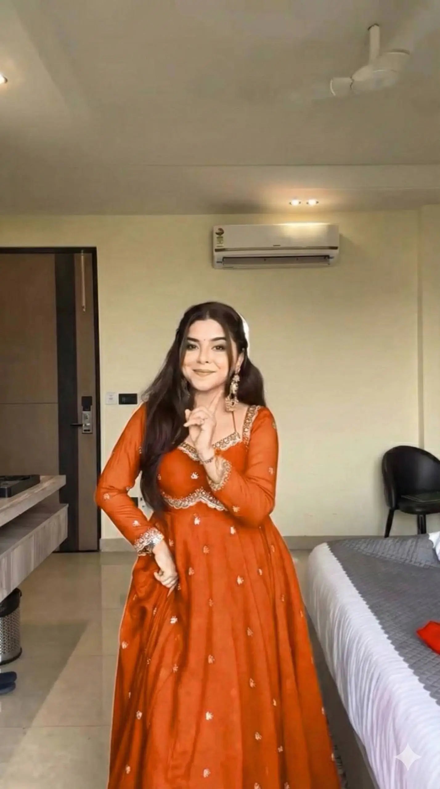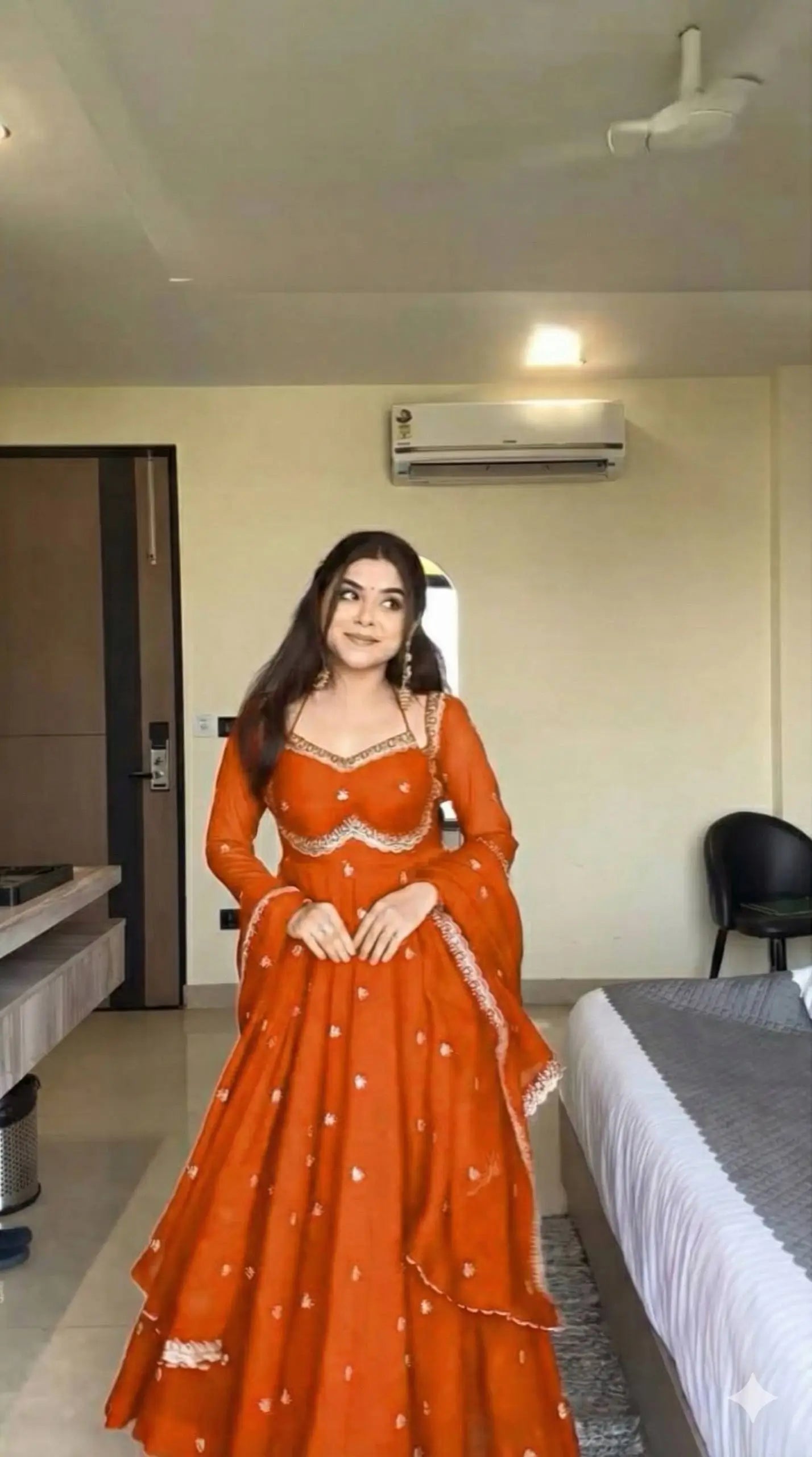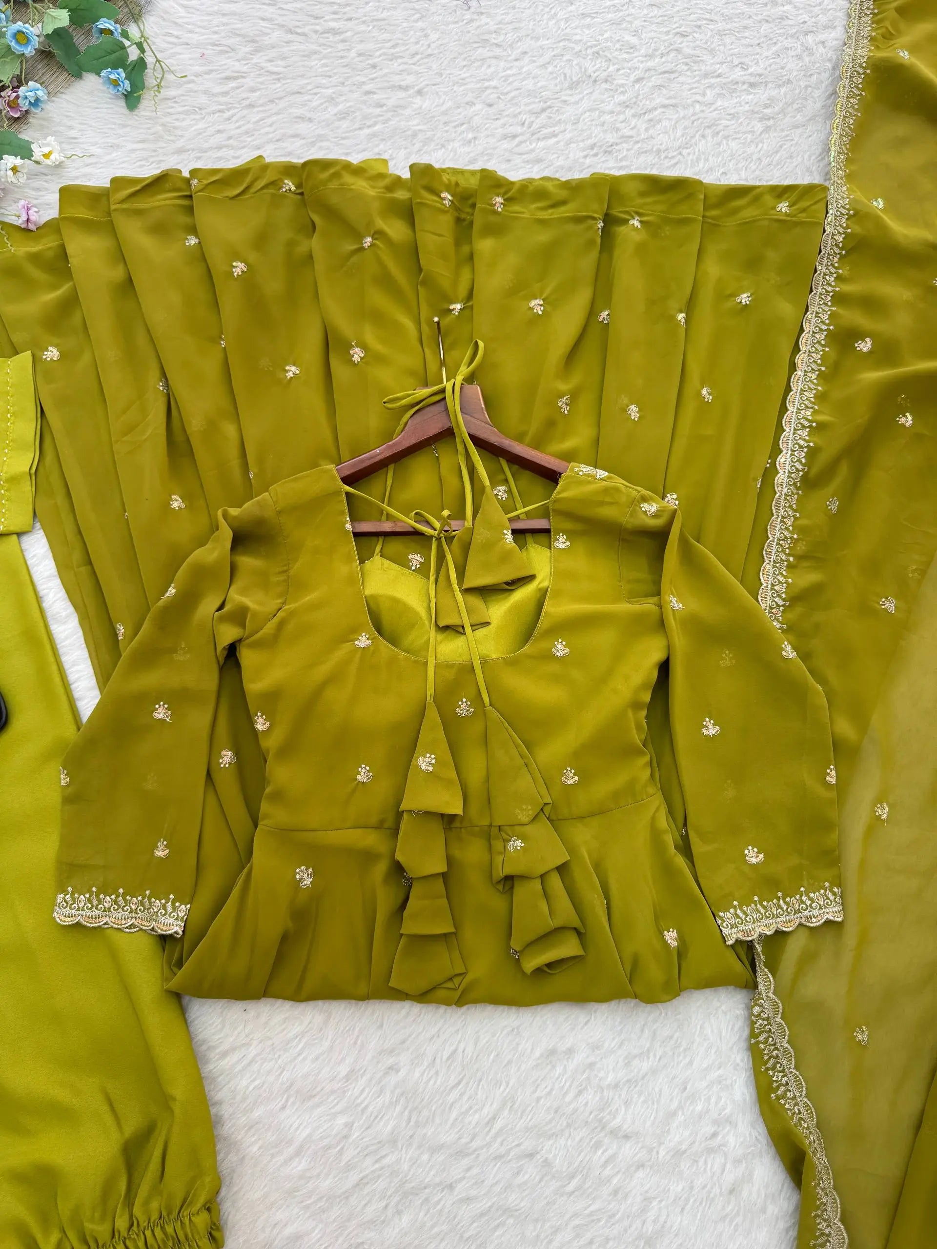 This premium gown set is crafted from heavy fox georgette fabric, offering a rich fall and a luxurious festive sheen. The gown features an elegant Sabiya Chachi style neckline, detailed with rembo sequence embroidery across the neck and sleeves. With a graceful umbrella flare of 4 meters and a comfortable American heavy butter cotton inner, the outfit ensures both style and comfort for long wear.