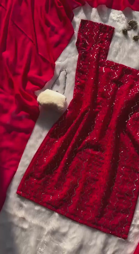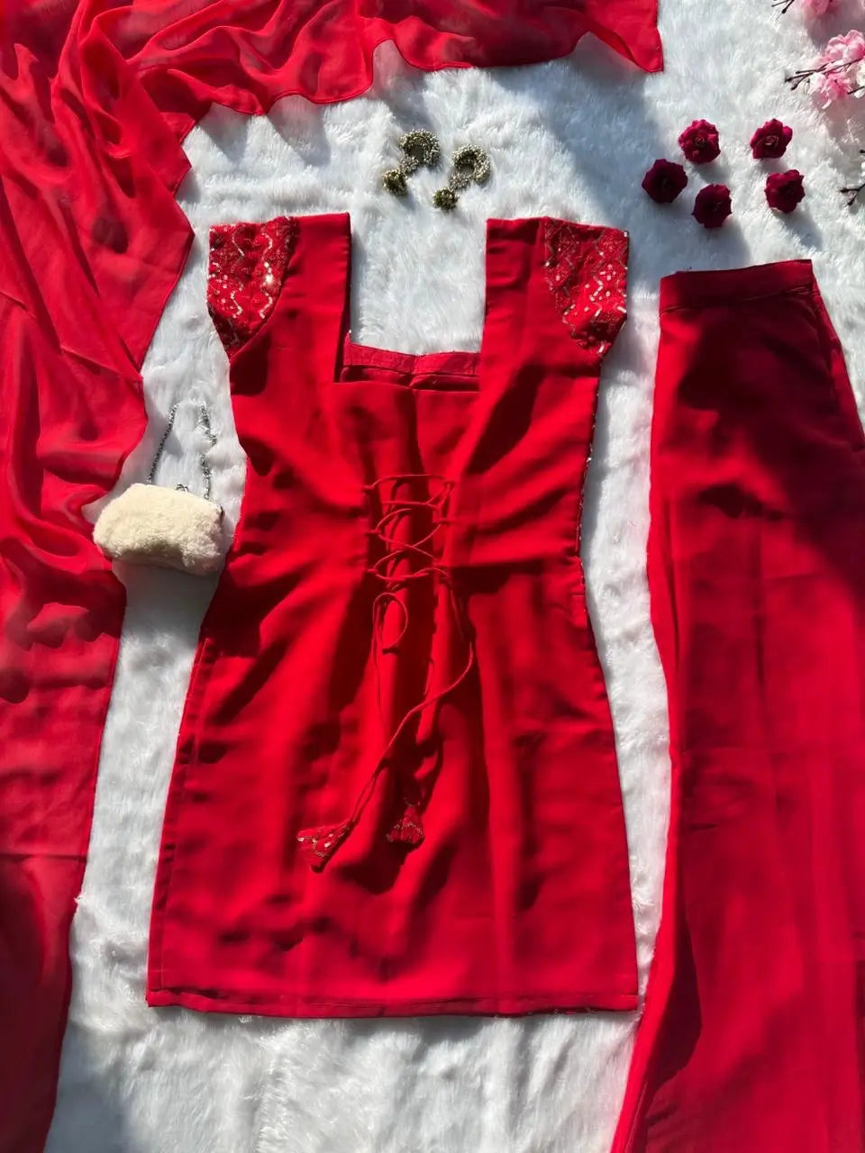 This stylish suit set is crafted from premium faux georgette, offering a soft, flowy drape and a refined modern look. The top features intricate thread and sequin work that adds subtle shimmer and elegance, paired with a soft micro inner for all-day comfort. The coordinating bootcut pant is fully stitched in faux georgette with a micro lining and an elastic waistband for ease of movement. Completing the ensemble is a lightweight plain dupatta that balances the embroidered top beautifully. This ready-to-wear outfit is perfect for festive celebrations, wedding functions, evening events and elegant occasions where comfort and style go hand in hand.