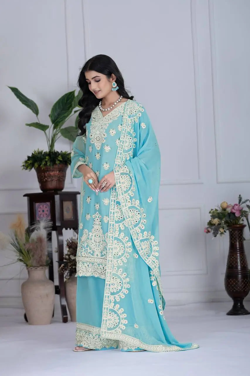 The matching palazzo, also made of heavy faux georgette, is designed with embroidery and real mirror handwork, adding a graceful flow to the outfit. Completing the look is a faux georgette dupatta, finished with full embroidered sequence and mirror handwork, creating a complete festive-ready set. Available in vibrant shades like pink, mustard, and sky blue, this suit is perfect for weddings, festive events, and celebrations.