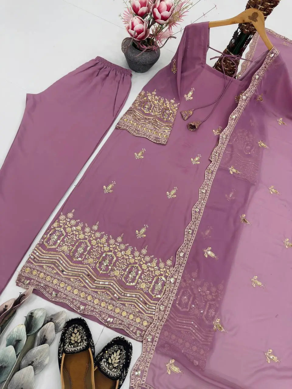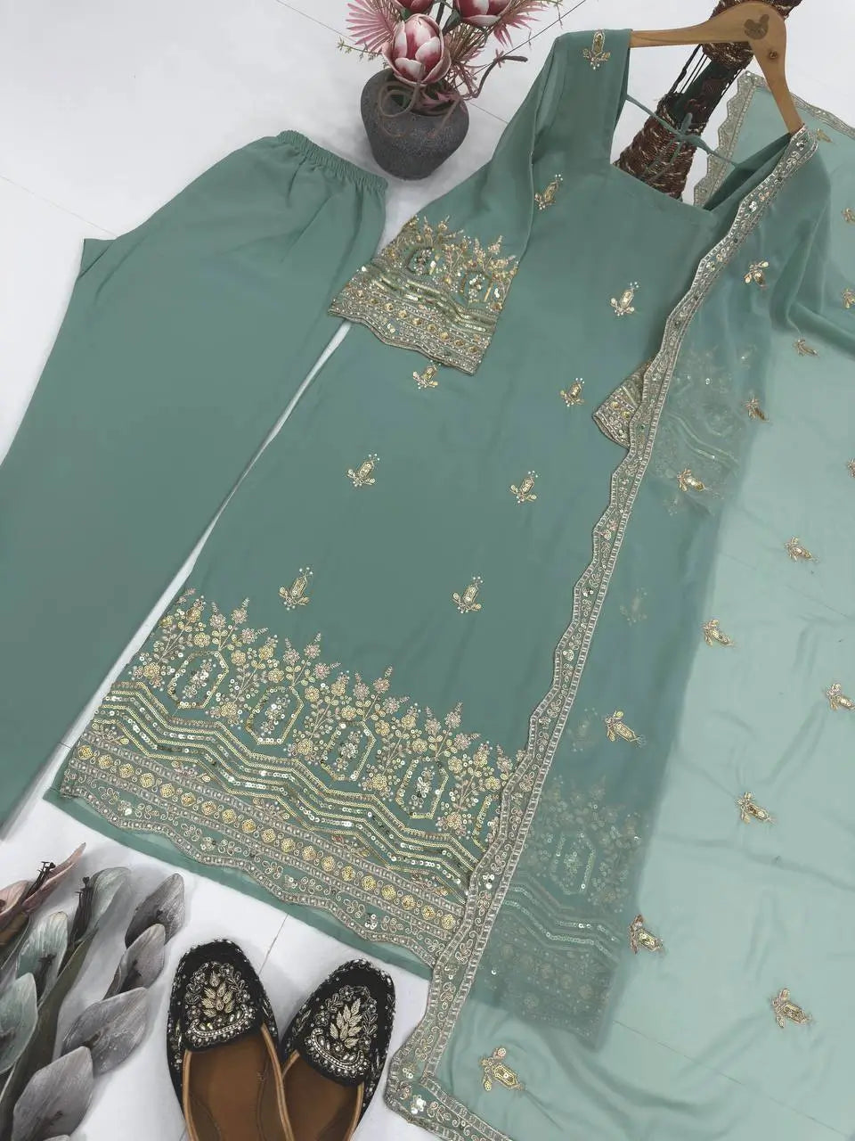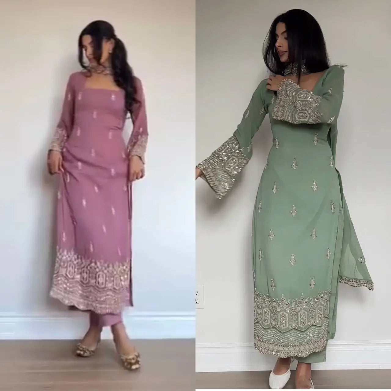 This embroidered georgette straight suit set blends elegance and comfort, crafted from heavy faux georgette with intricate sequence and handwork detailing. The top features a long straight silhouette enriched with refined embroidery, paired with a soft micro cotton inner for smooth and breathable wear. The butter silk bottom offers a clean and comfortable fit, keeping the look minimal and graceful. The set includes a beautifully embroidered faux georgette dupatta that adds a refined finishing touch. This fully stitched ensemble is ideal for festive occasions, celebrations, and elegant day or evening events.