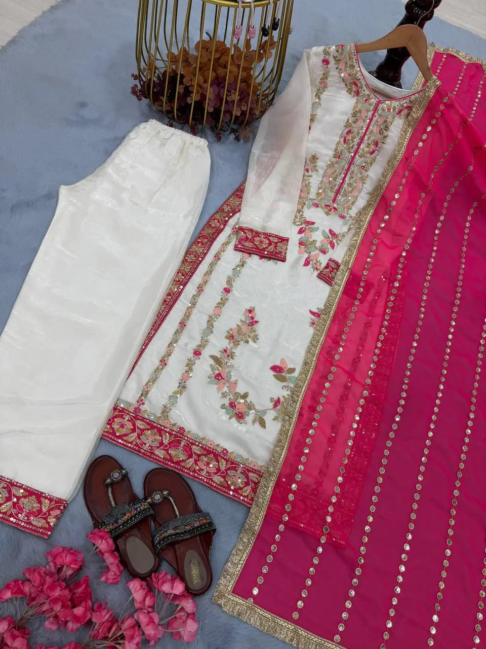 Upgrade your festive wardrobe with this elegant designer palazzo suit set crafted in premium GMY silk. The top features heavy embroidery and sequence work that adds a rich festive glow while maintaining a graceful and refined appearance. Designed with full sleeves and a flattering straight silhouette, it offers a perfect balance of traditional charm and modern styling.