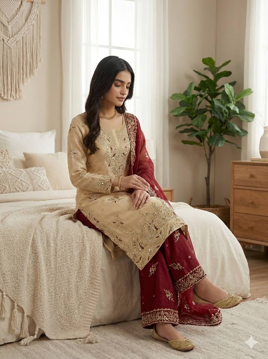 The top is paired with a matching GMY silk palazzo adorned with coordinated embroidery and an elasticated waist for comfort and ease of wear. Completing the set is a beautifully embroidered GMY silk dupatta that enhances the overall look with effortless elegance. Fully stitched and ready to wear, this ensemble is ideal for festive celebrations, family functions, and special occasions where comfort meets style.