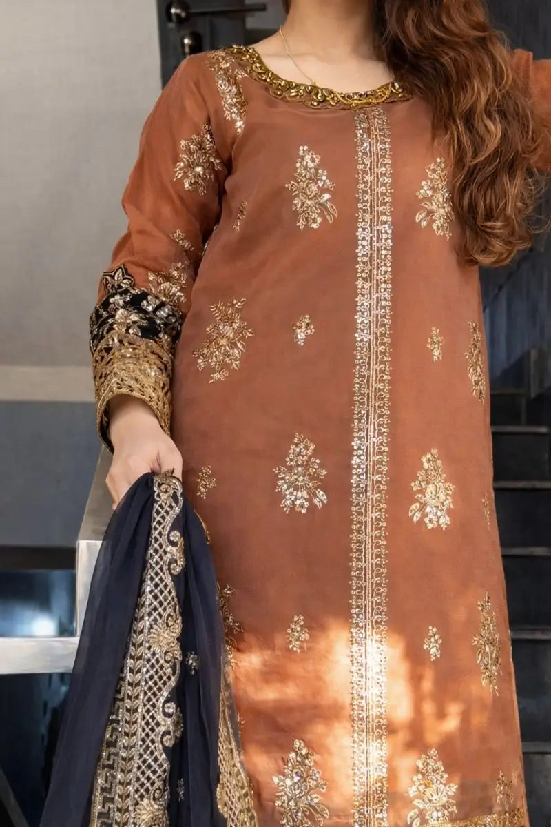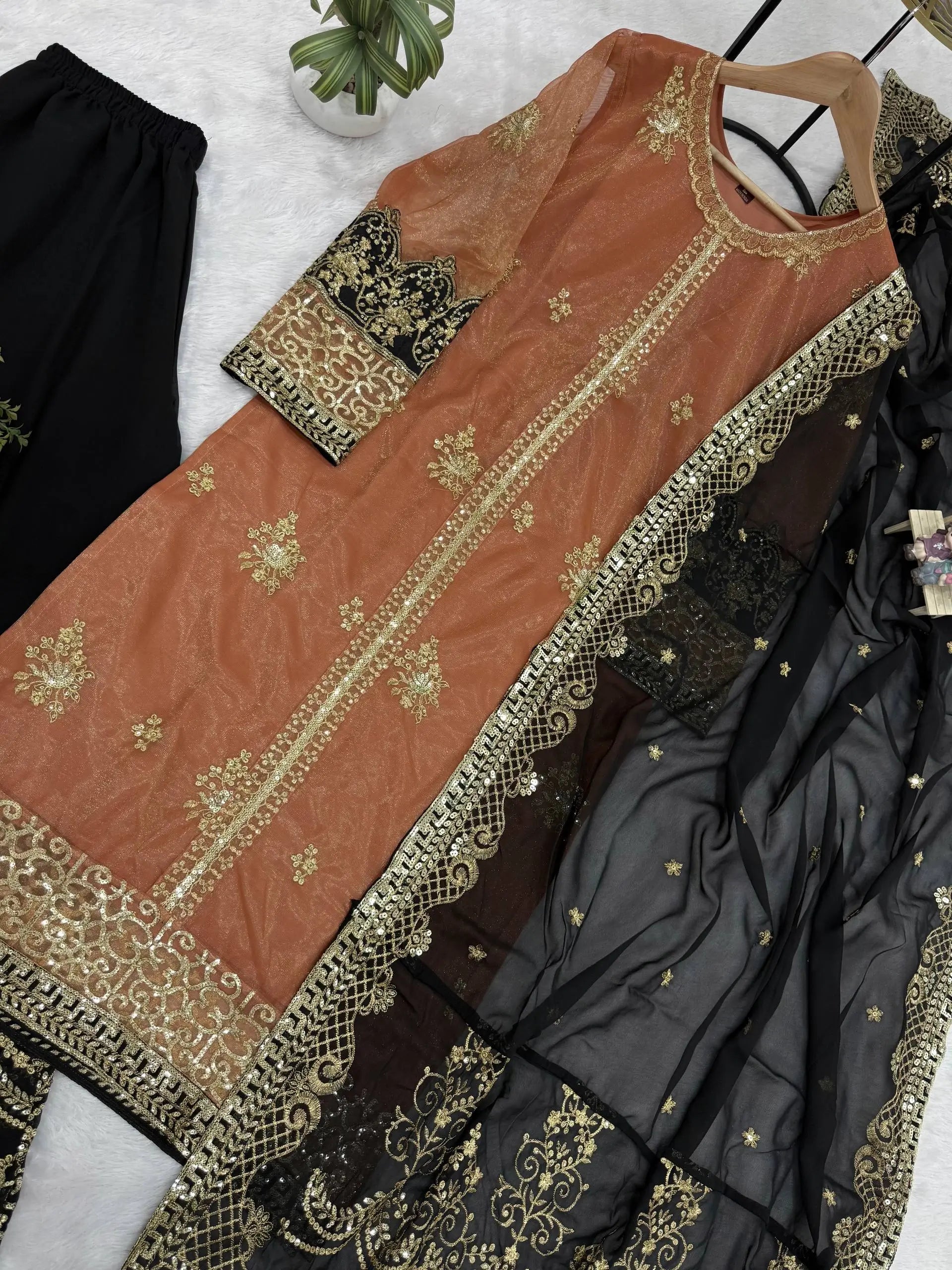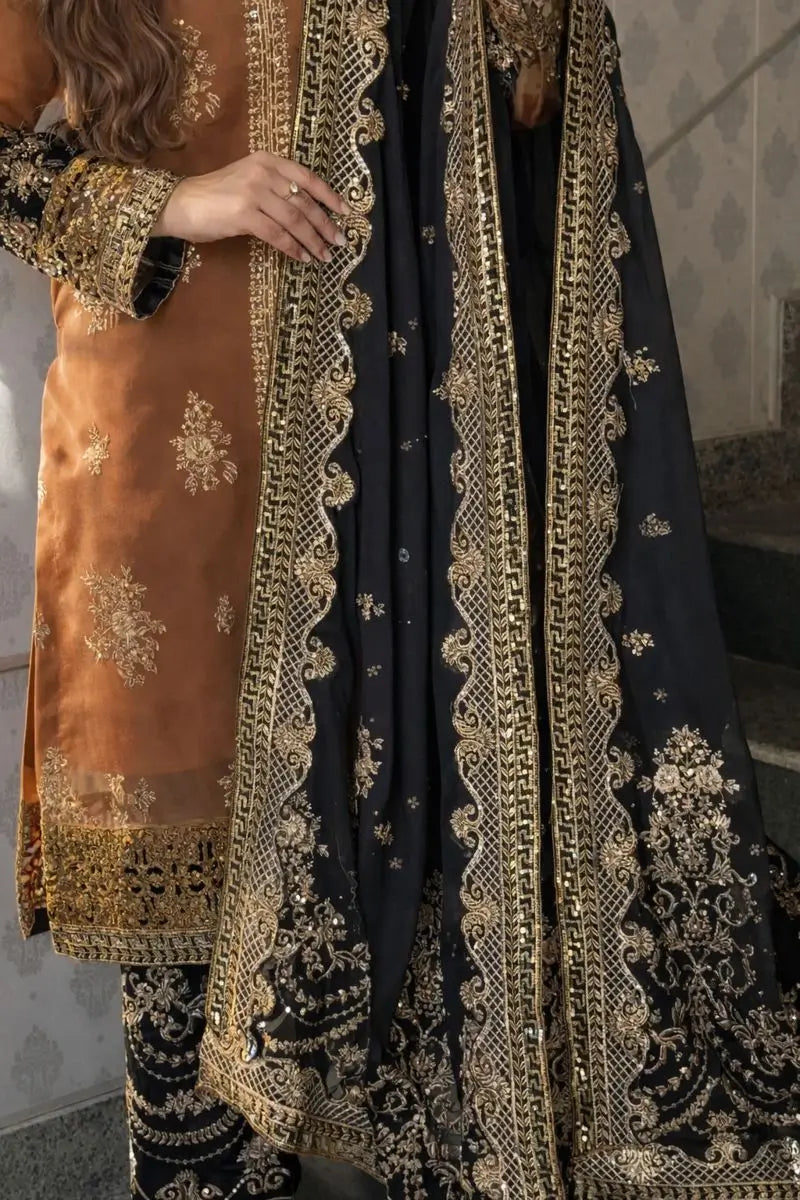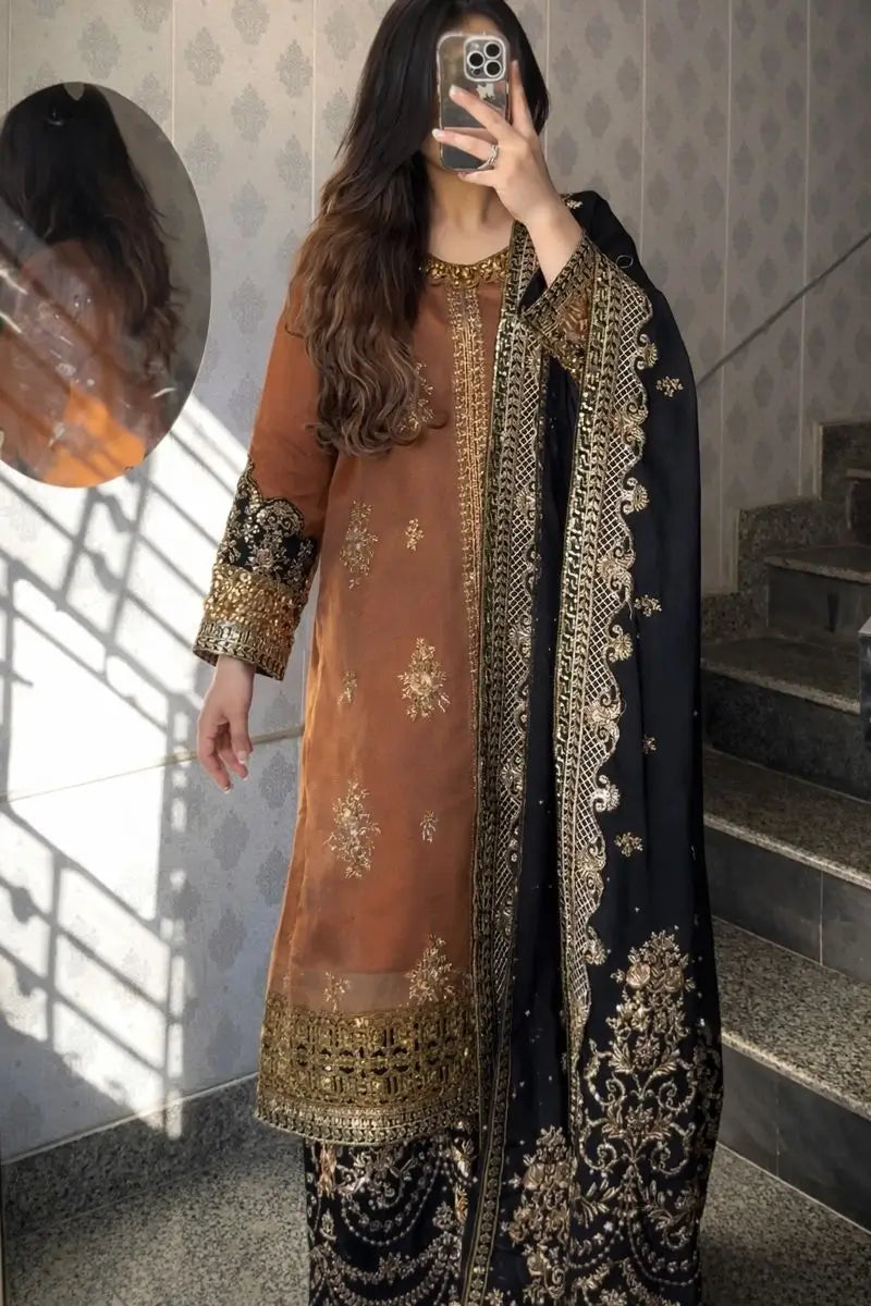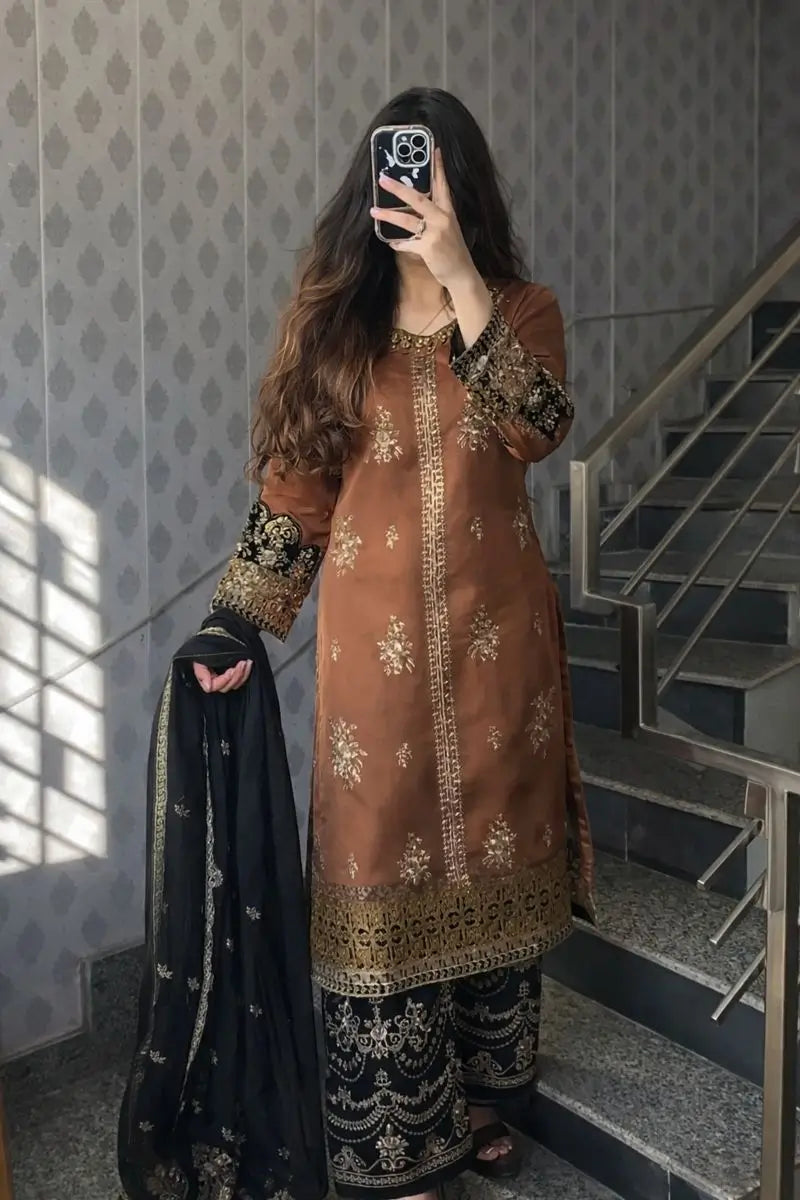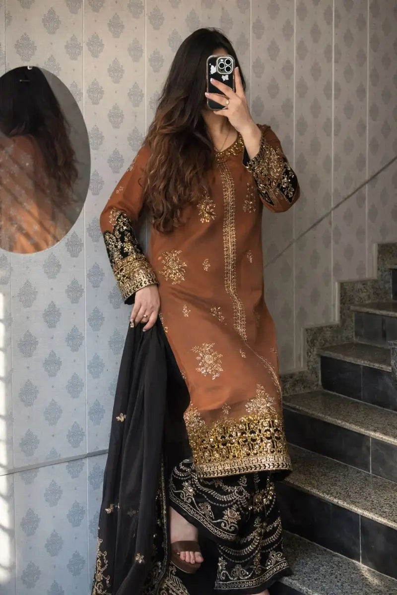 Completing the look is a matching black faux georgette dupatta, detailed with coordinated golden embroidery and a graceful border. The contrast of black and rust brown adds depth, elegance, and visual richness to the outfit.