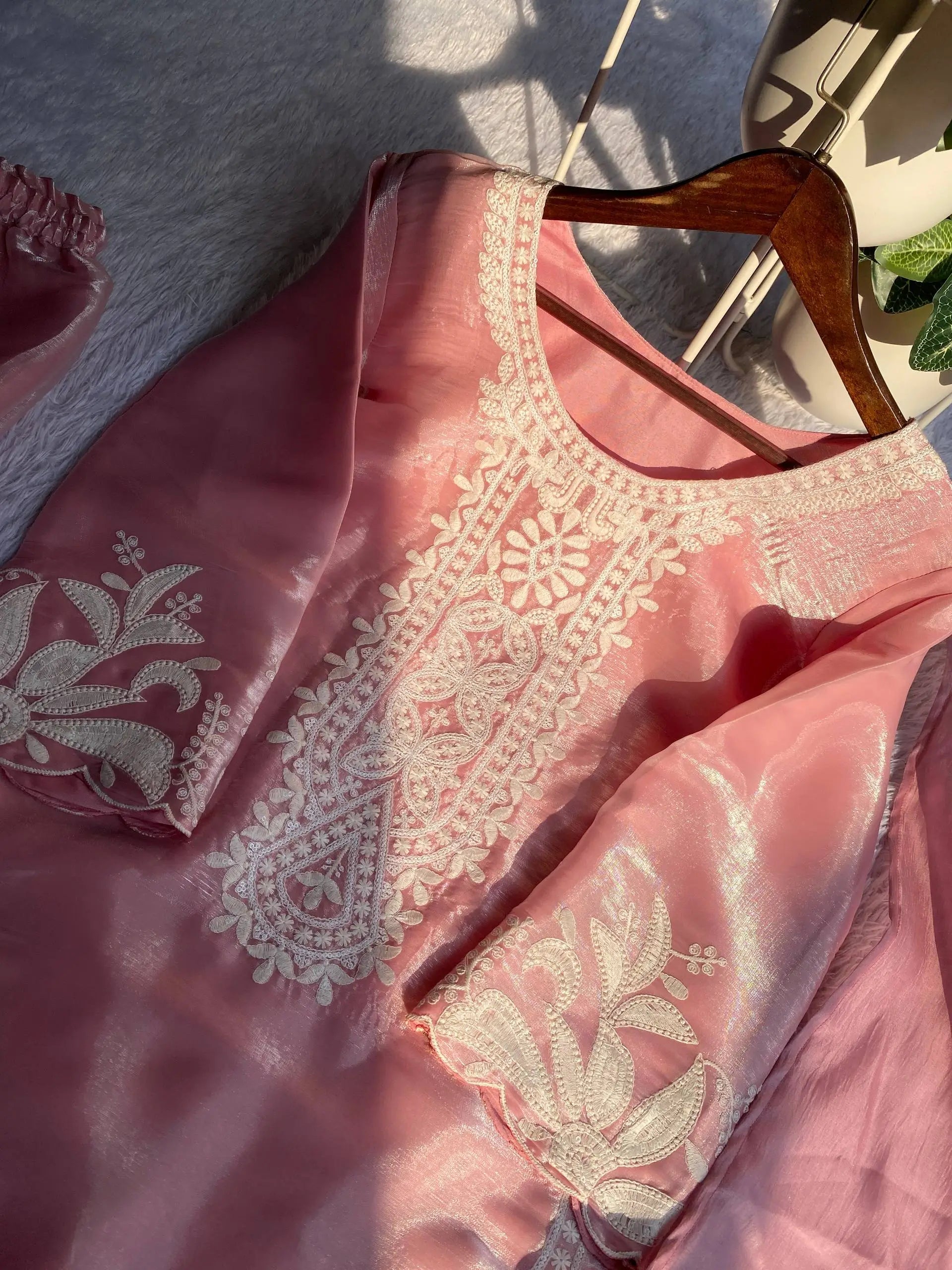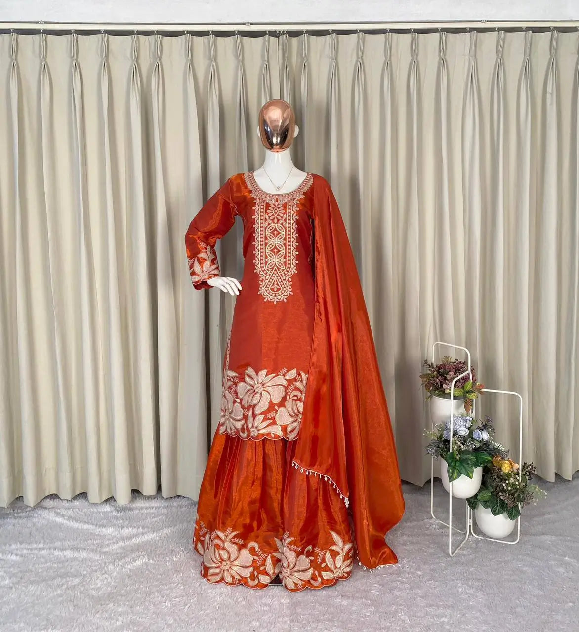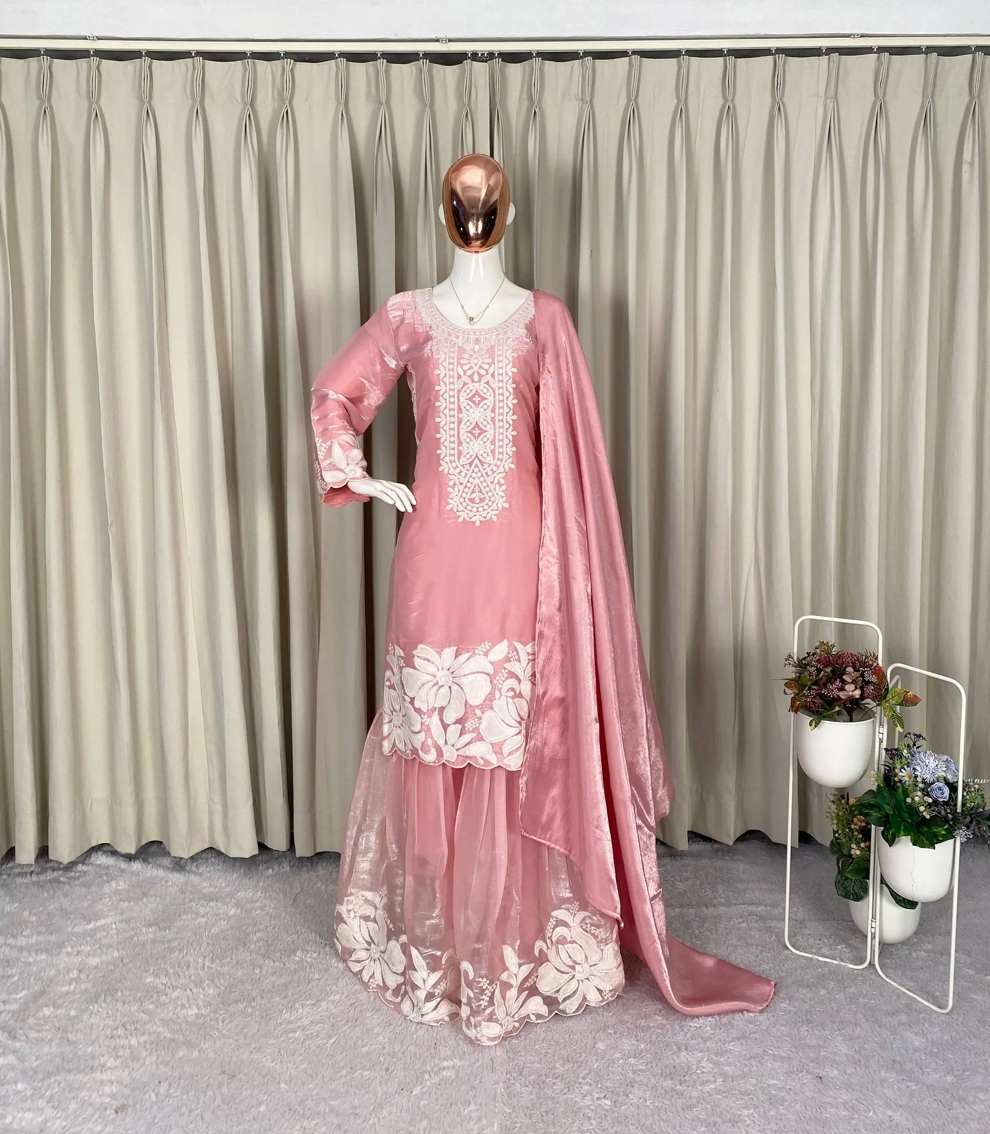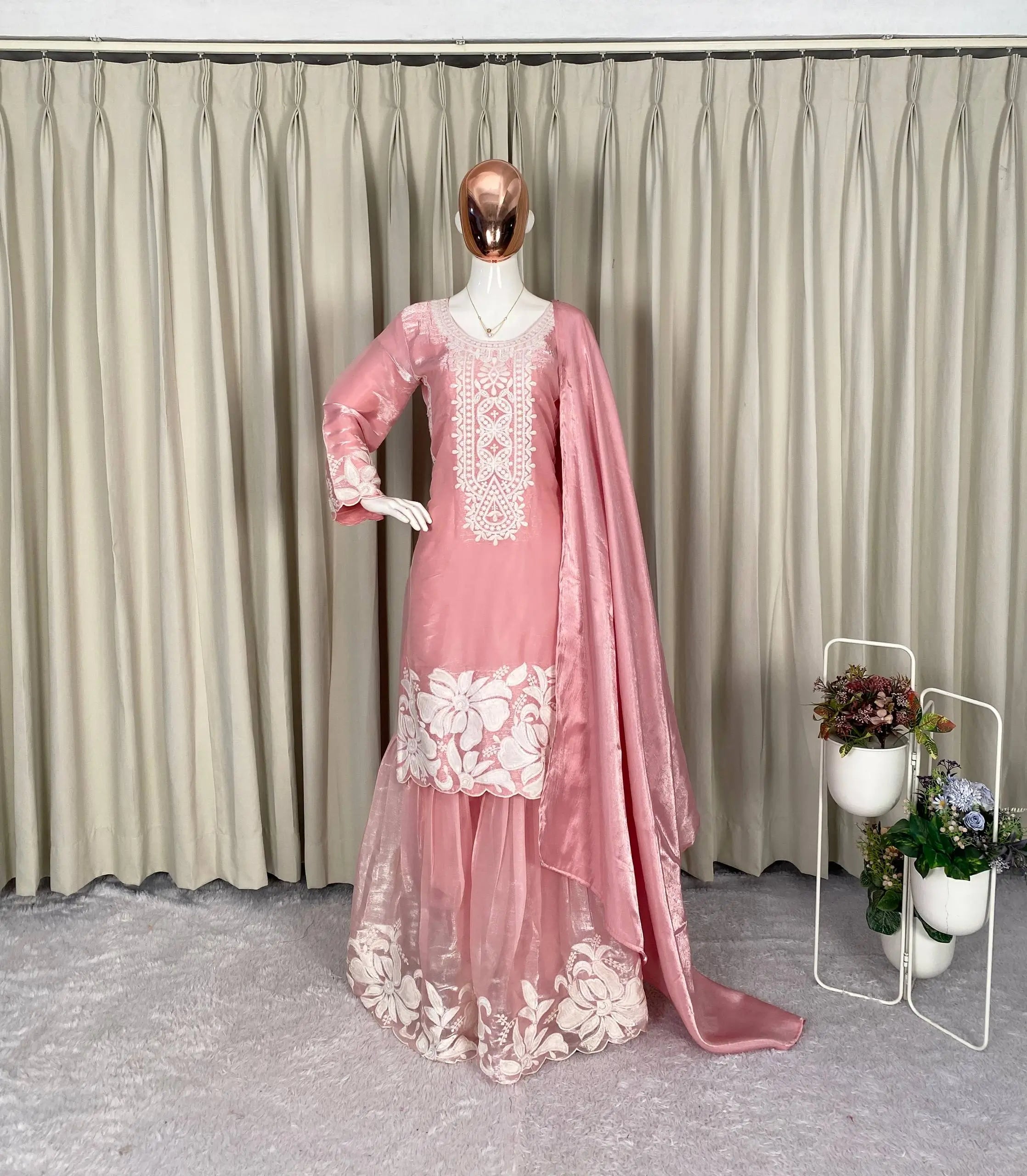 Grace meets elegance in this beautifully crafted kurti sharara set made from soft organza silk. The kurti features delicate sequin embroidery that adds subtle shimmer while maintaining a refined and sophisticated look. Designed with a comfortable micro cotton lining, it ensures ease of wear throughout long occasions. The matching sharara is fully stitched and flows gracefully with embroidered detailing, creating a balanced festive silhouette. Completing the set is a coordinated organza silk dupatta enhanced with kodi lace work, making this ensemble perfect for festive gatherings, celebrations, and elegant day events.
