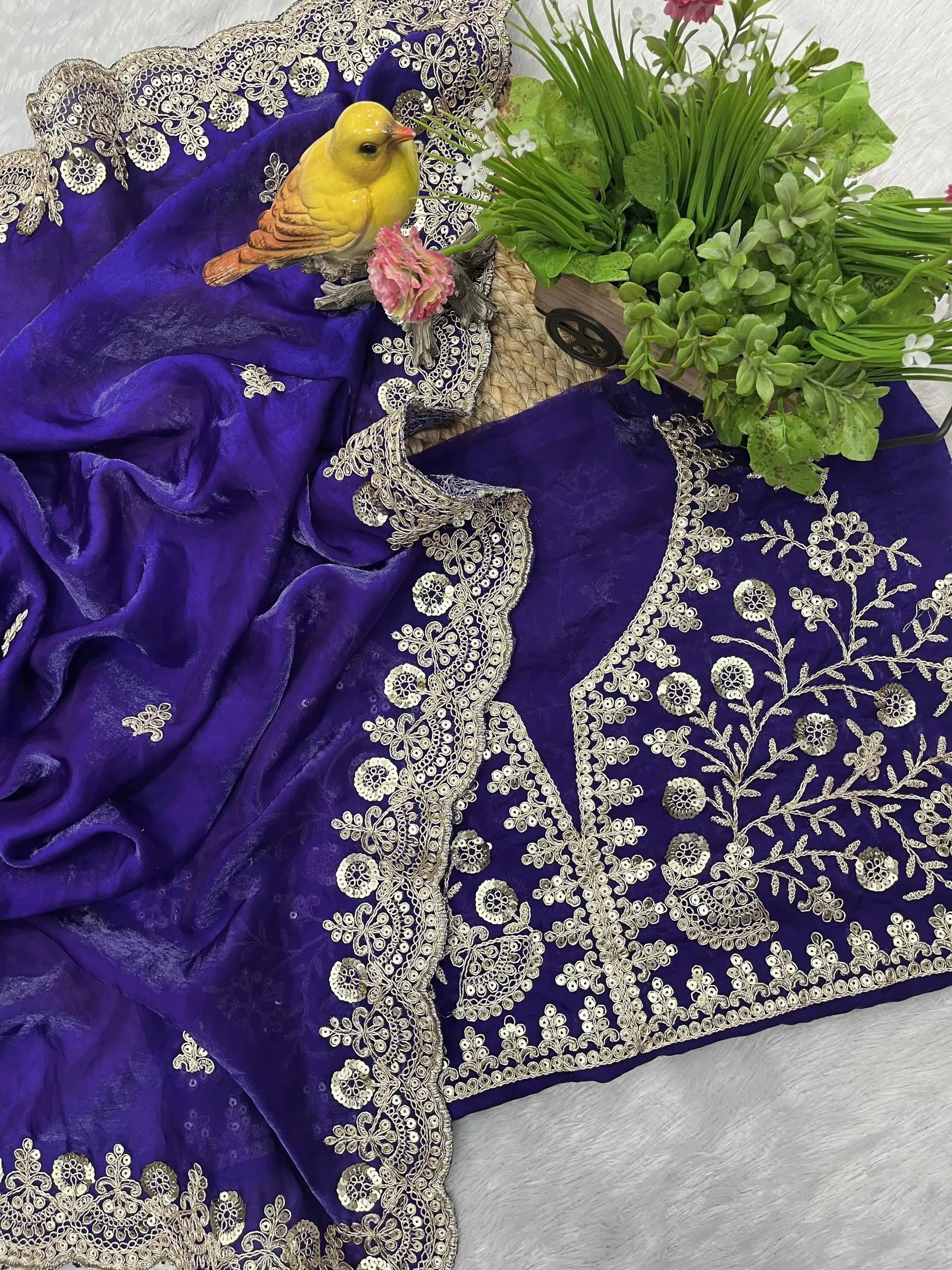 This elegant saree is crafted from premium Frendy satin silk, known for its smooth texture and refined drape. The saree features intricate 5mm sequins, zari dori embroidery, and detailed cutwork along the border, giving it a rich and festive appeal. Sequins butti motifs are delicately placed across the pallu and body for added grace. The accompanying blouse, also in satin silk, comes unstitched and includes matching sequins and zari embroidery on the front and sleeves, allowing you to tailor it to your preferred fit. Perfect for weddings, receptions, festive celebrations, and special occasions, this saree offers a luxurious and timeless look.