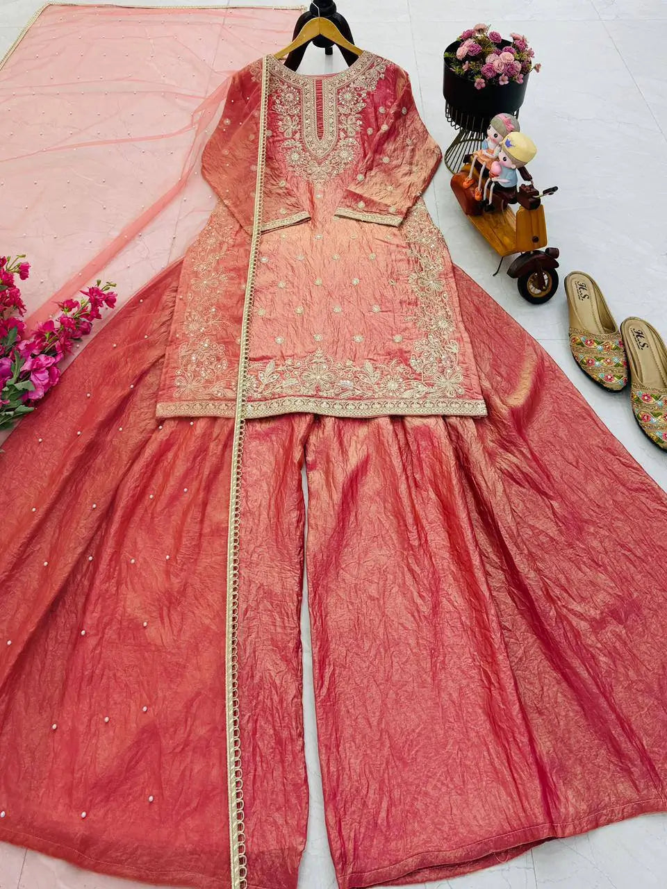 This elegant kurta palazzo set is crafted from premium Fandy silk, offering a smooth texture and graceful fall ideal for festive and special occasions. The kurta is beautifully enhanced with detailed embroidery combined with sequence and diamond hand work, creating a refined and luxurious ethnic appeal. Designed with a classic round neckline and full sleeves, the fully stitched kurta delivers both comfort and sophistication.