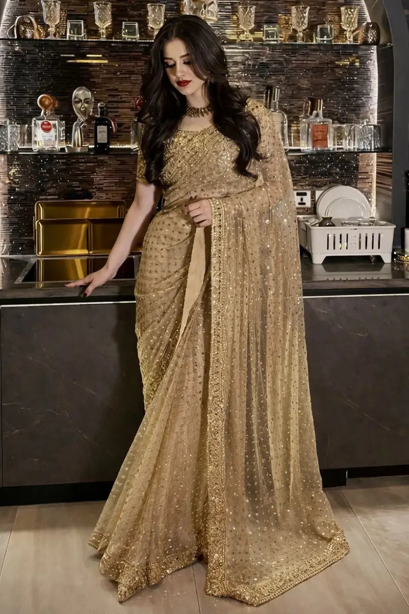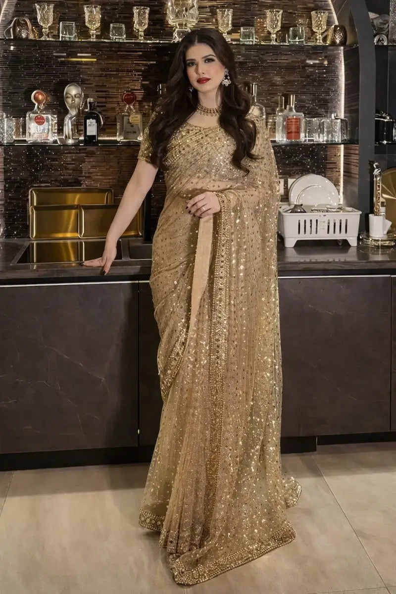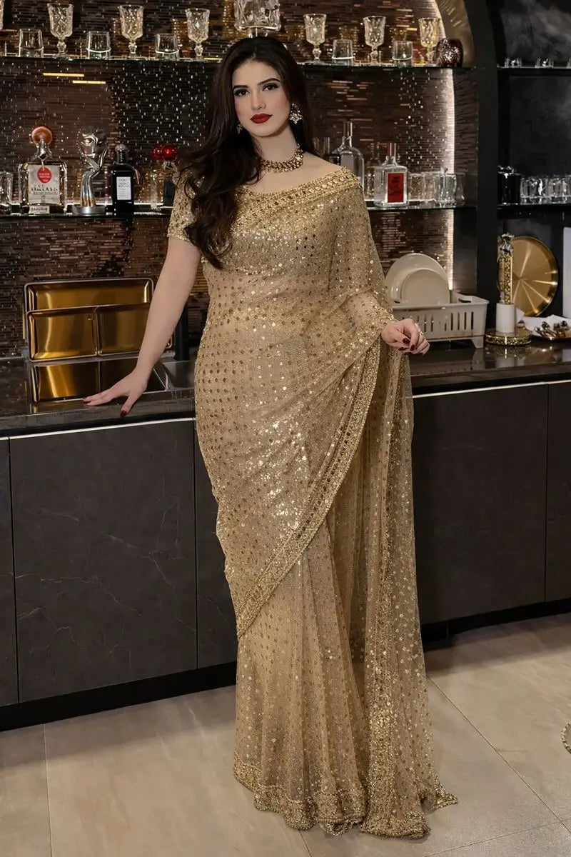 Add refined elegance to your festive and occasion wear collection with this premium soft net saree designed for a graceful and luxurious look. Crafted in butterfly soft net fabric, the saree is beautifully embellished with rich zari work, intricate embroidery, shimmering sequins, and authentic real mirror work that enhances its overall appeal. The lightweight net drape offers a soft fall and elegant movement, making it comfortable for long wear. Paired with an unstitched matching blouse in the same premium butterfly soft net, the blouse features heavy embroidery, zari, sequins, and real mirror work on both front and back, allowing you to customize the fit and style as desired. Finished with showroom level detailing, this saree is ideal for weddings, festive occasions, and special celebrations.