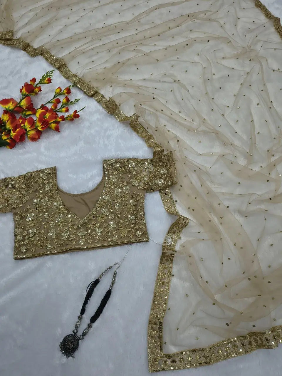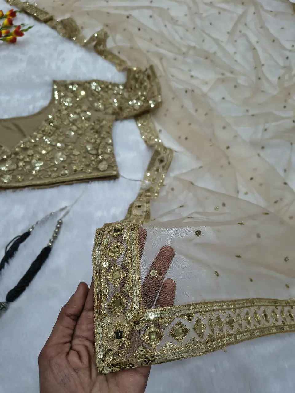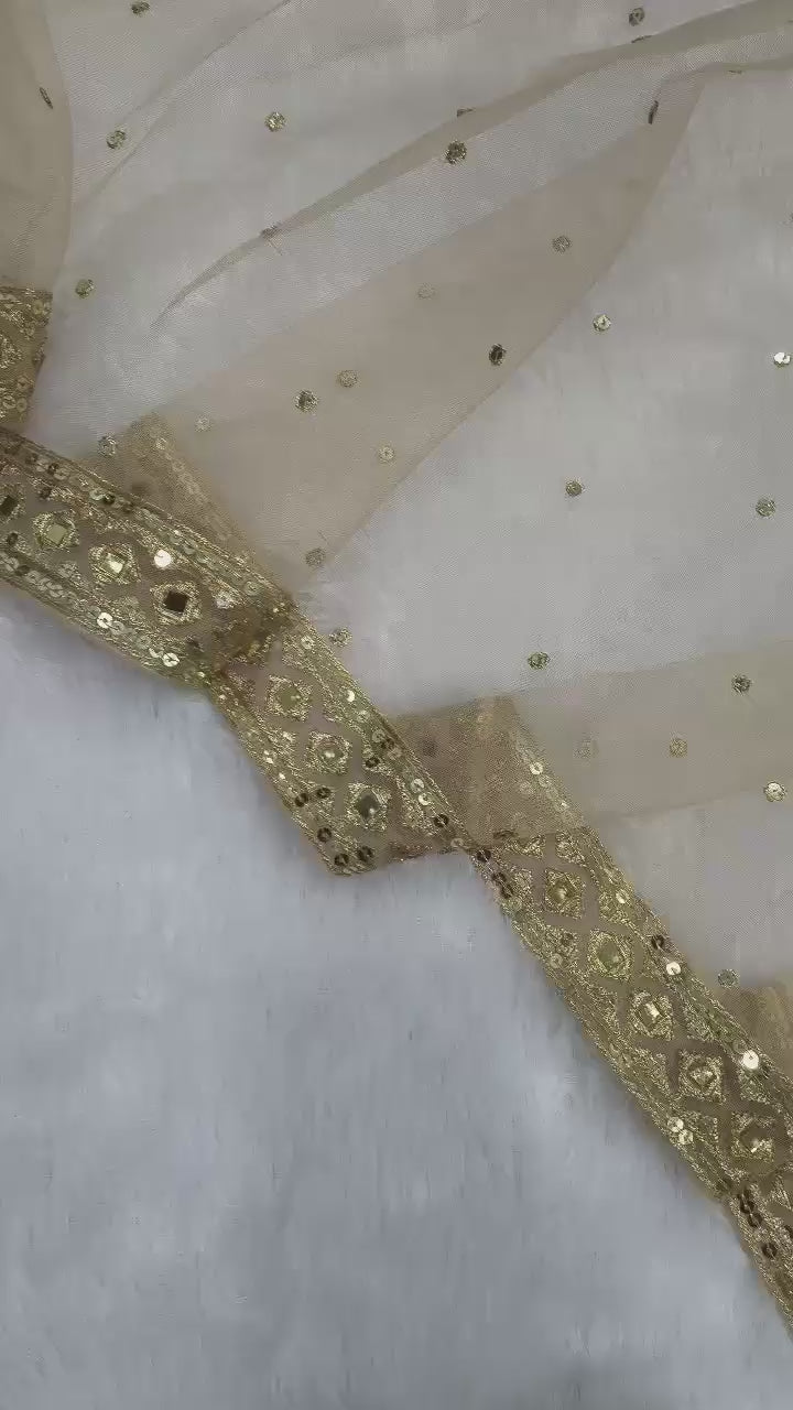 Detailed zari work, embroidery, sequins, and real mirror work