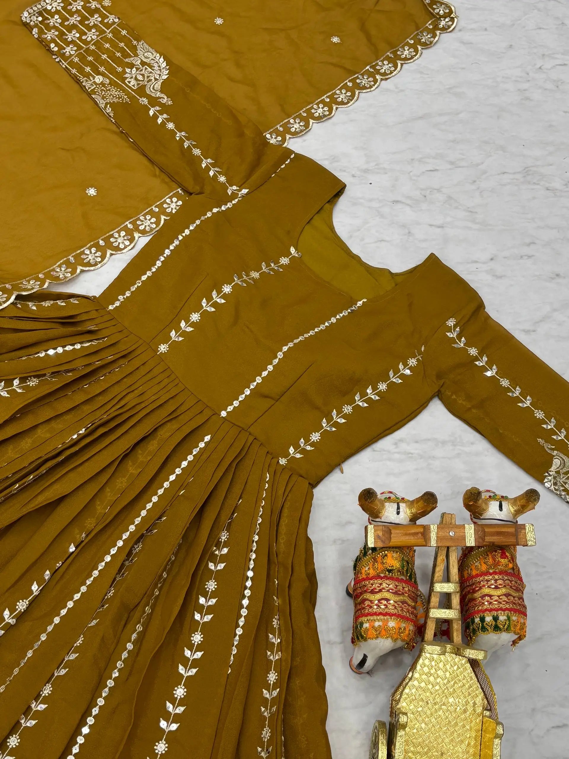 This elegant gown set is crafted from soft star georgette, giving it a smooth drape and a refined festive look. The gown features heavy 7 mm sequin embroidery placed in clean vertical lines that create a flattering and elongated silhouette. A micro cotton inner ensures comfort throughout the day. With a three and a half meter flair, the gown flows beautifully with movement. The matching dupatta is also made from star georgette and finished with coordinated embroidery, completing the outfit with a graceful touch. This set is ideal for festive celebrations, pre-wedding events, and evening functions.